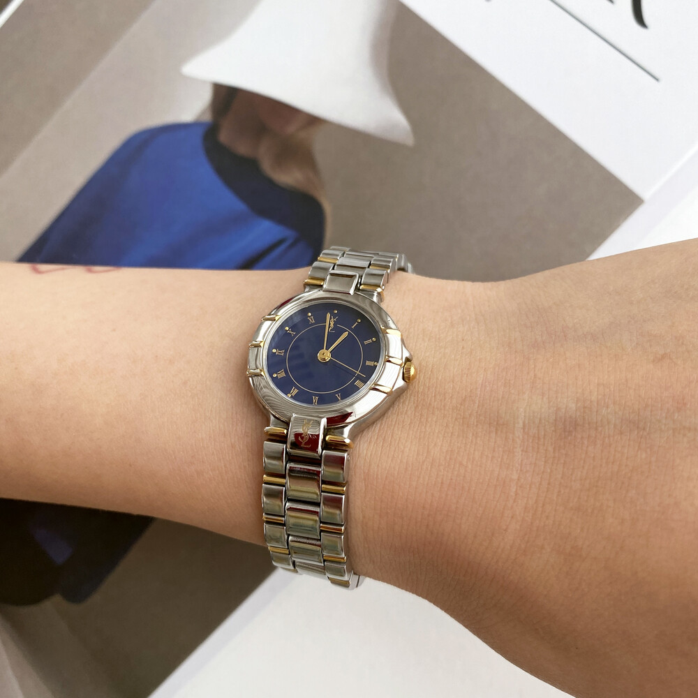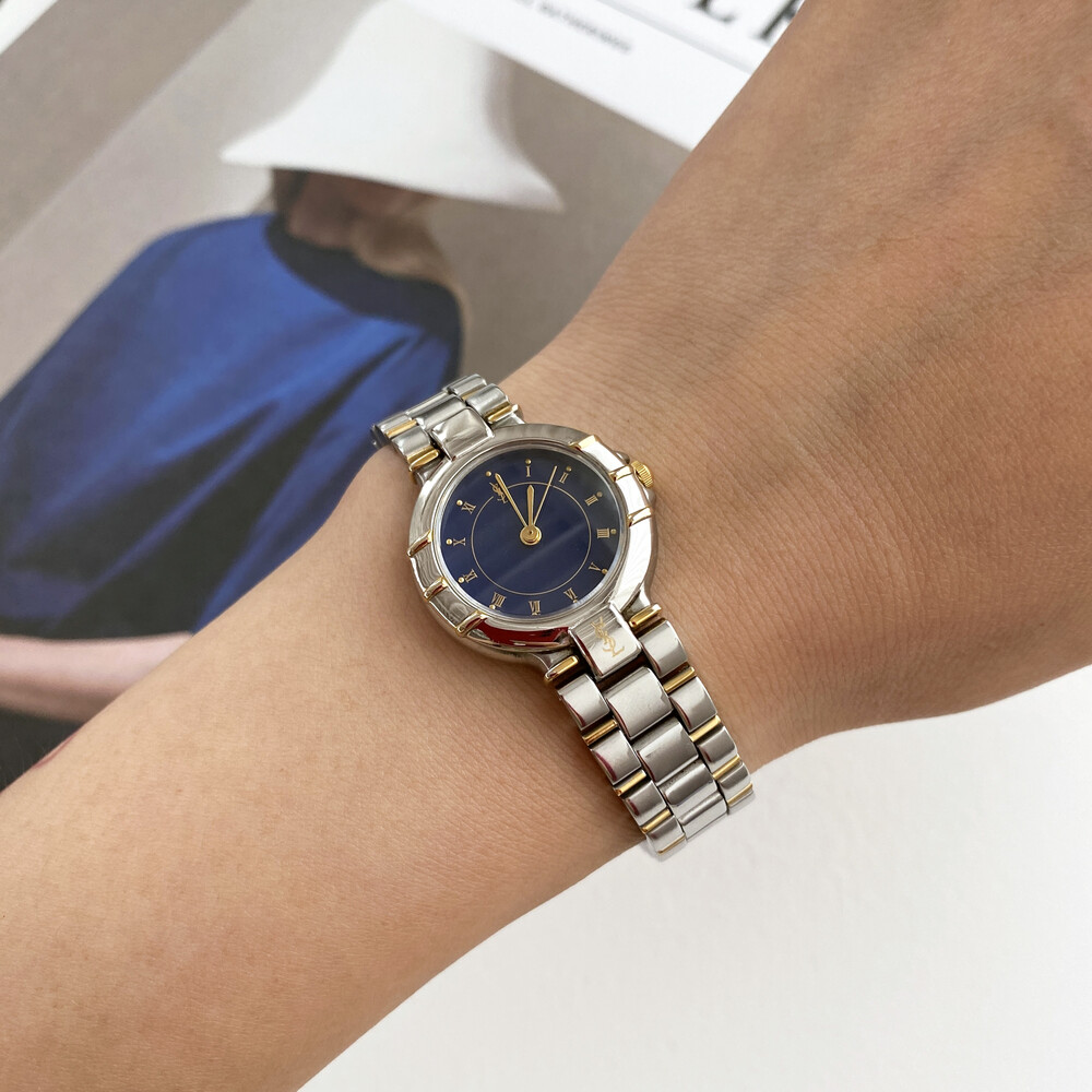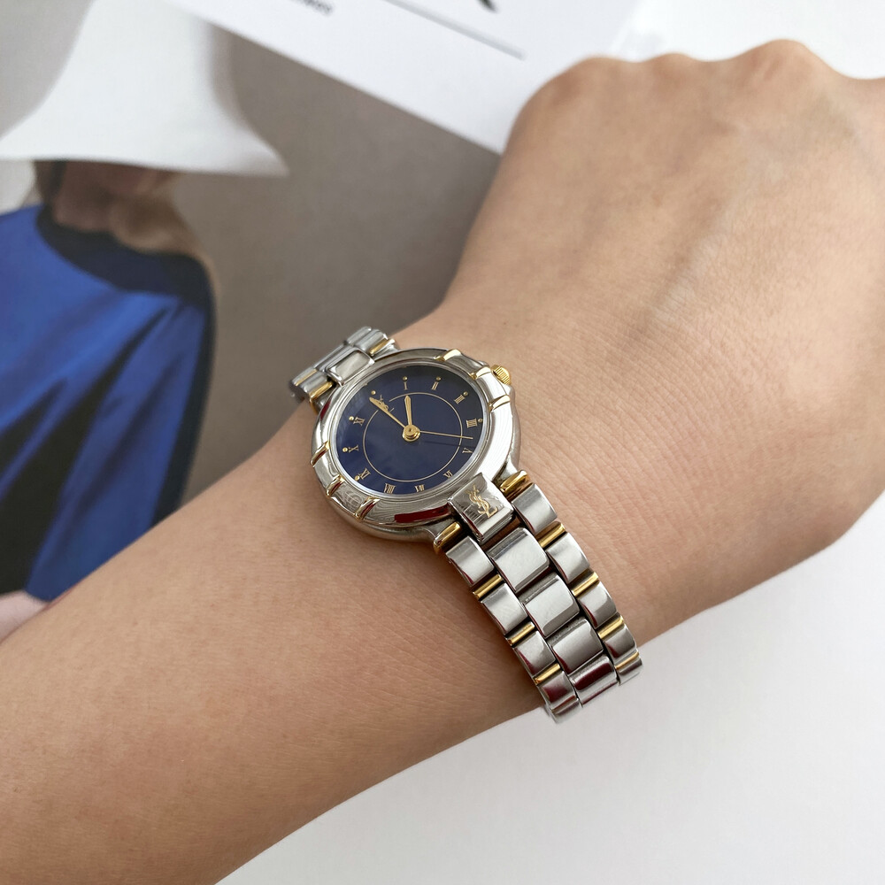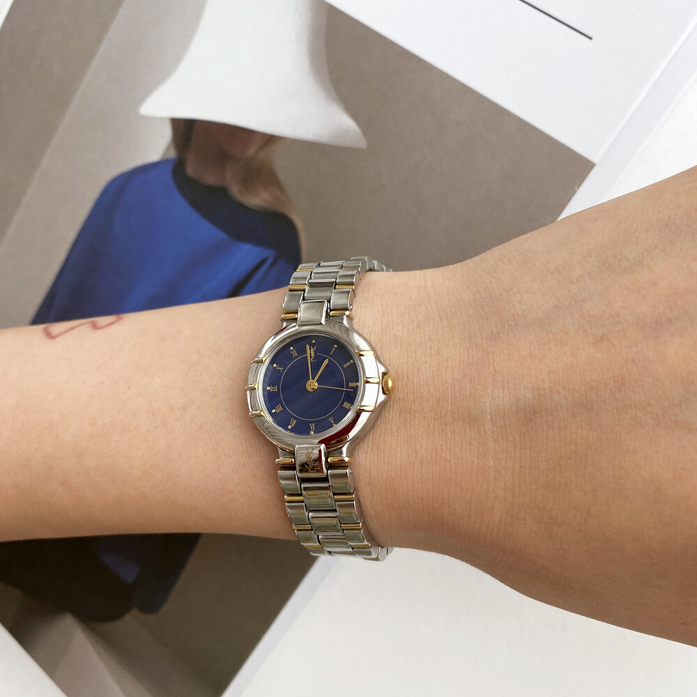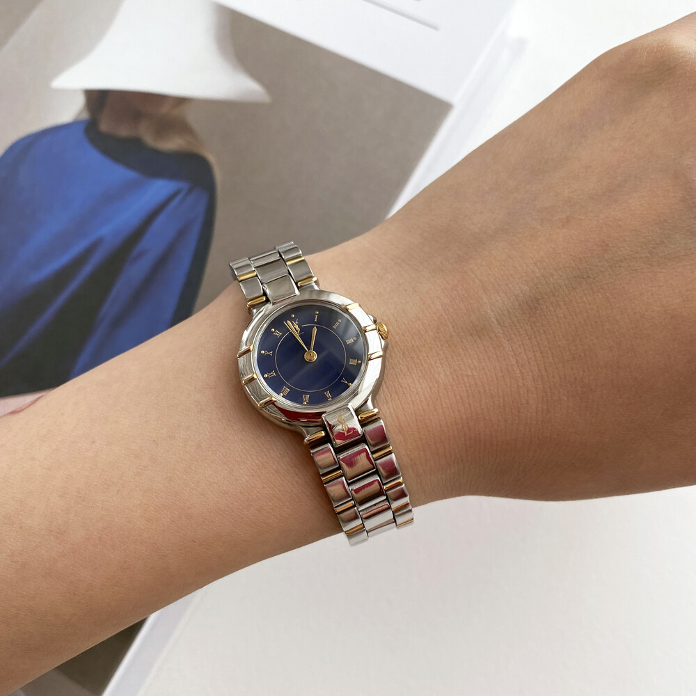 매력적인 투톤 케이스와 밤하늘을 닮은 블루 다이얼 위를 장식하는 생로랑 로고가