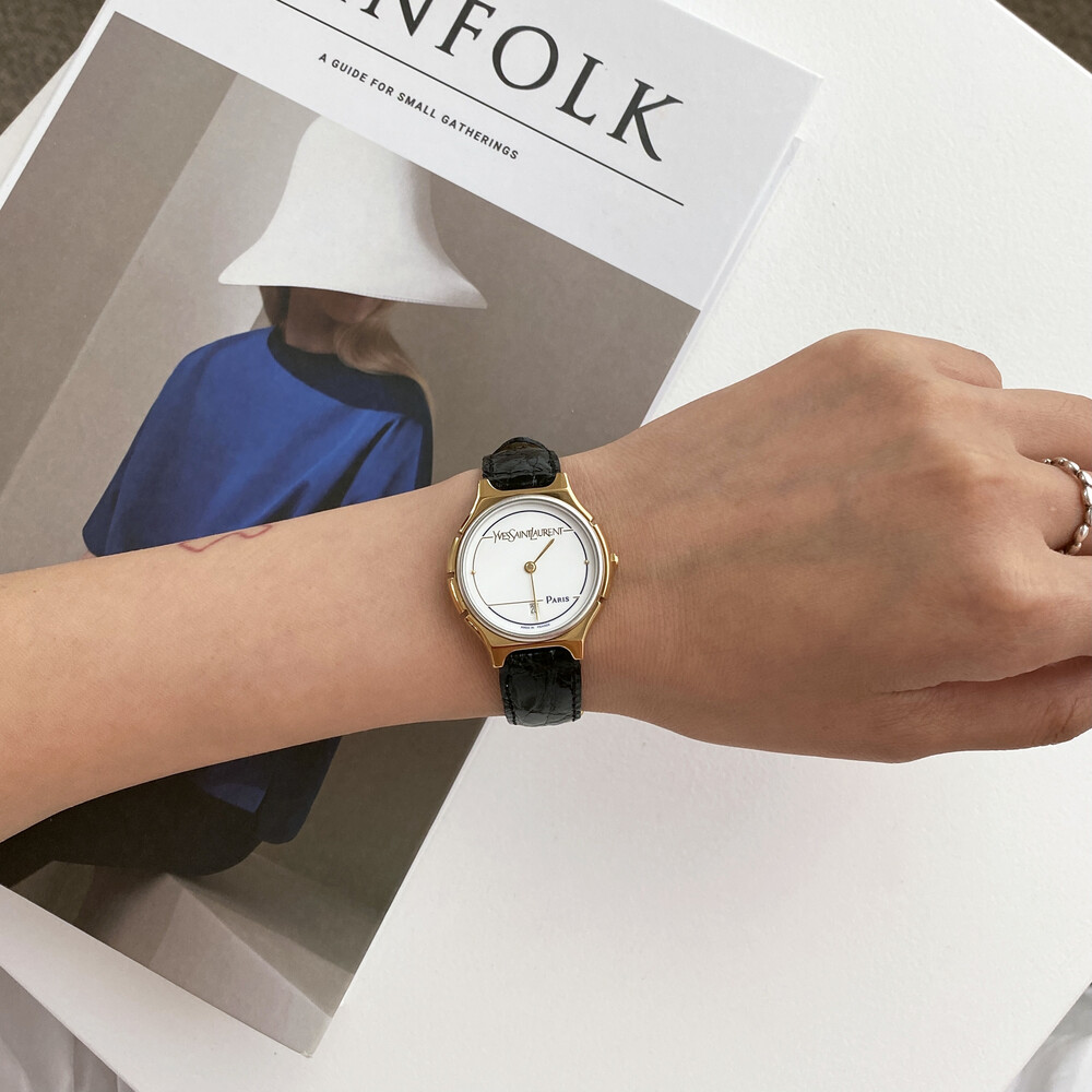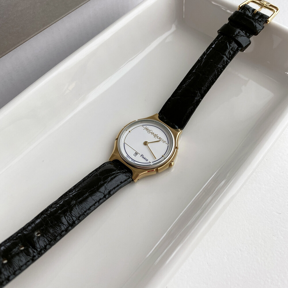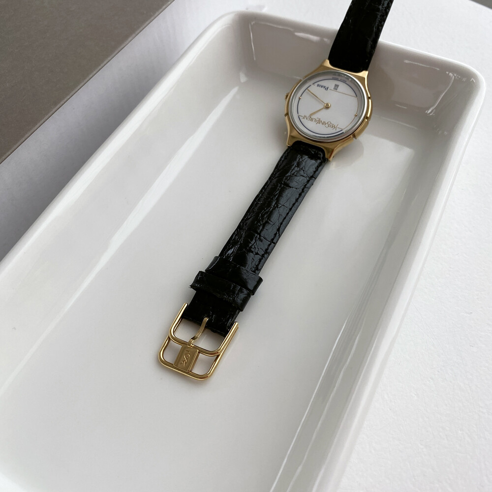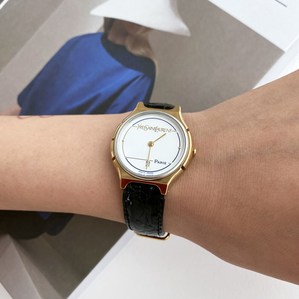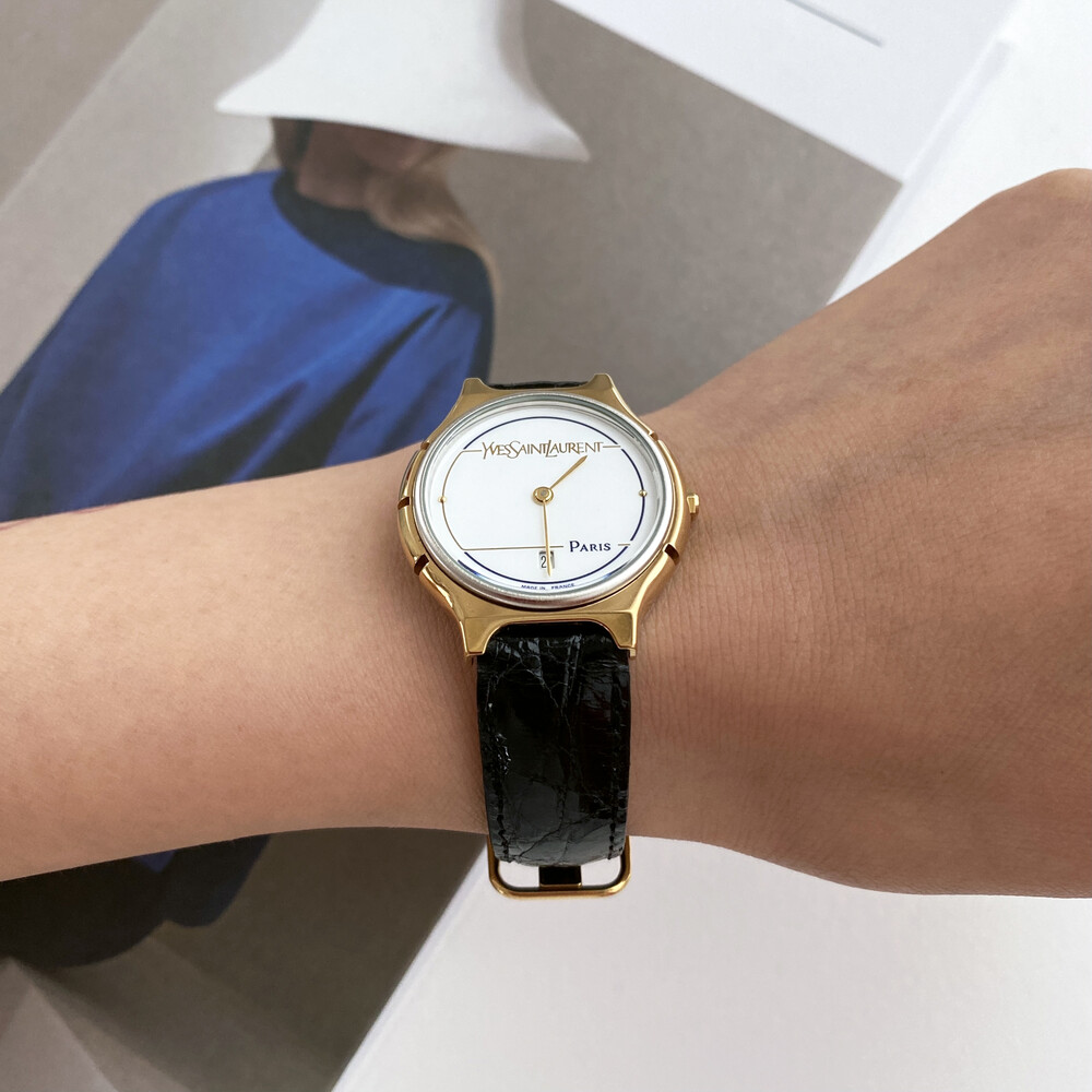 화이트 다이얼 위를 장식하는 입생로랑 로고가 매력적인 모델입니다.