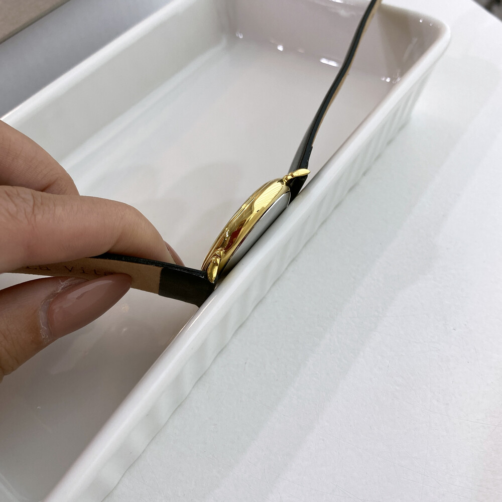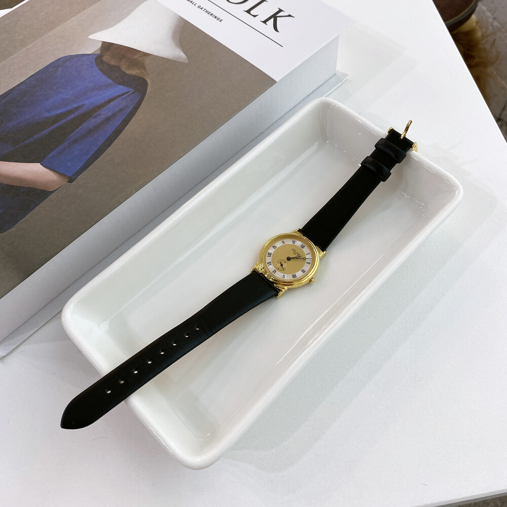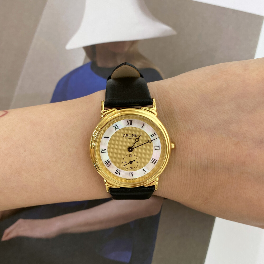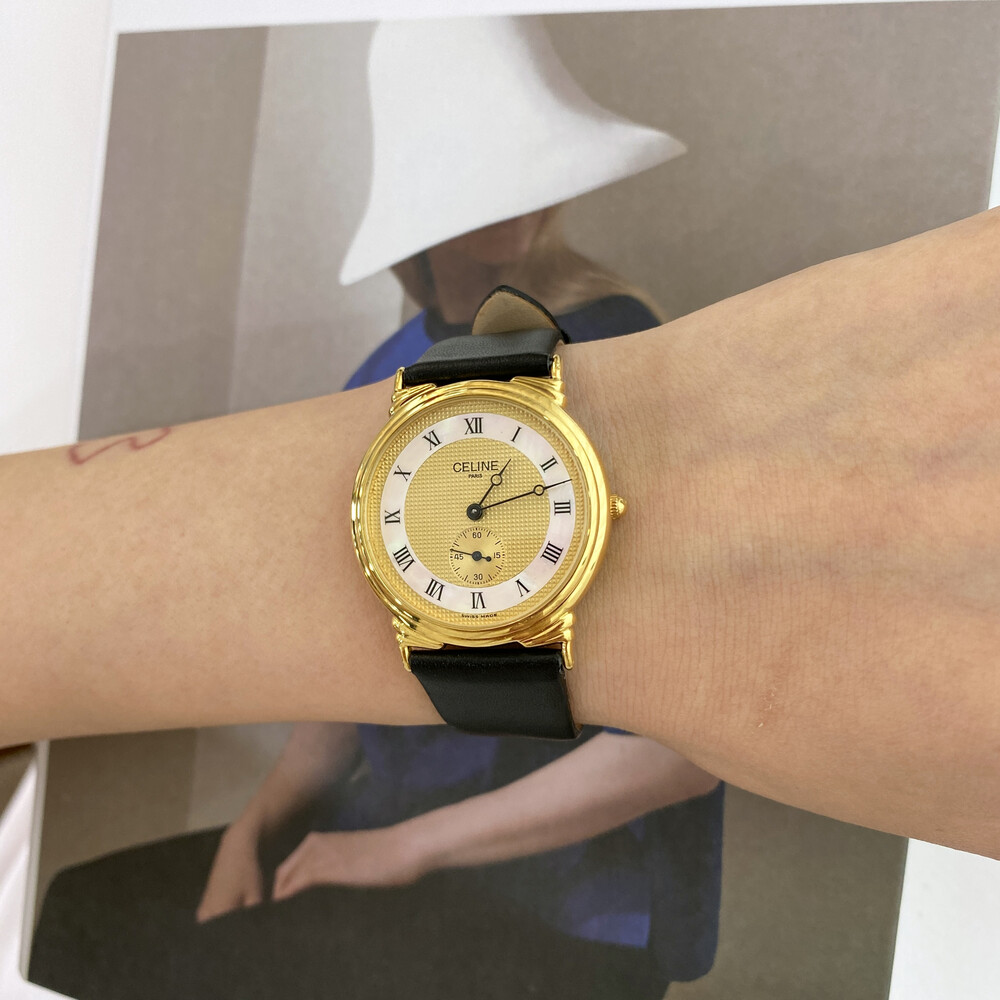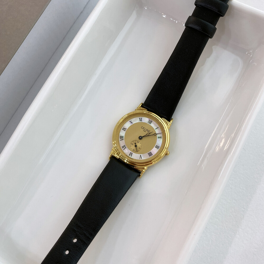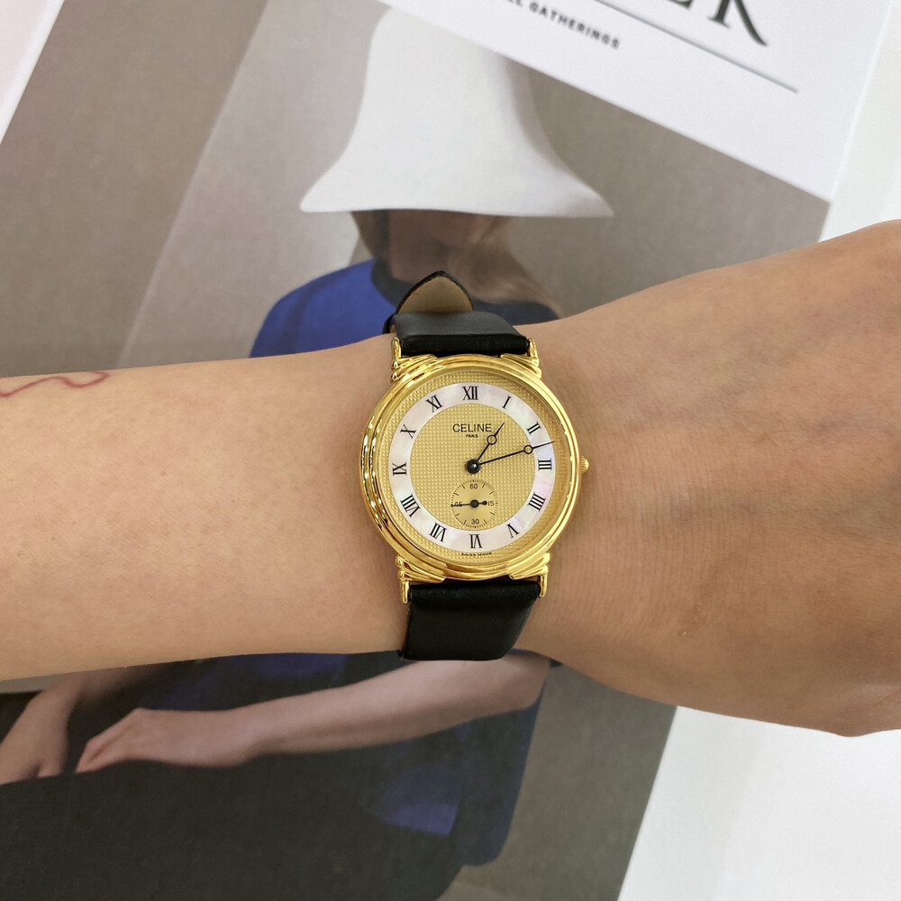 골드 톤 엠보 다이얼 위 자개 장식과 셀린느 로고가 클래식한 감성을 더해주는 셀린느 시계입니다.