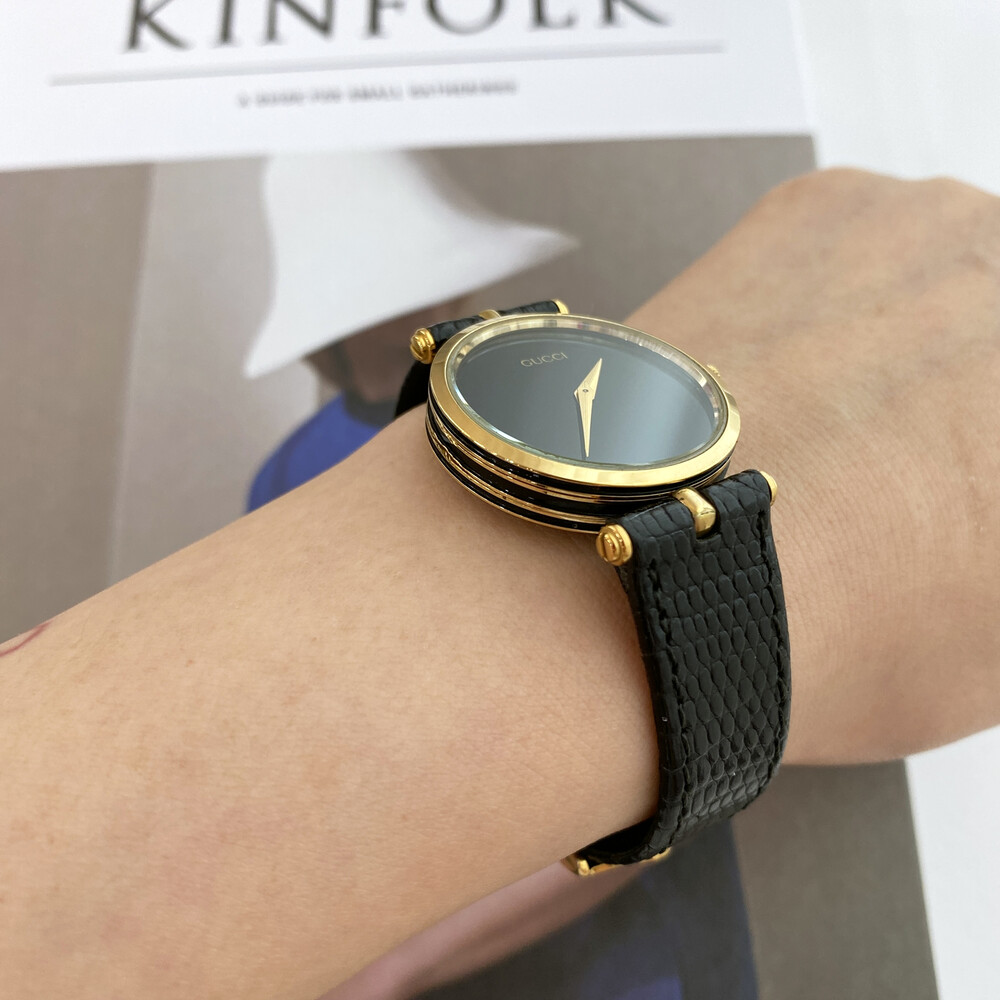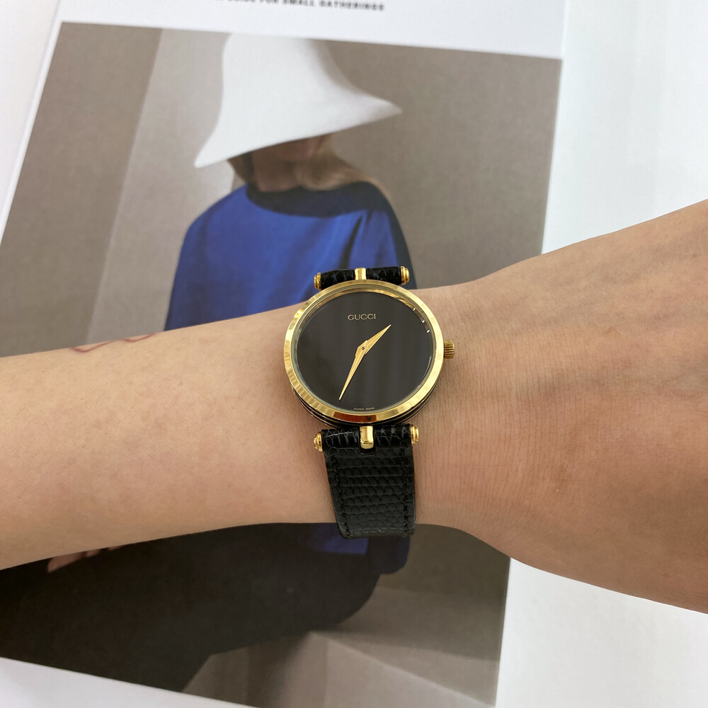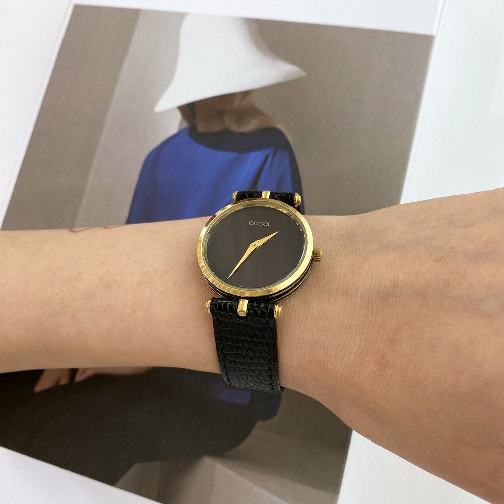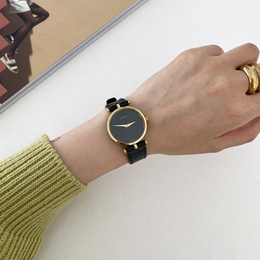 시계를 부드럽게 감싸주는 구찌 블랙 쉐리 웹 라인과 블랙 다이얼 위를 장식하는