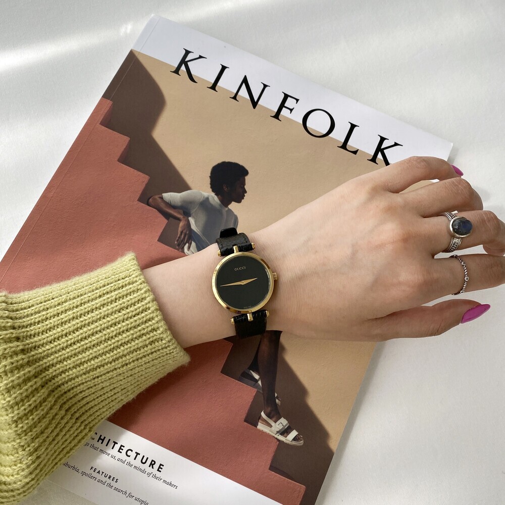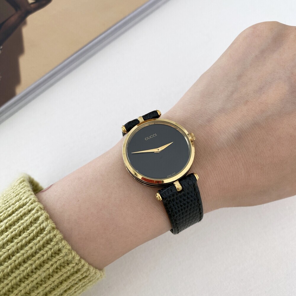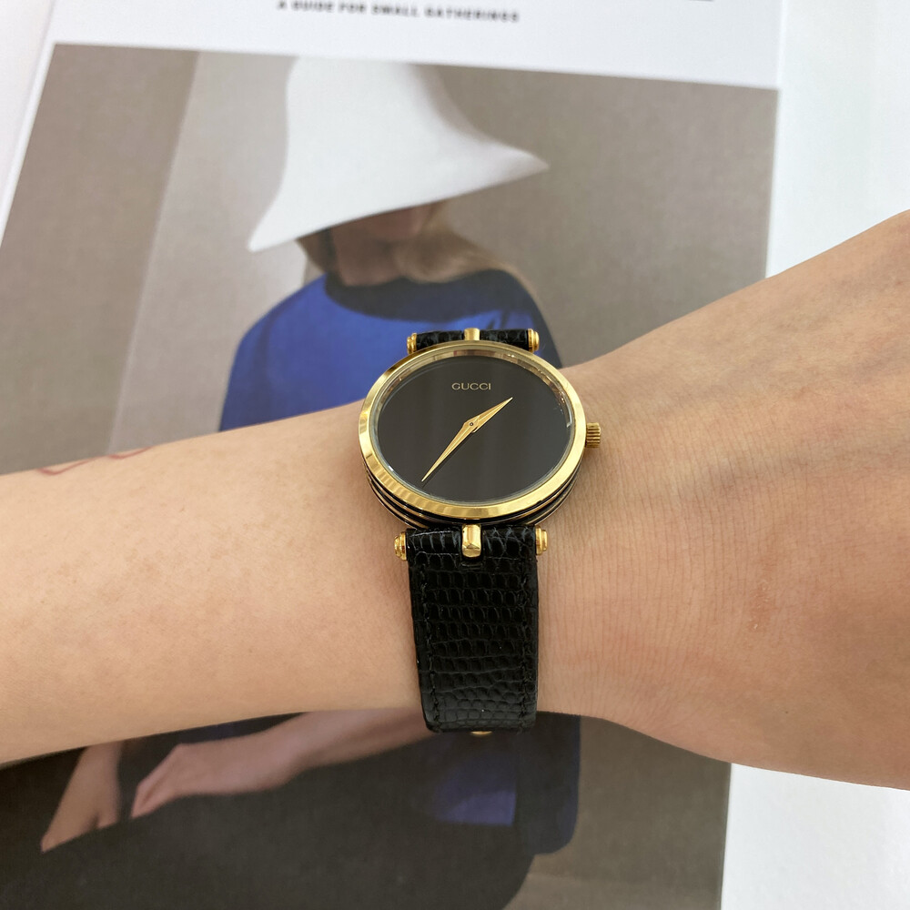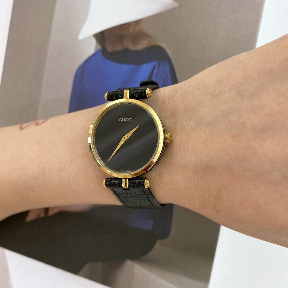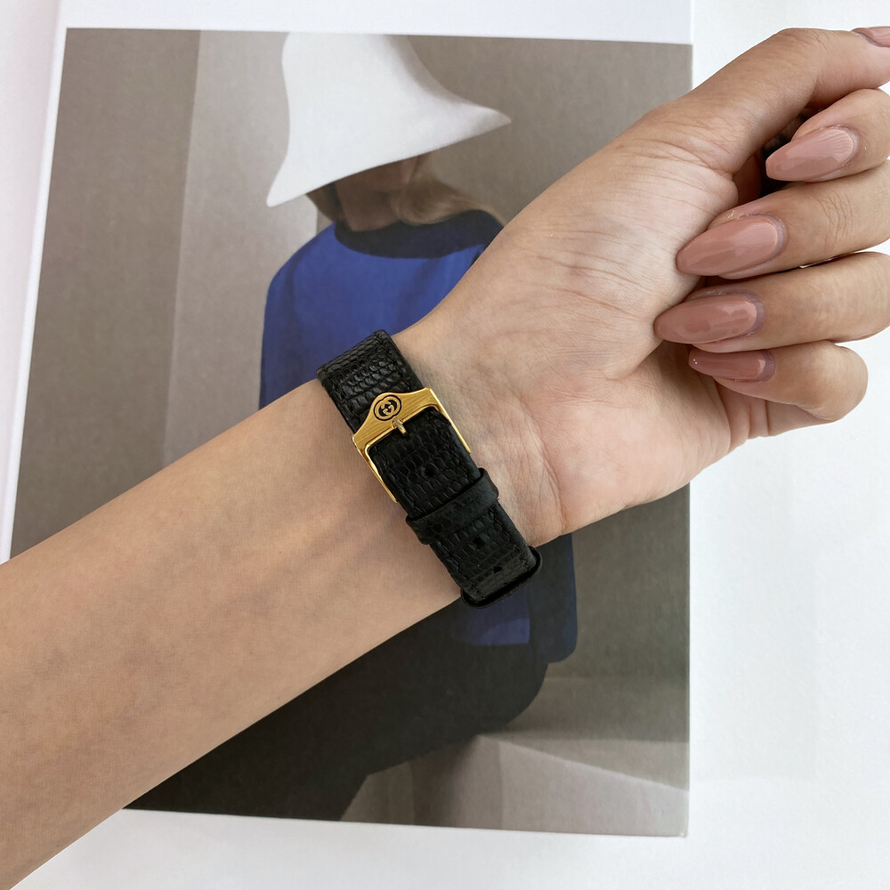 시계를 부드럽게 감싸주는 구찌 블랙 쉐리 웹 라인과 블랙 다이얼 위를 장식하는