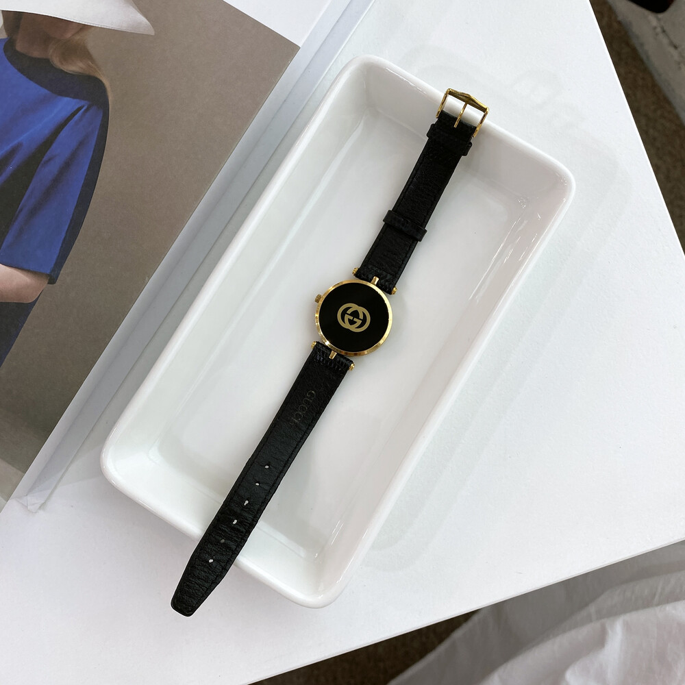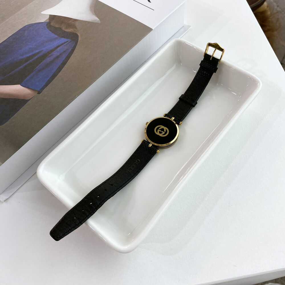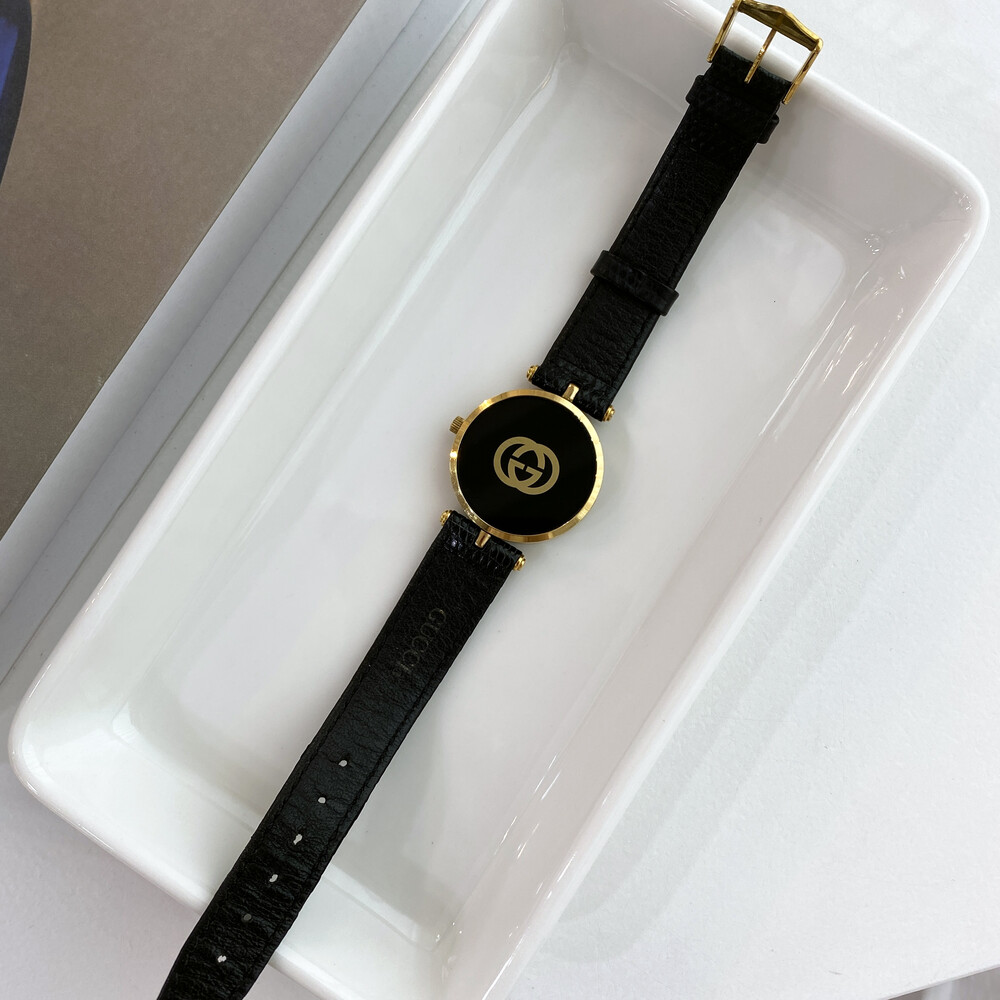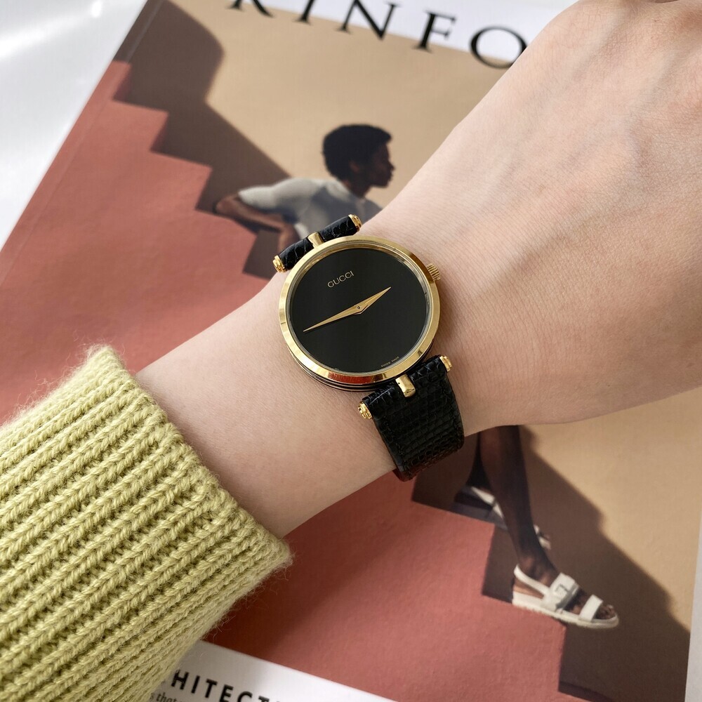 시계를 부드럽게 감싸주는 구찌 블랙 쉐리 웹 라인과 블랙 다이얼 위를 장식하는