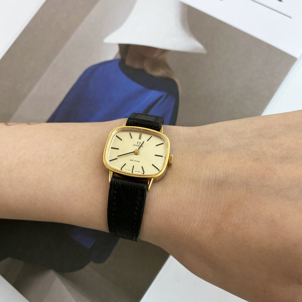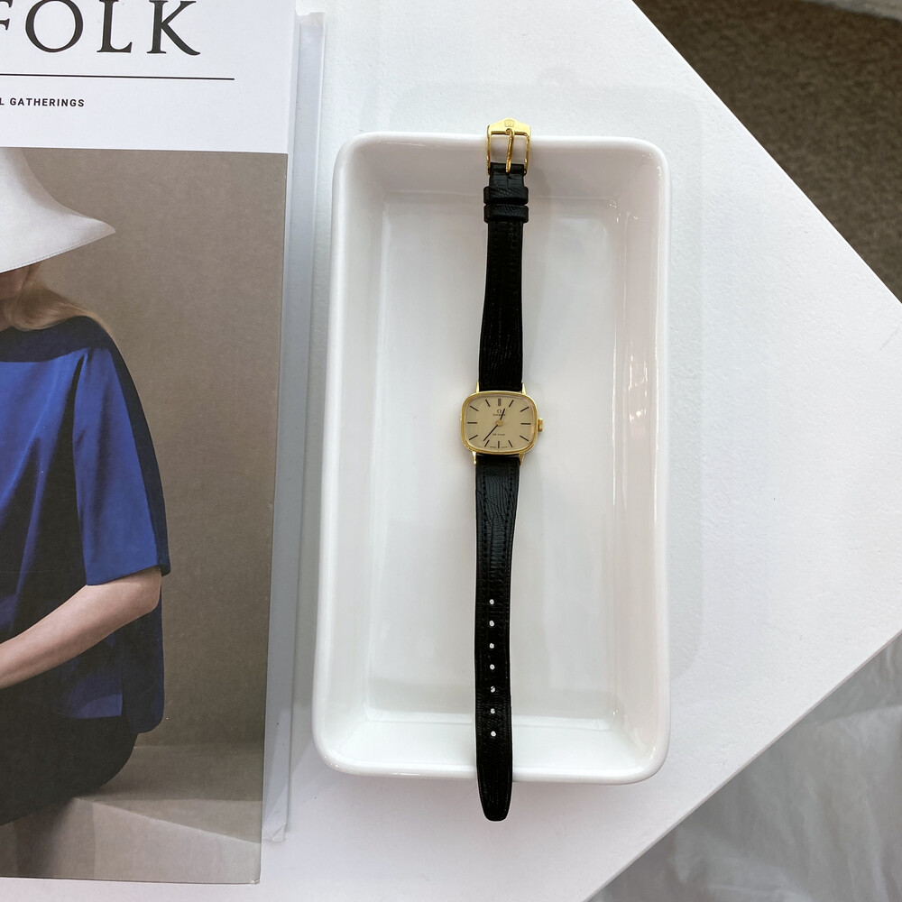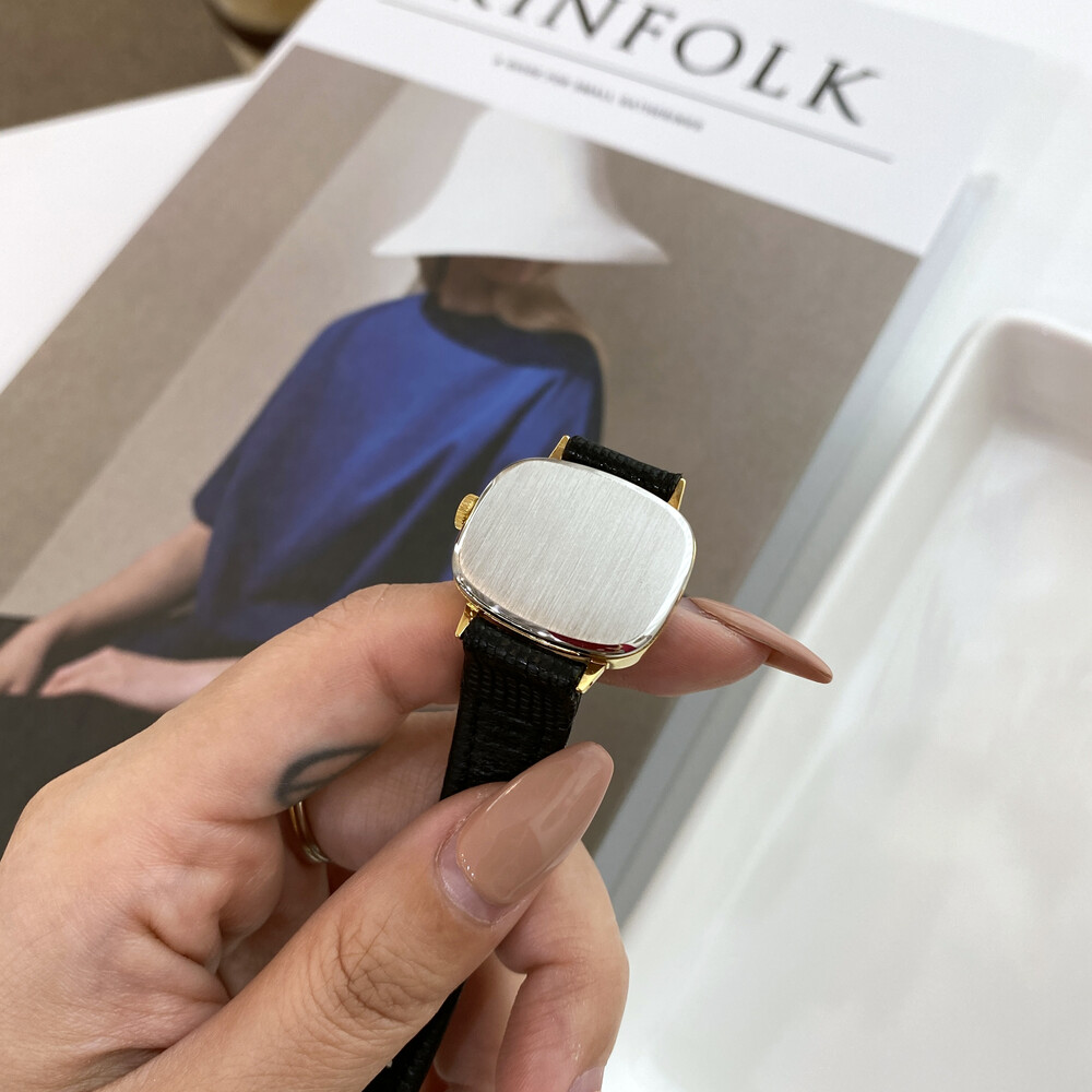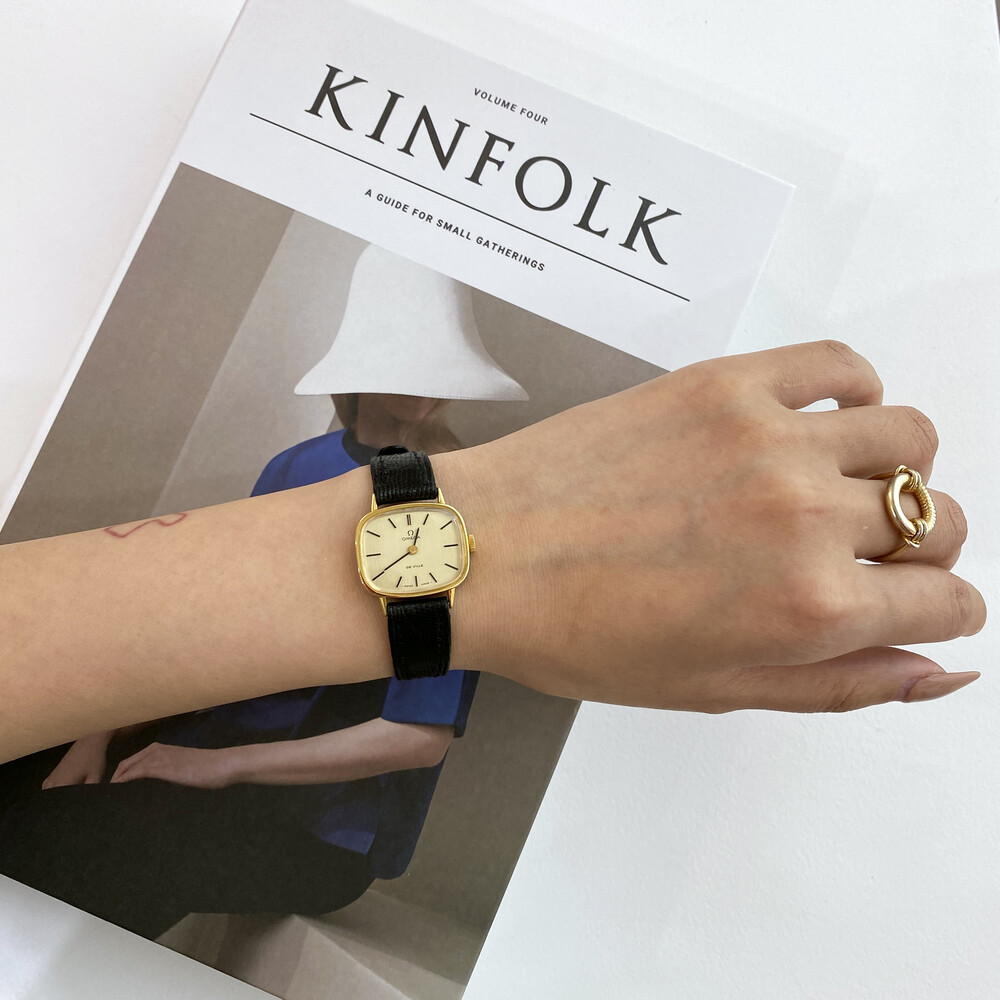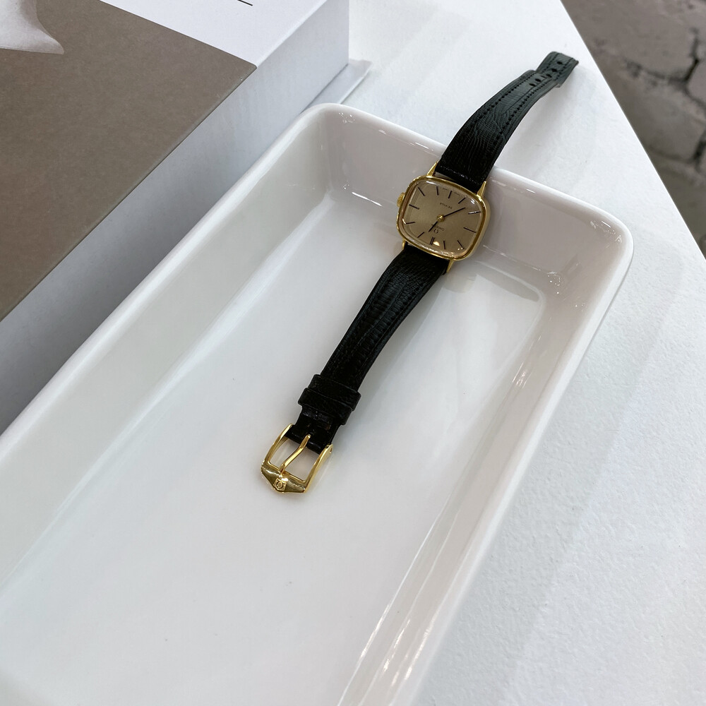 골드 톤 스퀘어 타입의 바디와 볼록한 돔 형태의 운모 글라스,