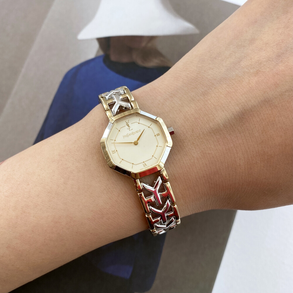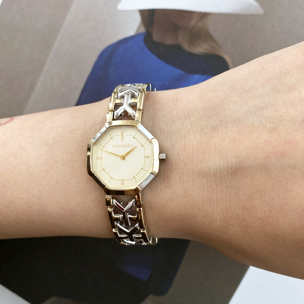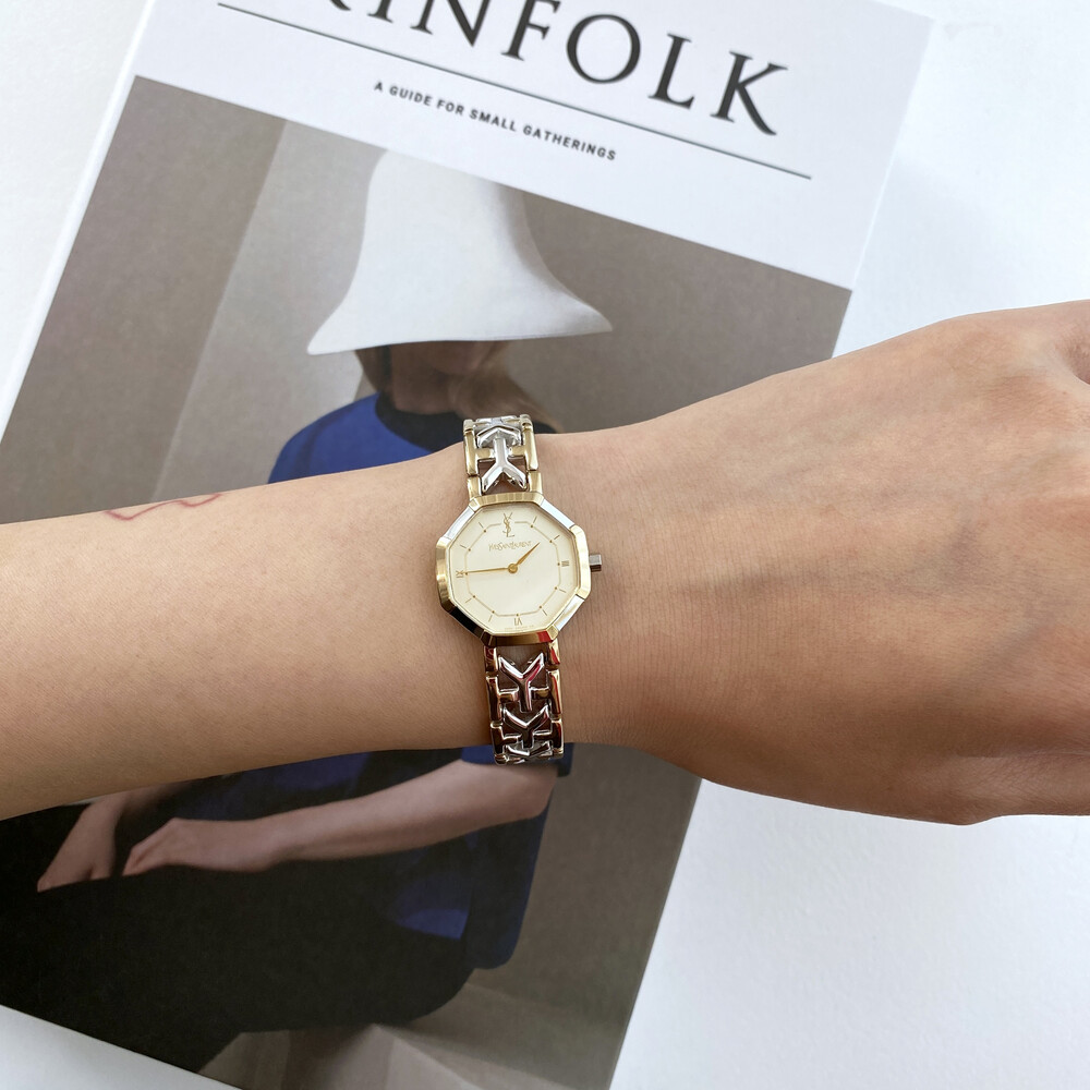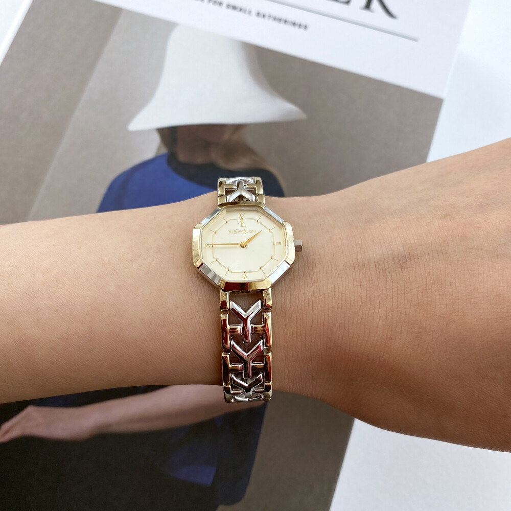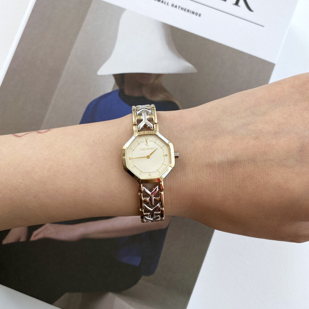 매력적인 옥타곤 타입의 케이스와 샴페인 톤의 다이얼 위를 장식하는 YSL 로고가 매력적인 모델입니다.