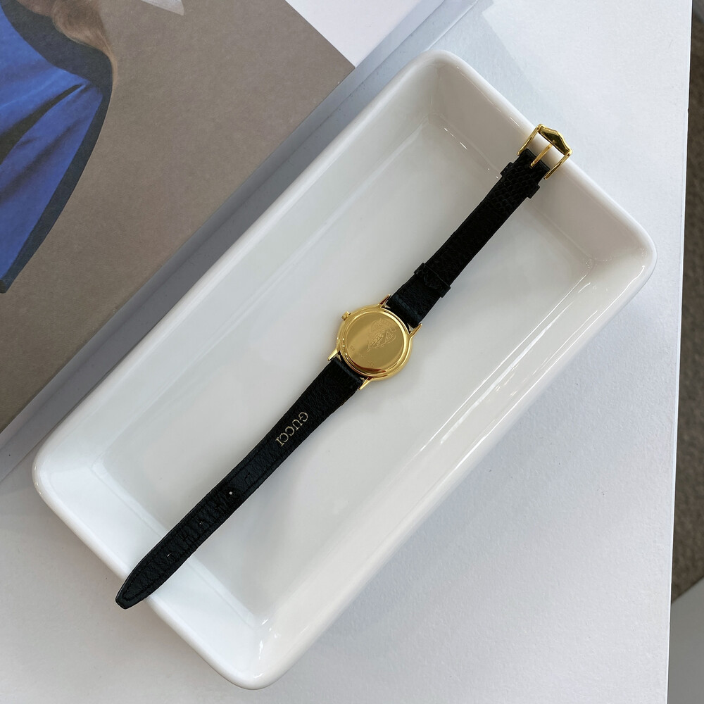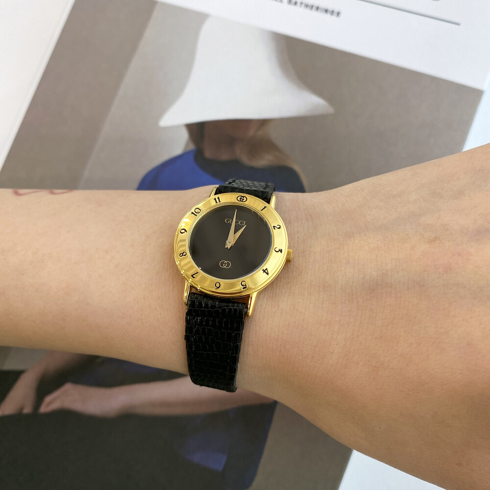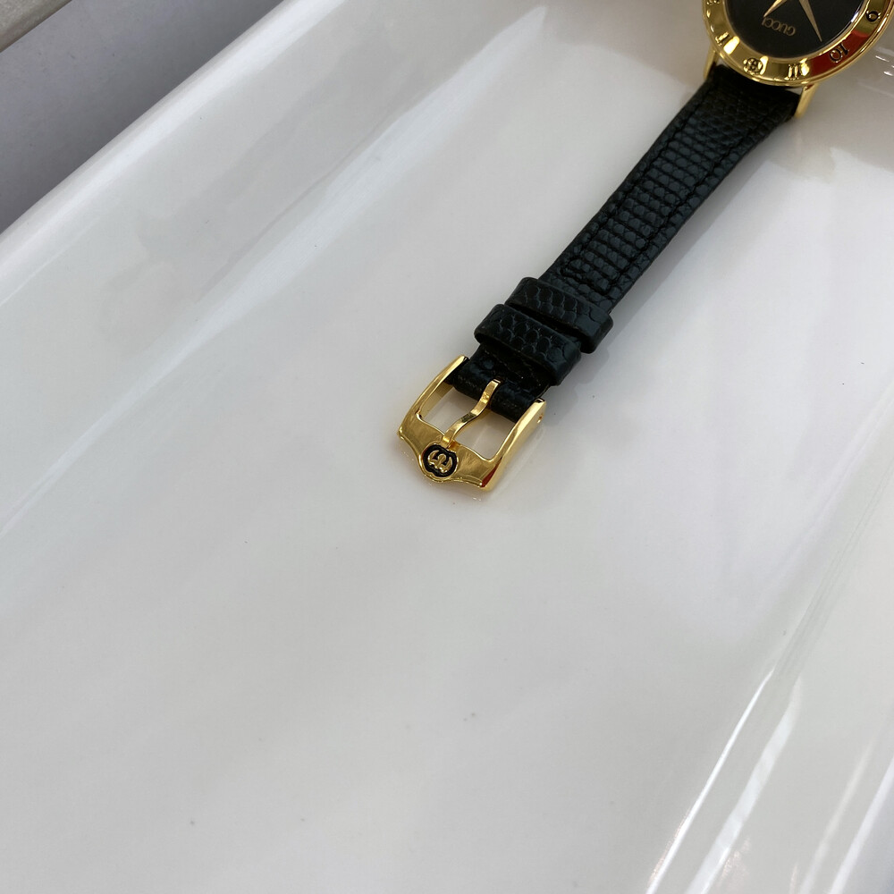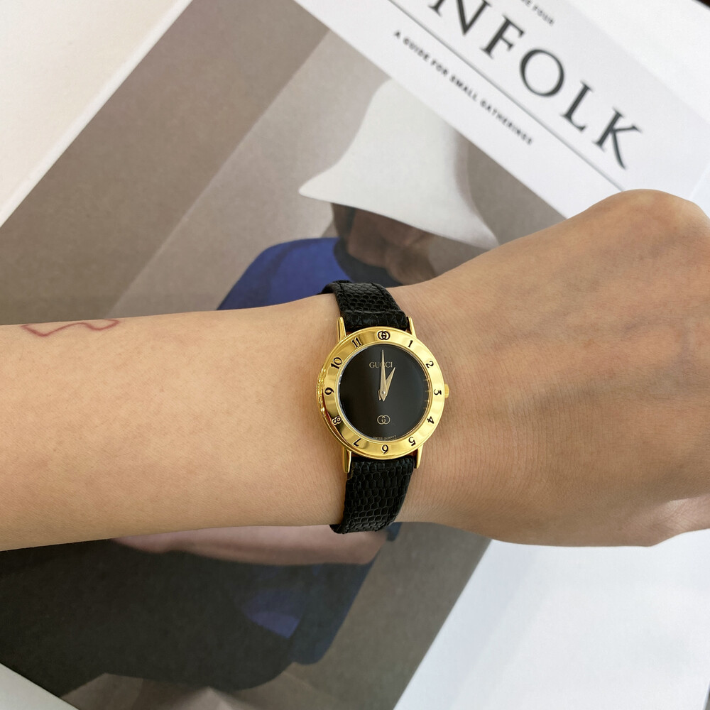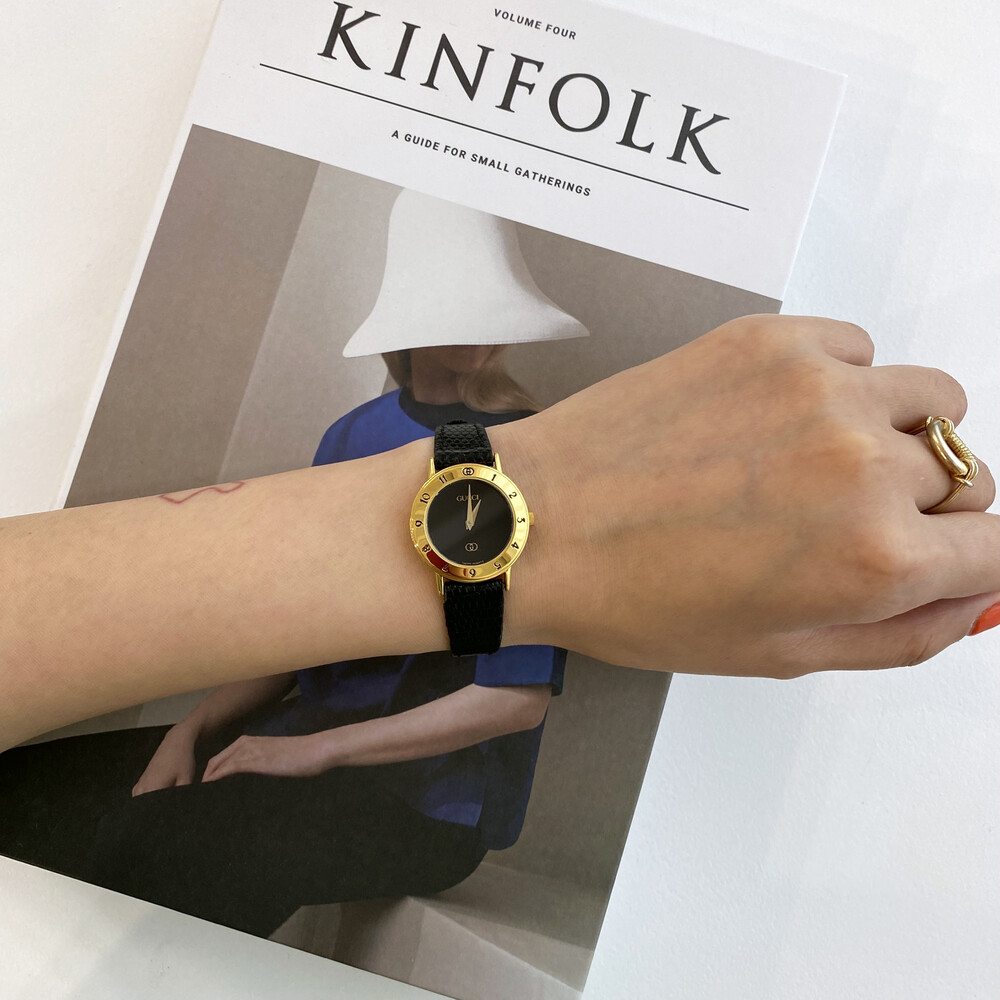 매력적인 골드 톤 라운드 케이스와 블랙 다이얼 위를 장식하는 구찌 GG 시그니처가