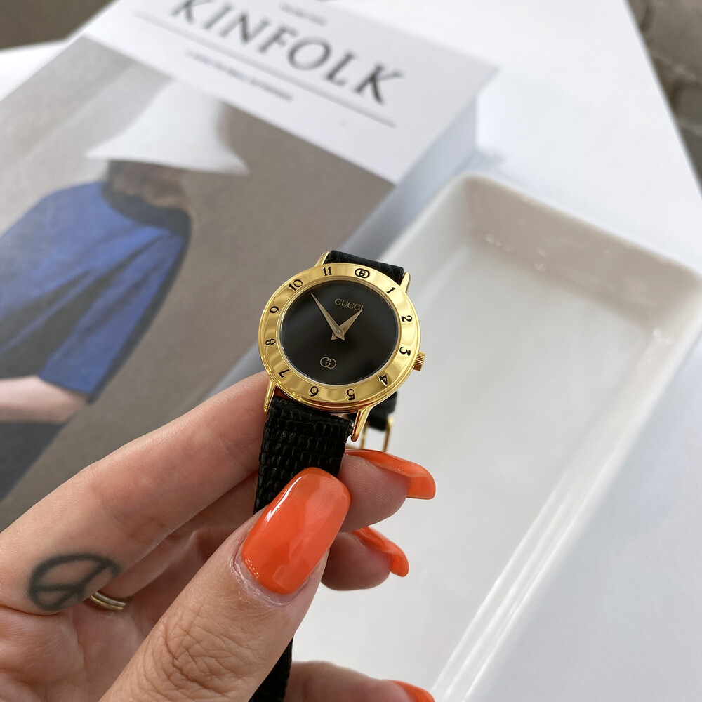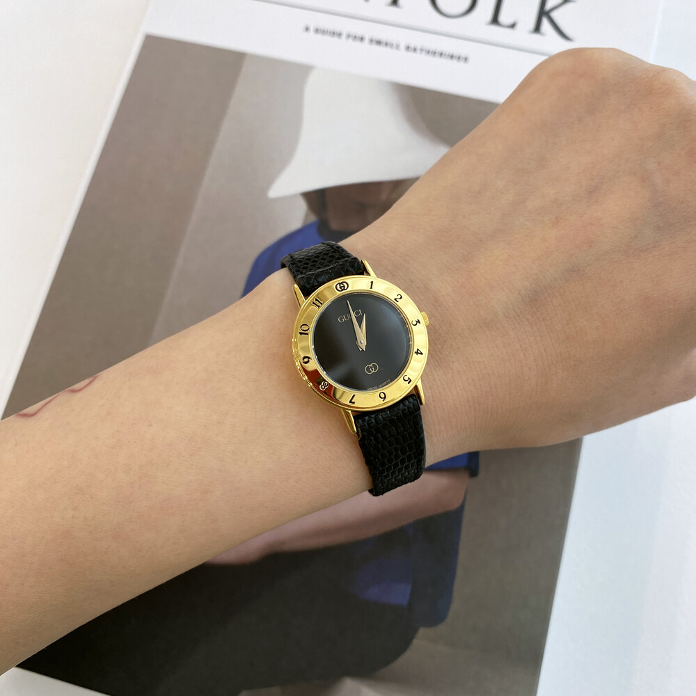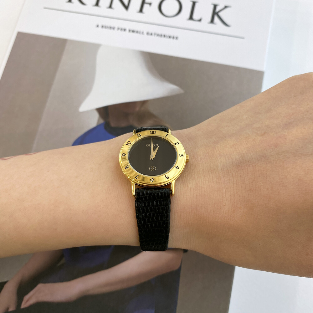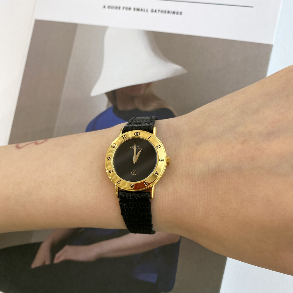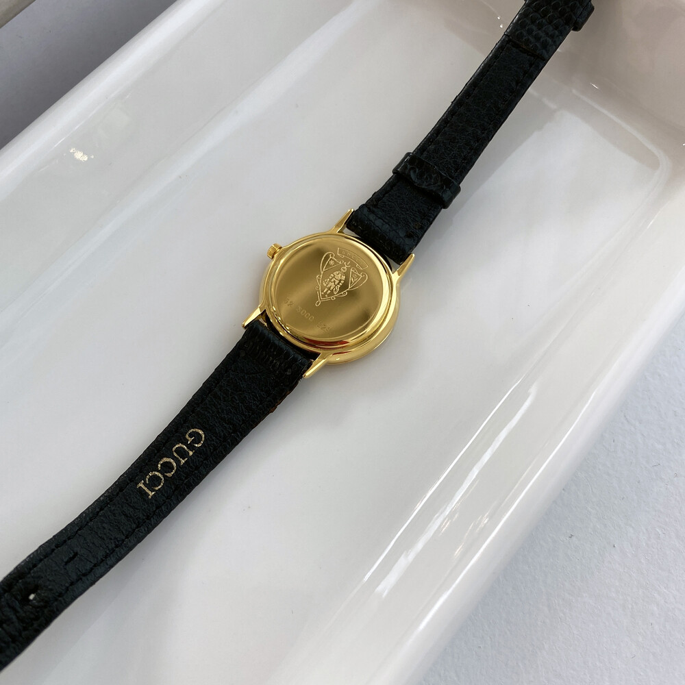 매력적인 골드 톤 라운드 케이스와 블랙 다이얼 위를 장식하는 구찌 GG 시그니처가