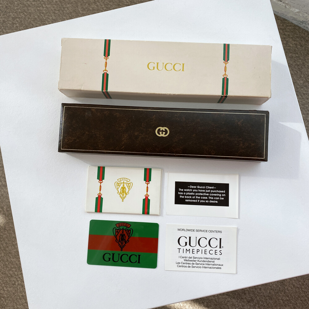 구찌 시계 케이스, 상자, 개런티 카드, 서비스센터 카드가 포함된 제품입니다.