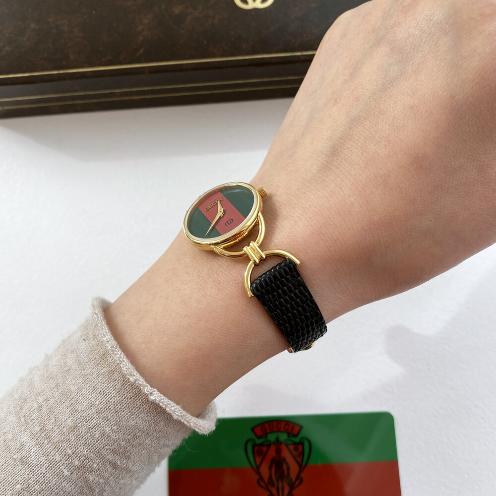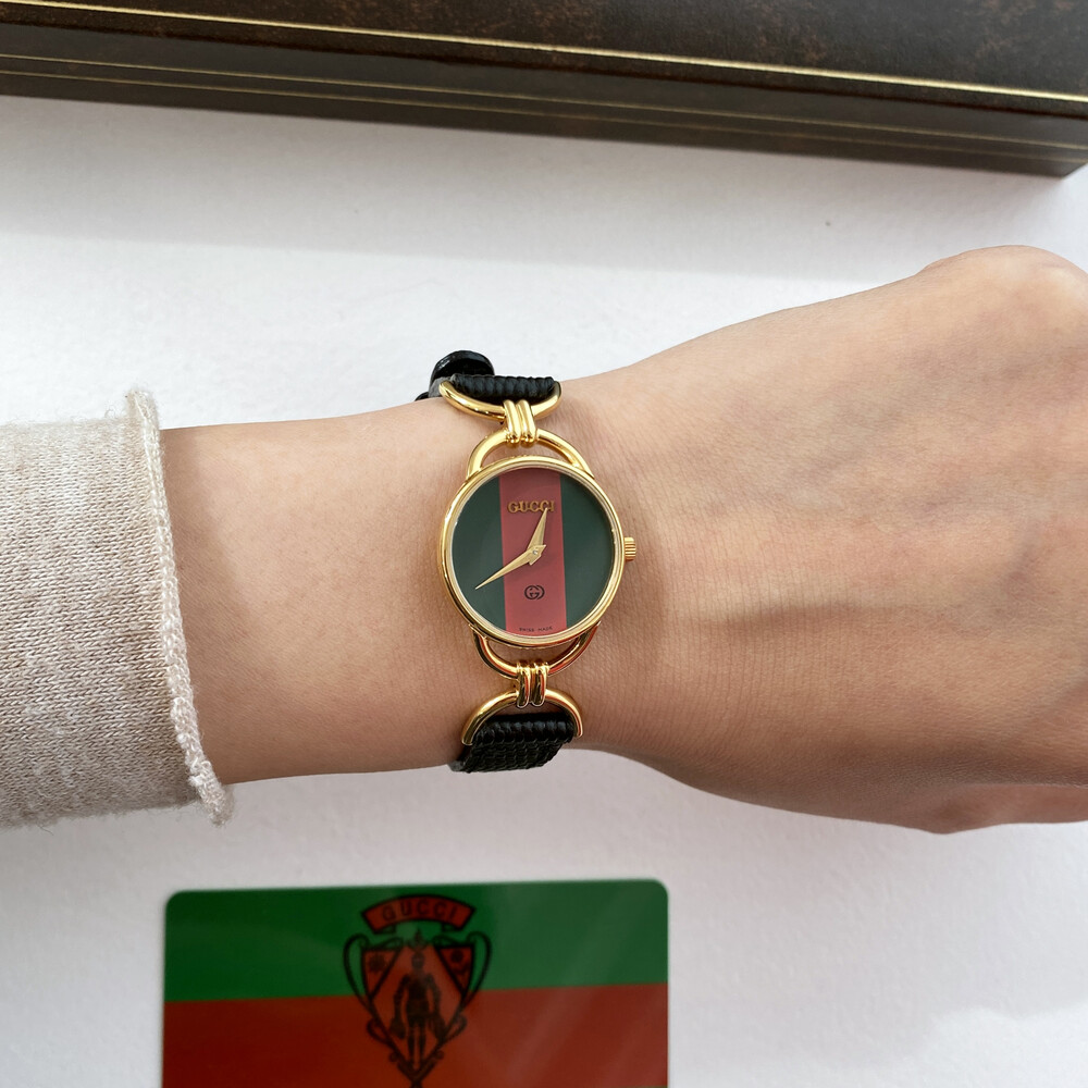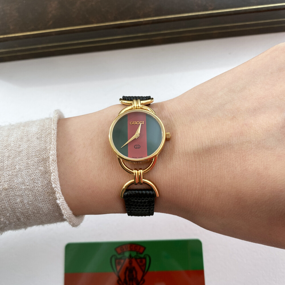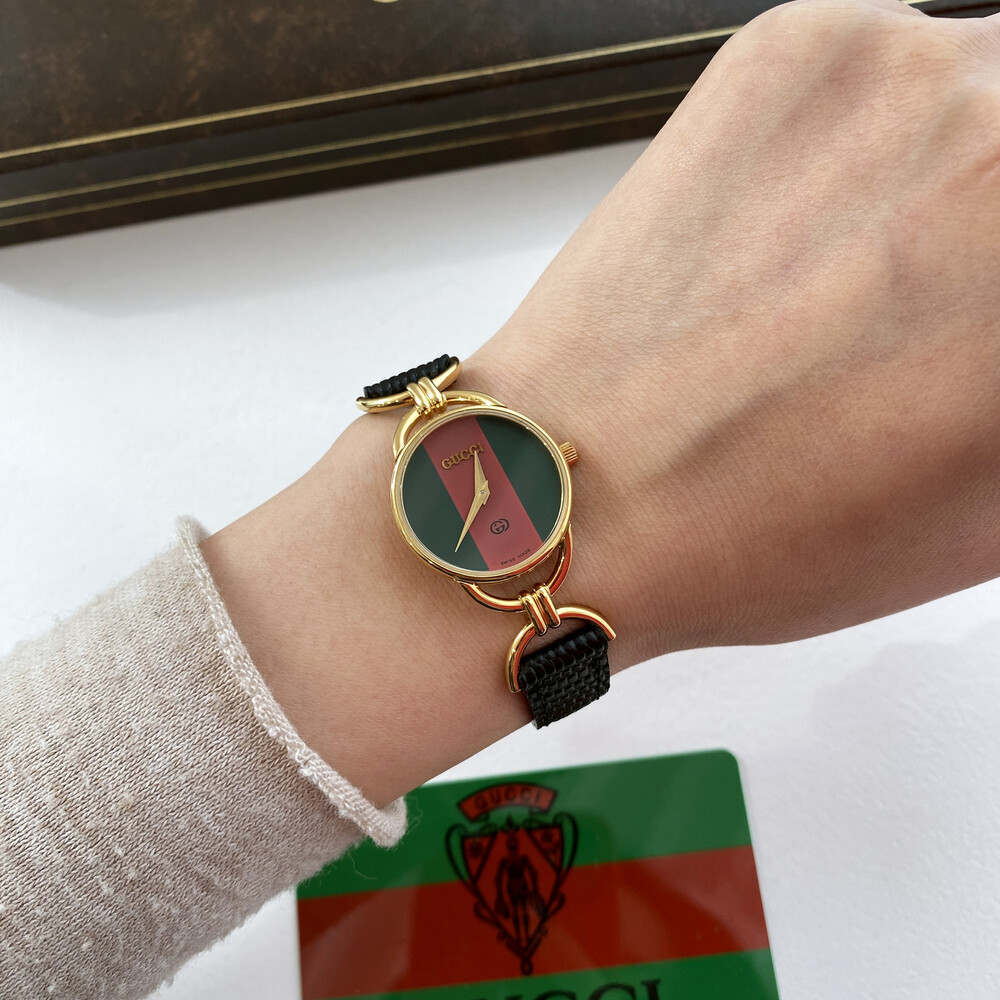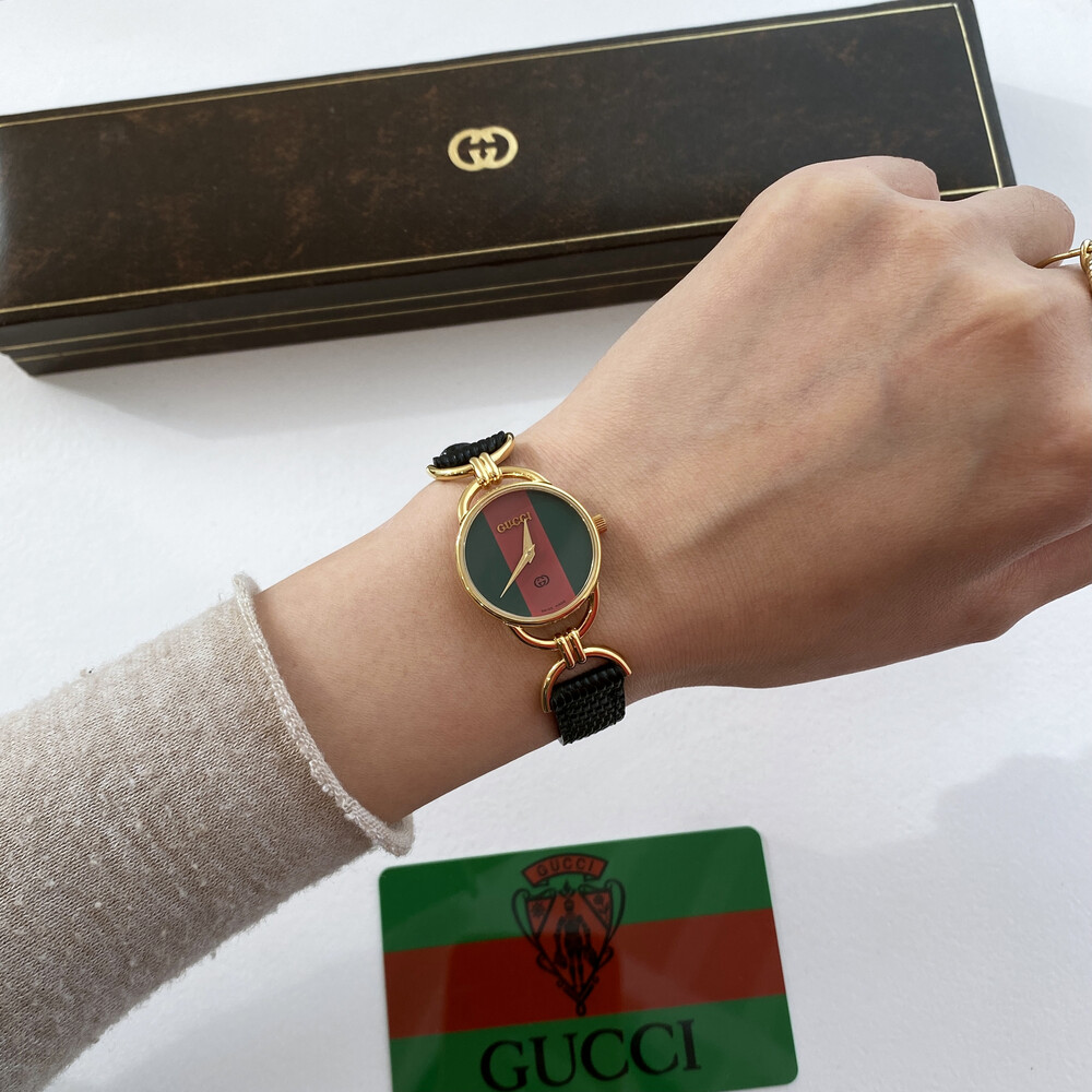 매력적인 홀스빗 타입의 러그와 구찌 시그니처 쉐리 다이얼이 아름다운 모델입니다.