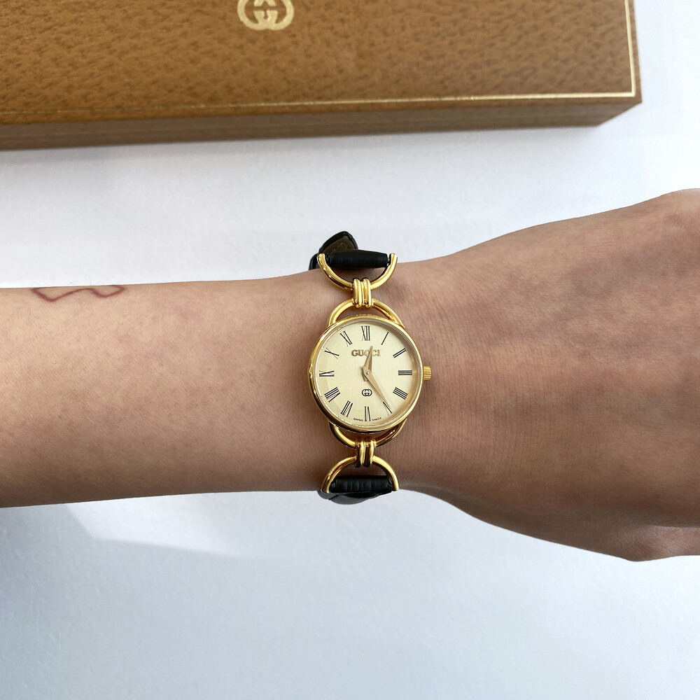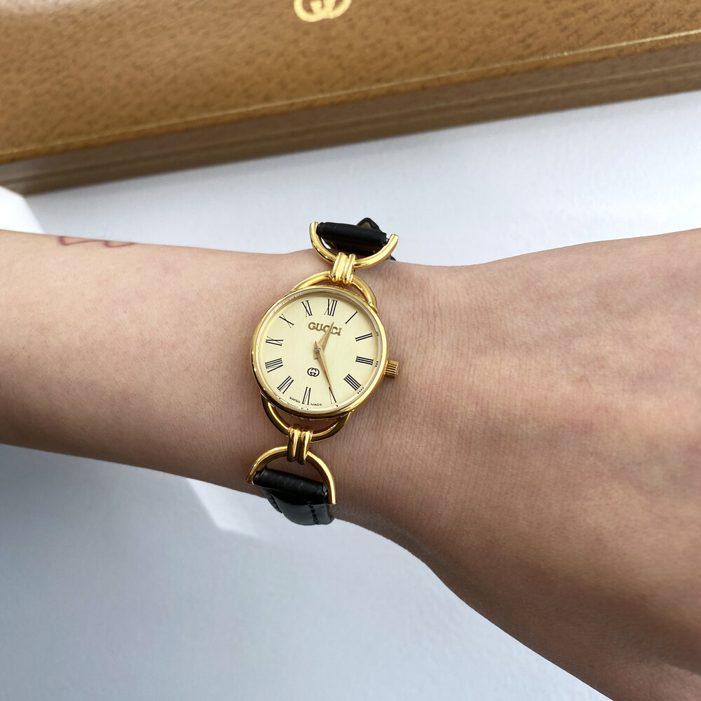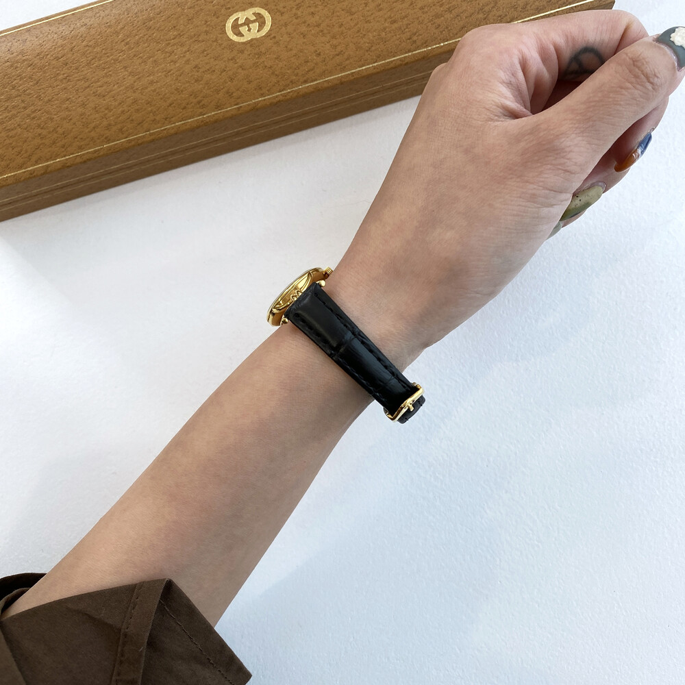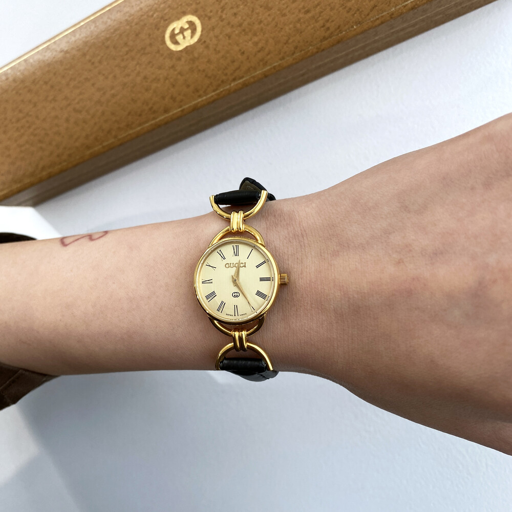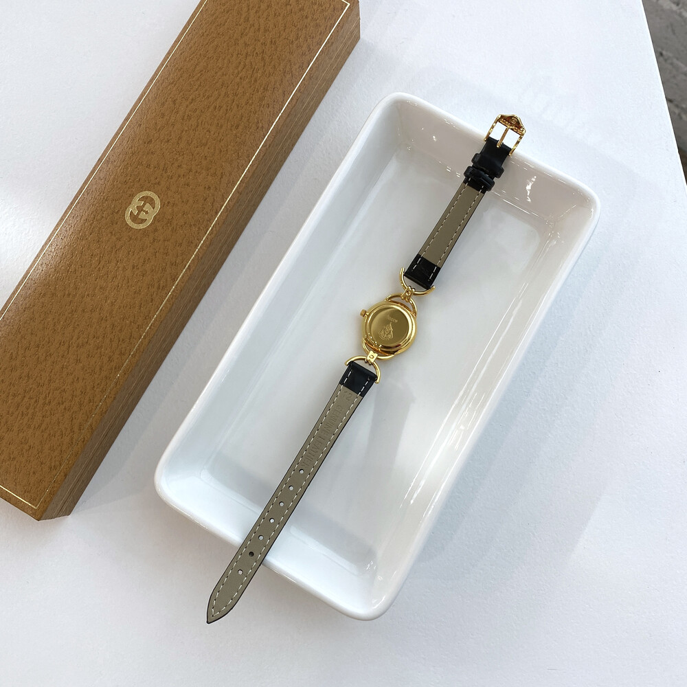 골드 톤 라운드 케이스와 다이얼 위를 장식하는 구찌 로고와