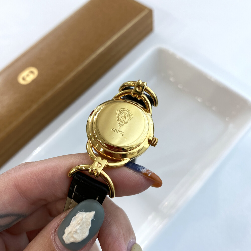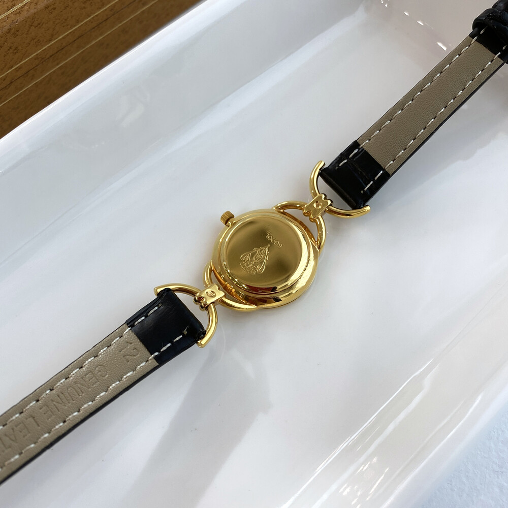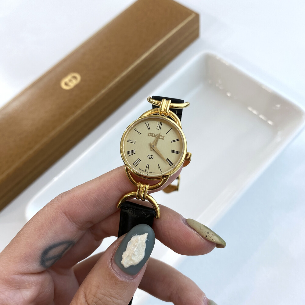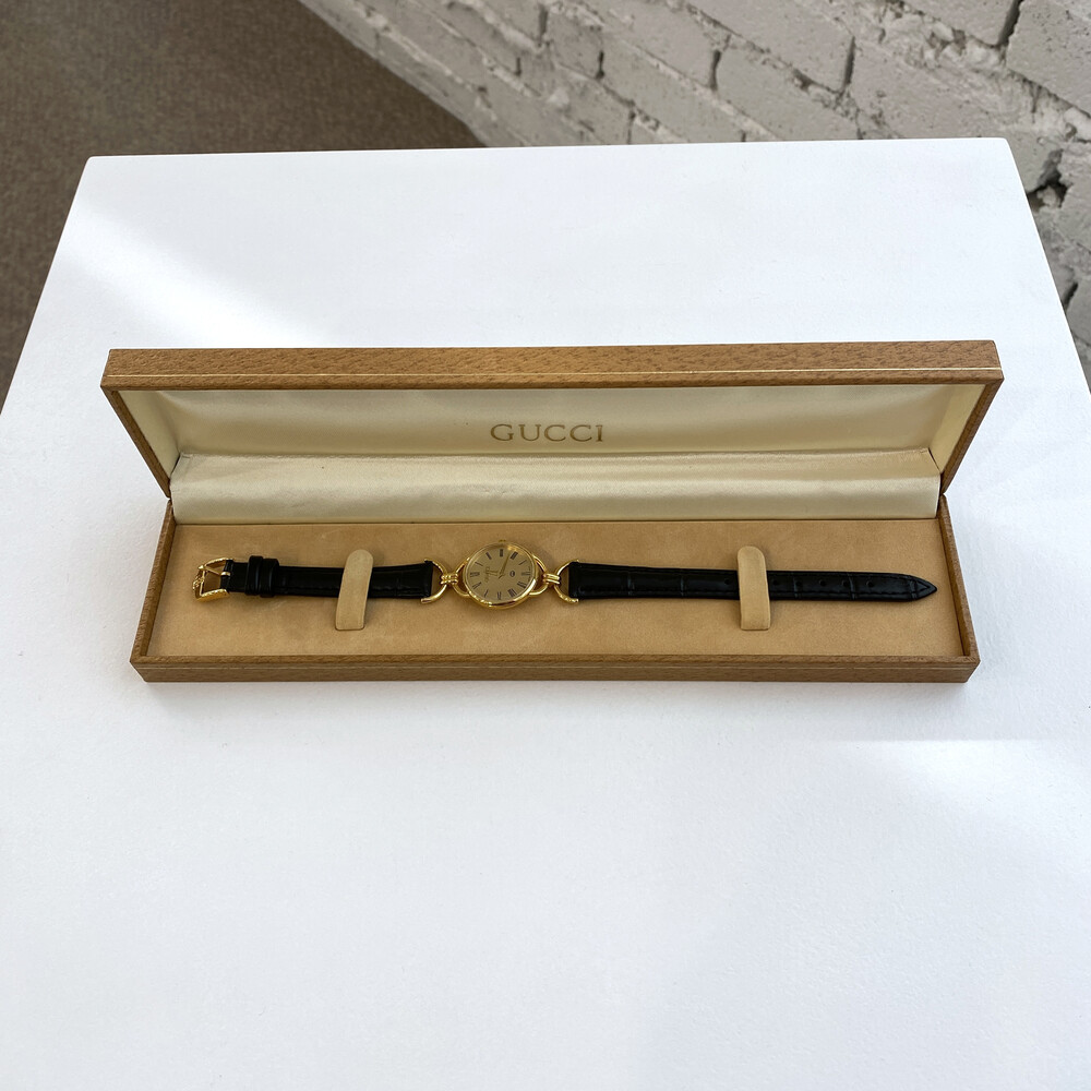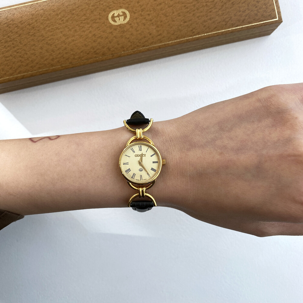 골드 톤 라운드 케이스와 다이얼 위를 장식하는 구찌 로고와