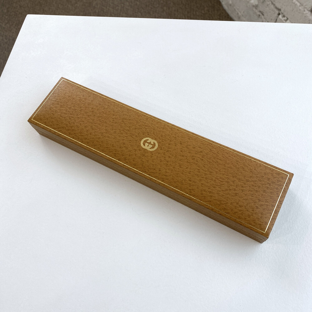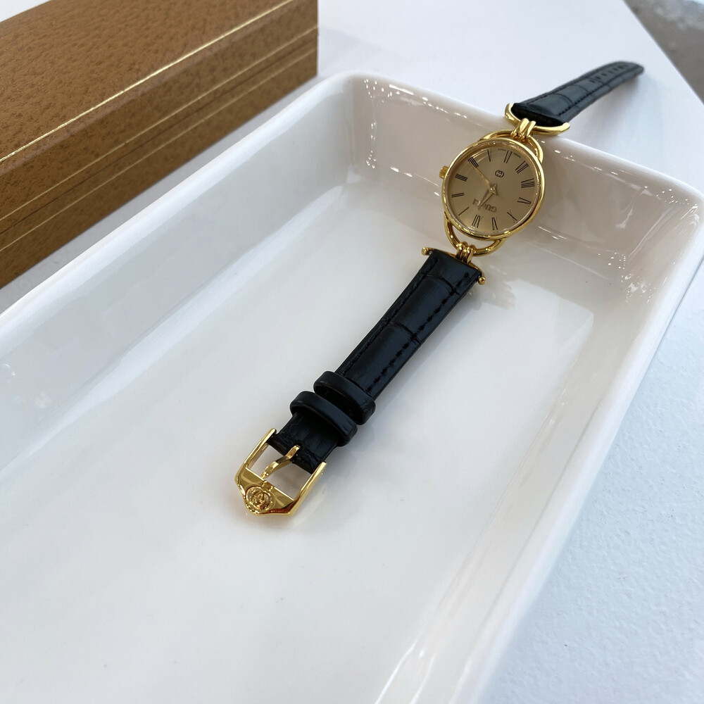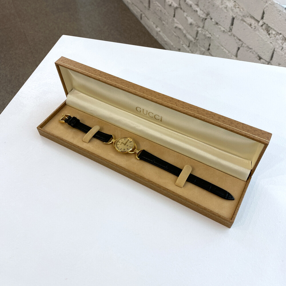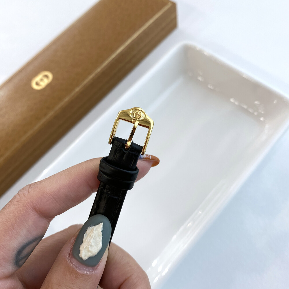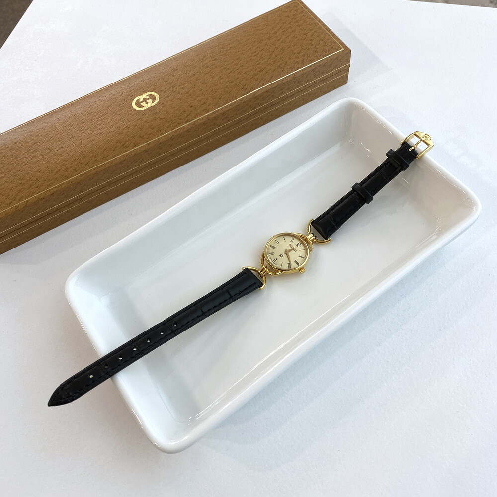 골드 톤 라운드 케이스와 다이얼 위를 장식하는 구찌 로고와