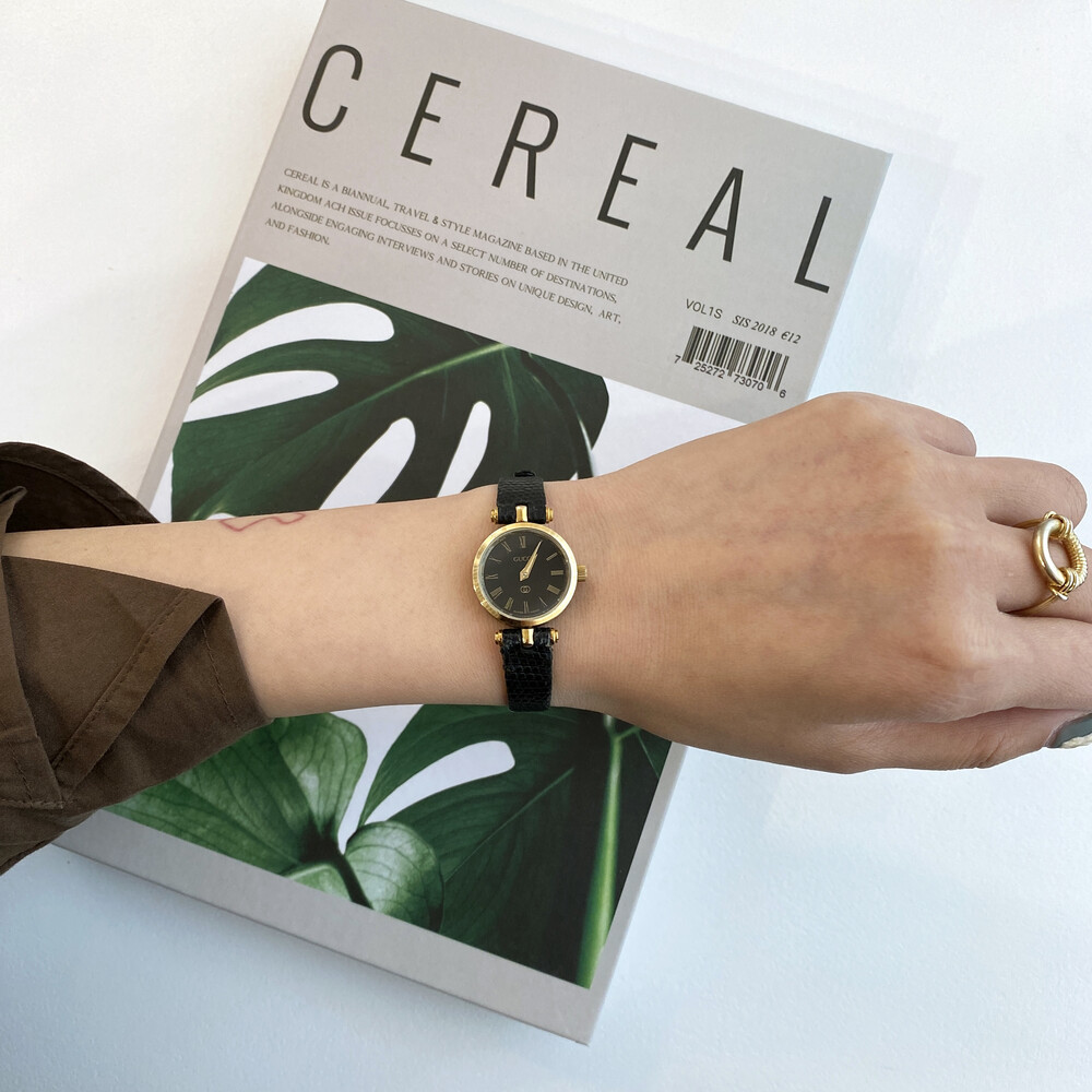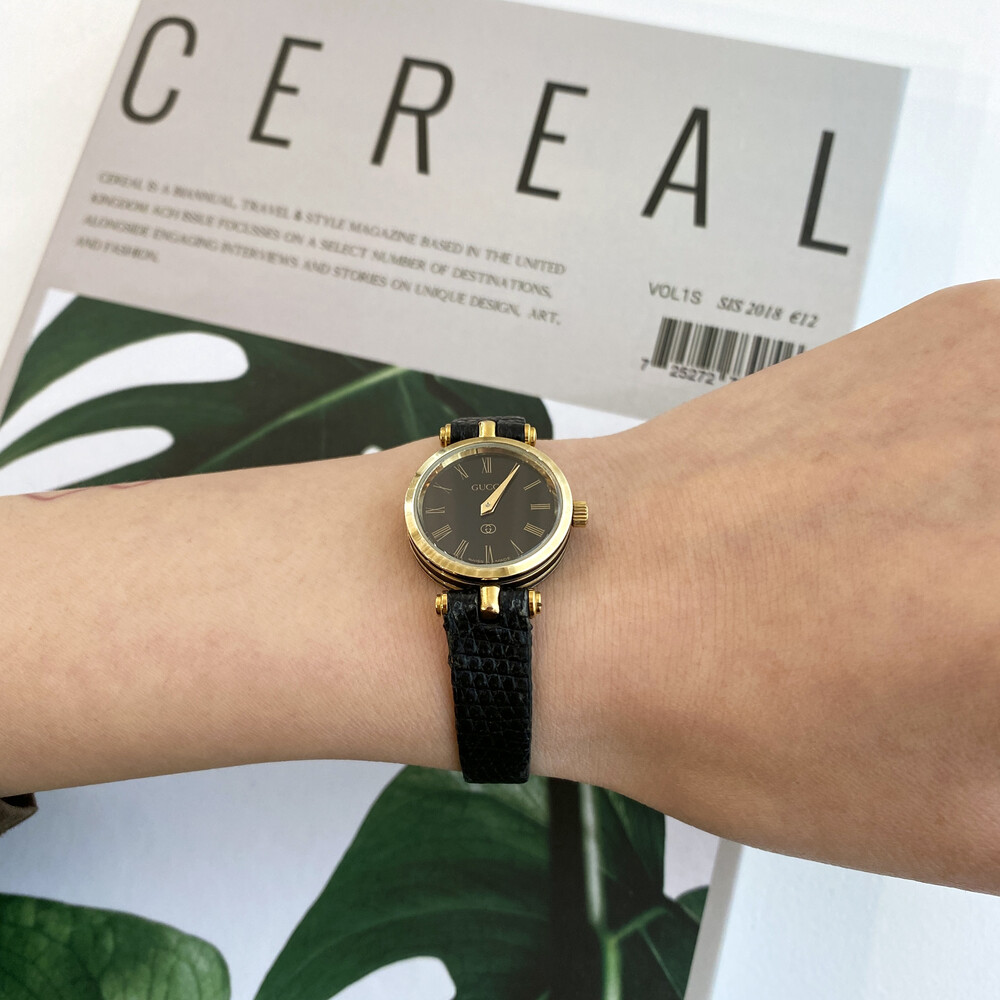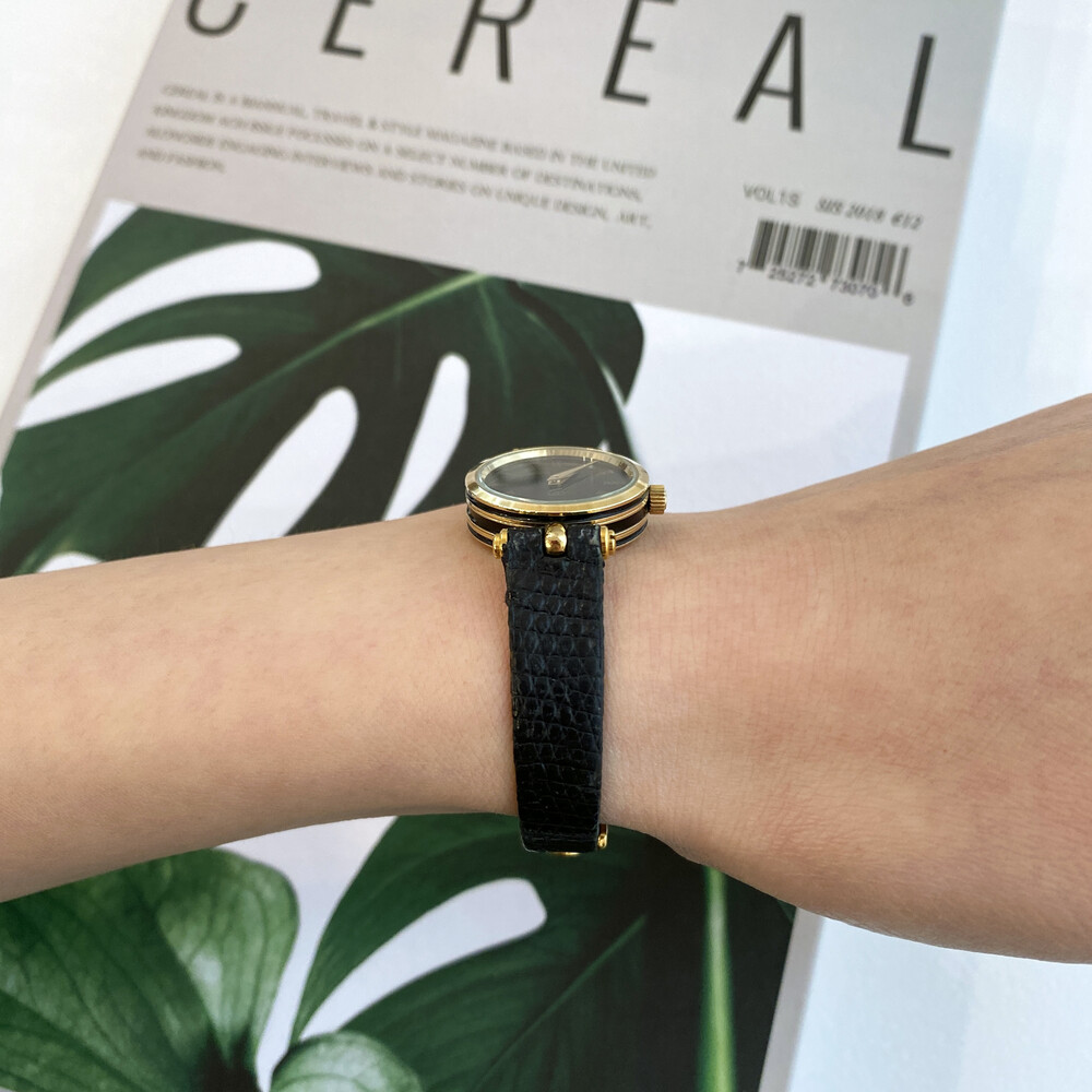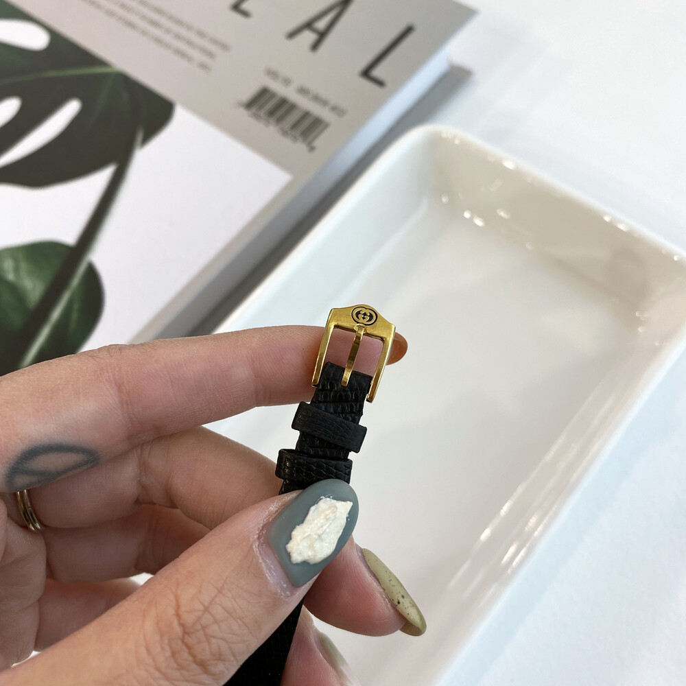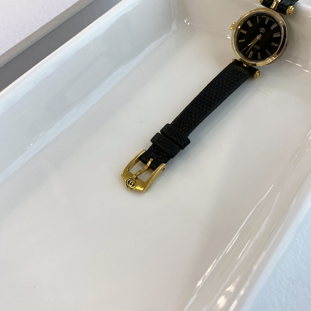시계를 부드럽게 감싸주는 구찌 블랙 쉐리 라인이 아름다운 제품입니다.