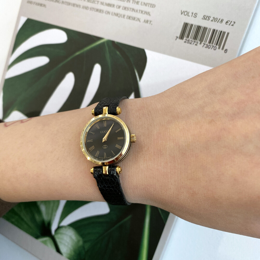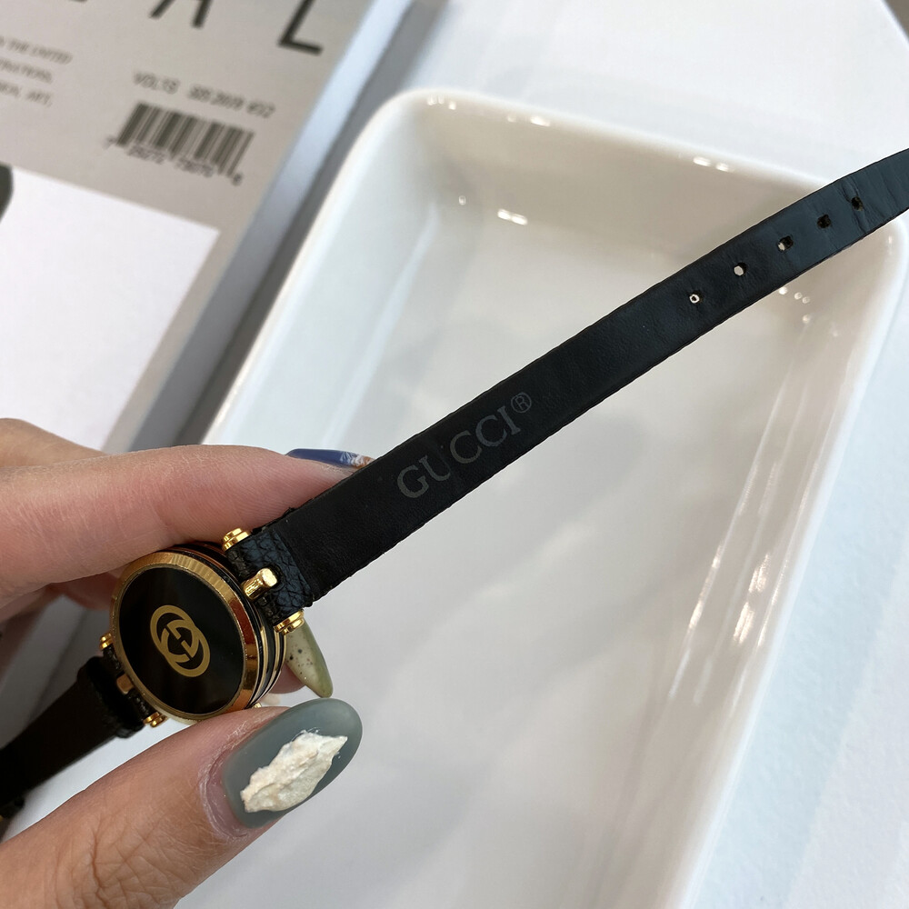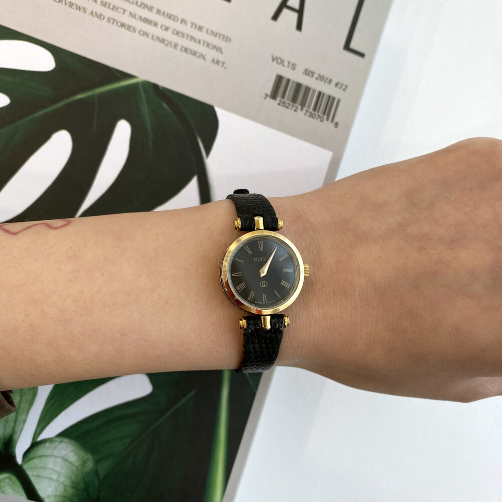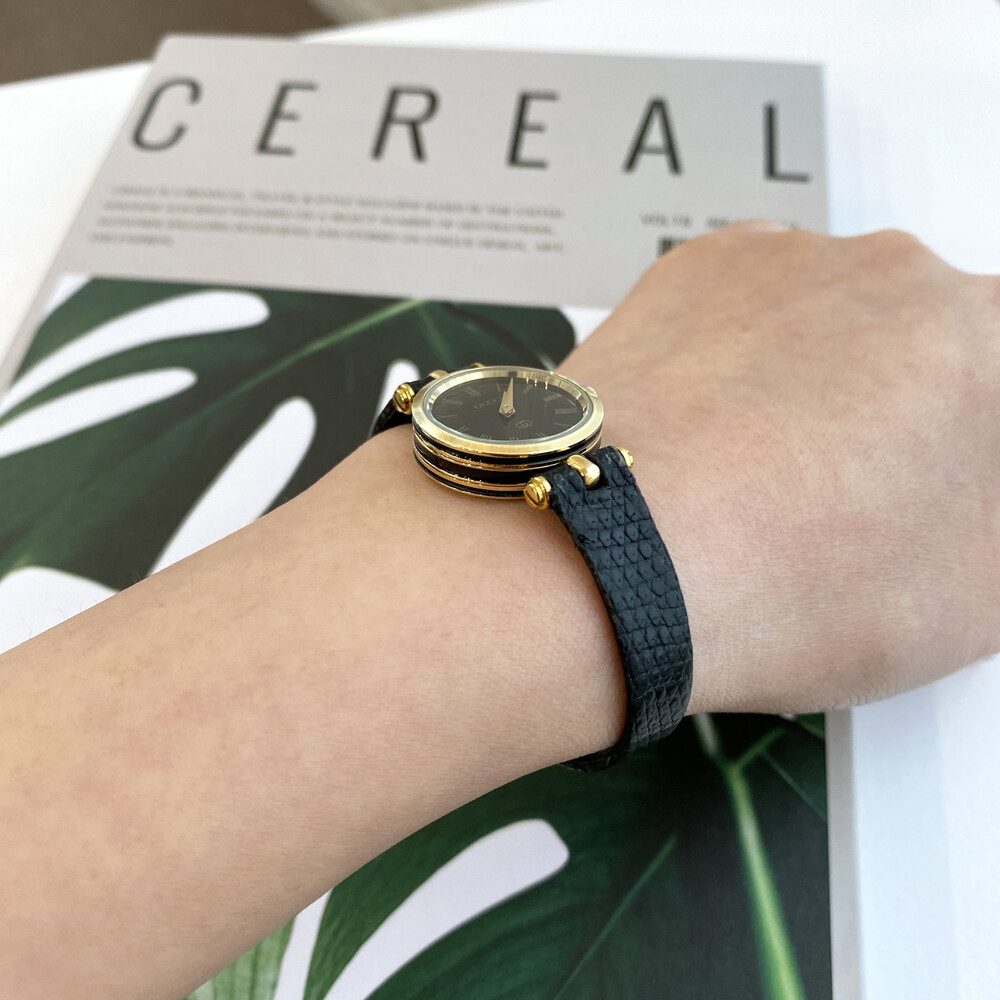 시계를 부드럽게 감싸주는 구찌 블랙 쉐리 라인이 아름다운 제품입니다.