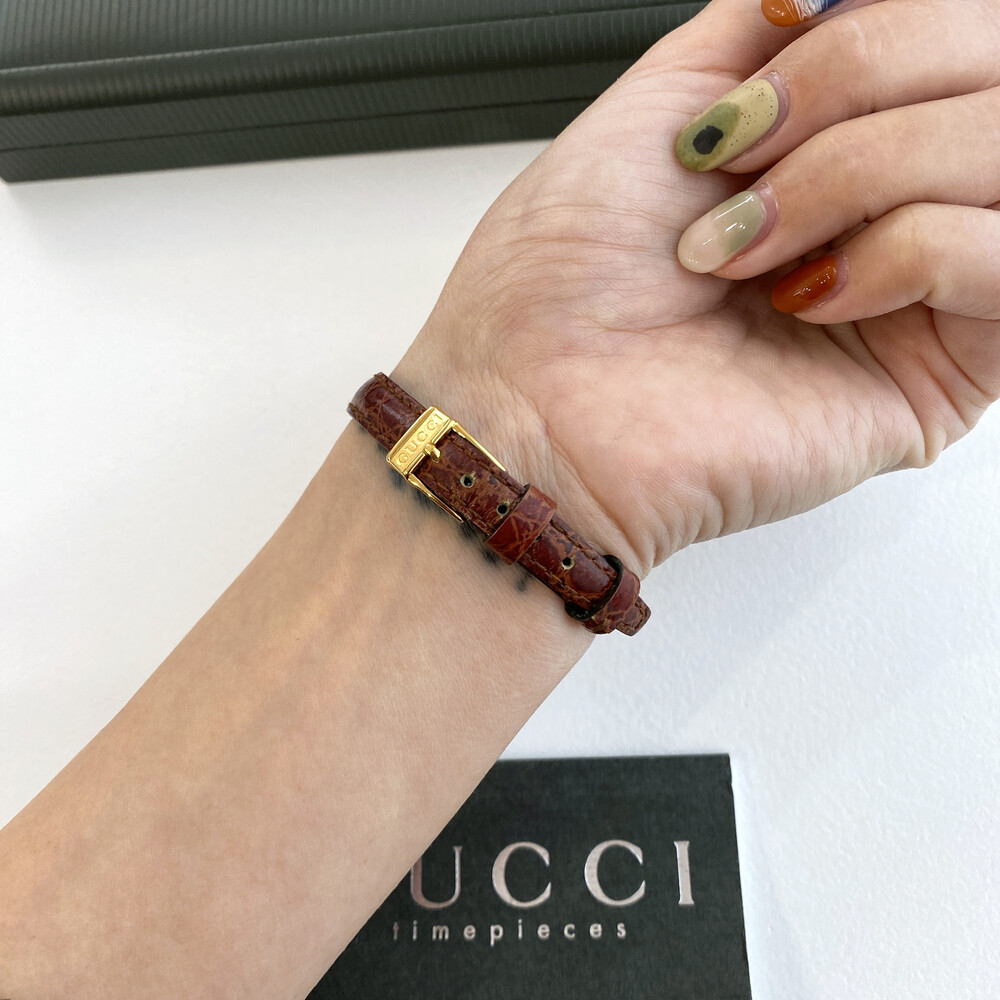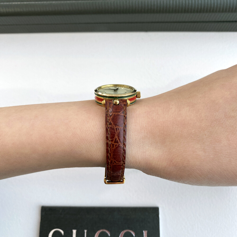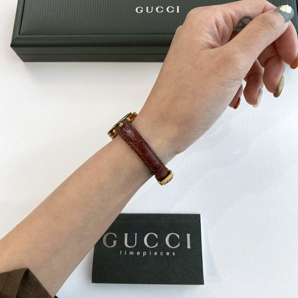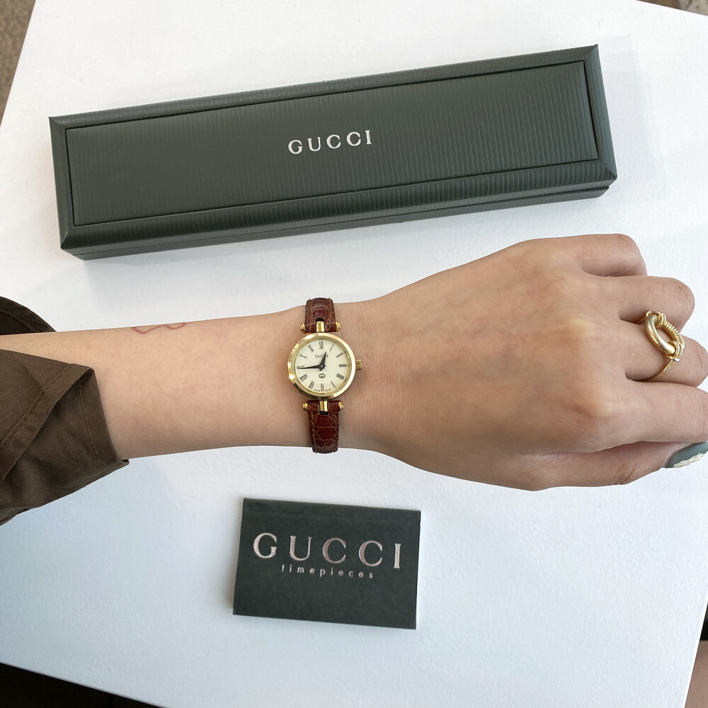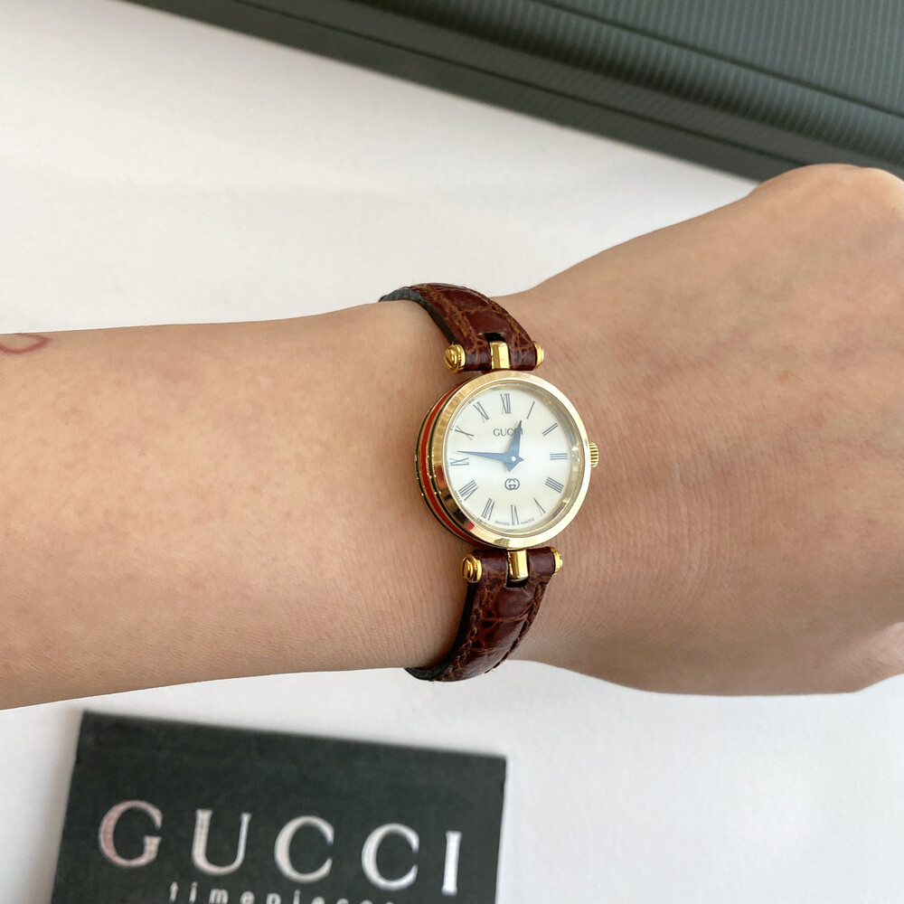 시계를 부드럽게 감싸주는 구찌 시그니처 쉐리라인이 아름다운 제품입니다.