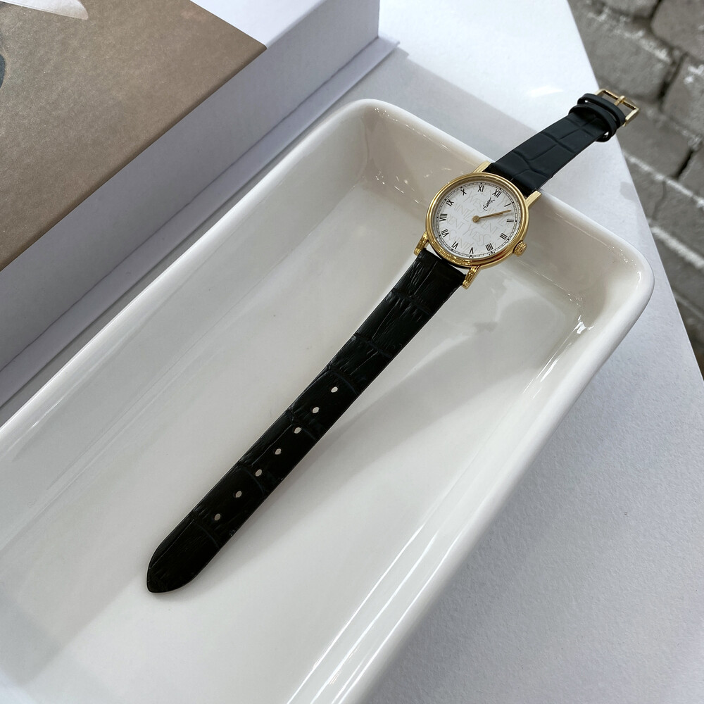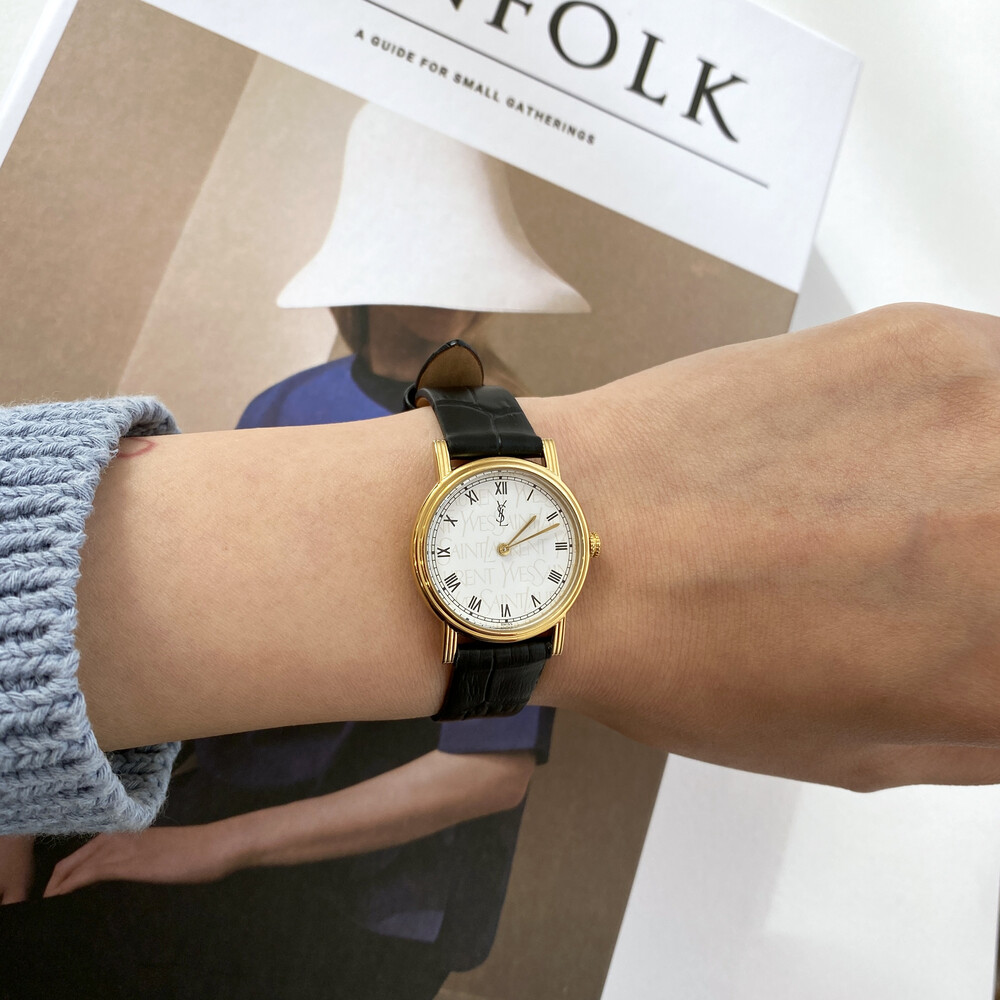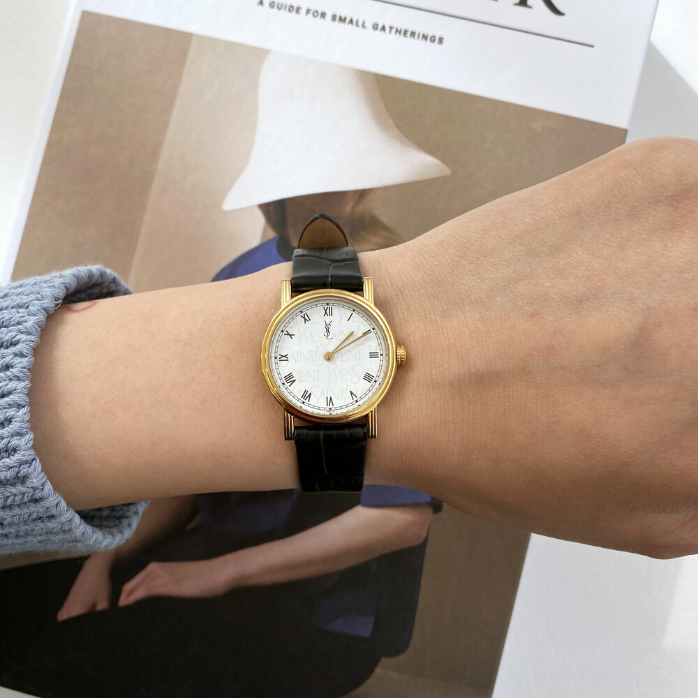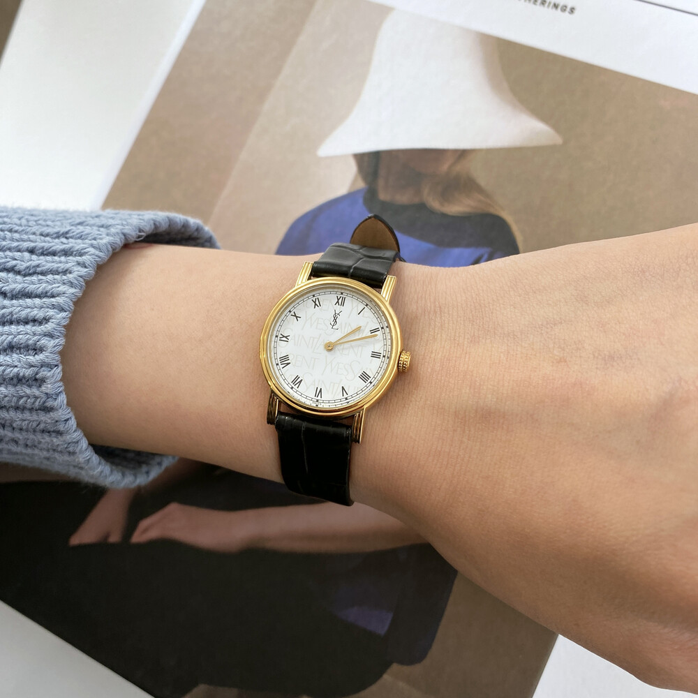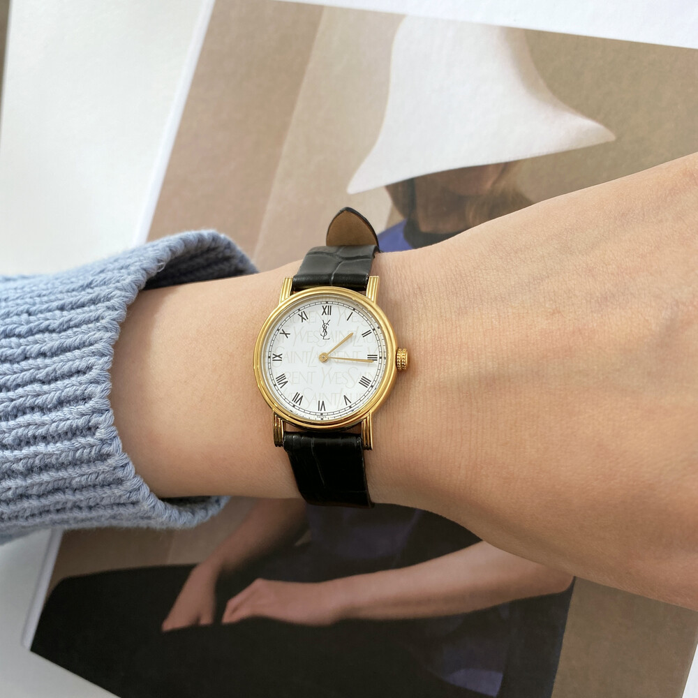 골드톤 라운드 케이스와 화이트 베젤 위를 장식하는 생로랑 YSL 시그니처가 매력적인 모델입니다.