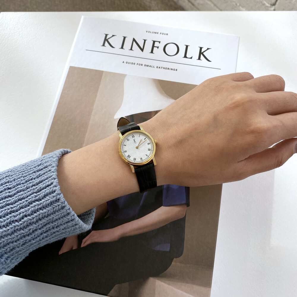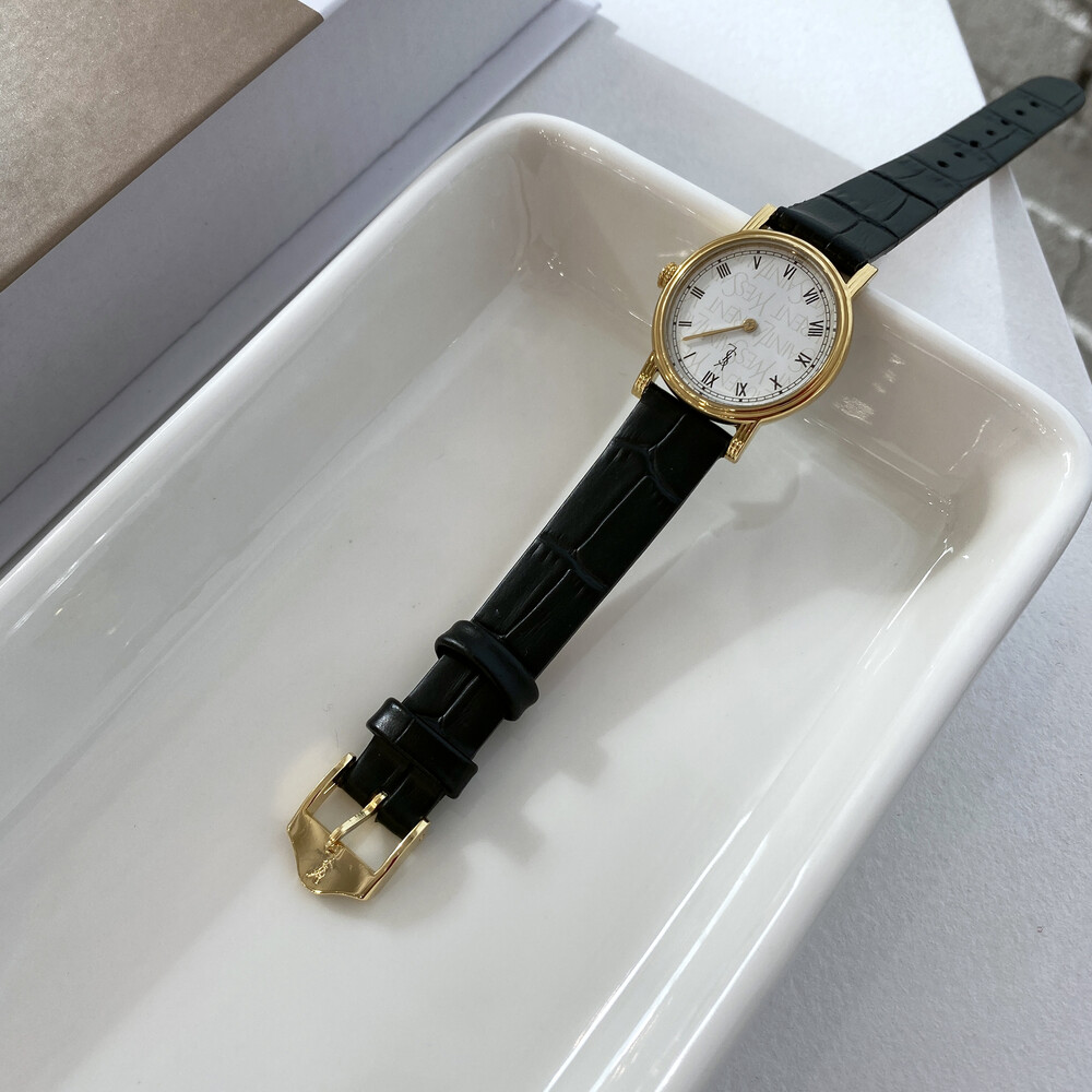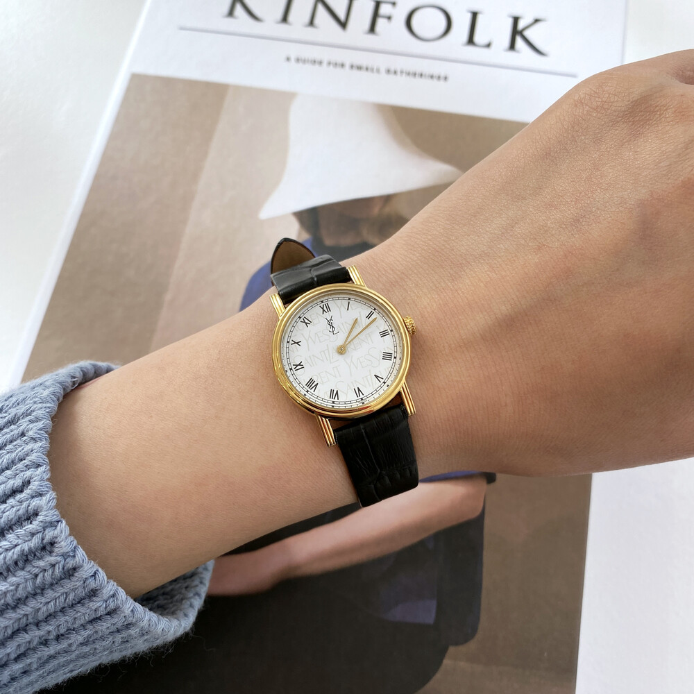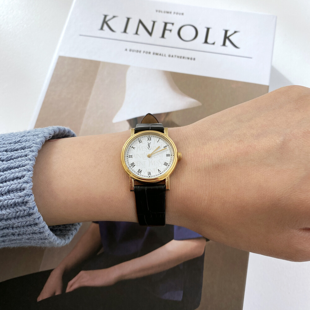 골드톤 라운드 케이스와 화이트 베젤 위를 장식하는 생로랑 YSL 시그니처가 매력적인 모델입니다.