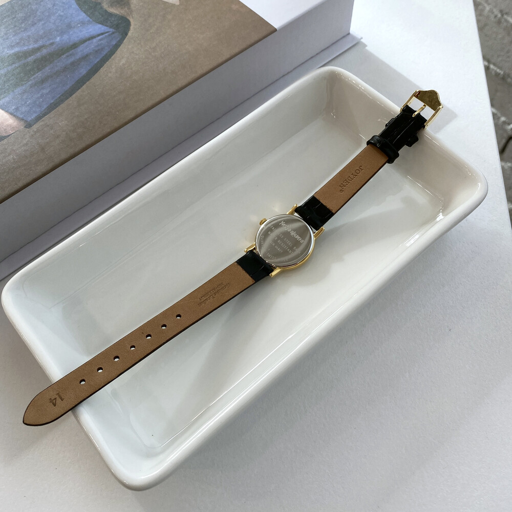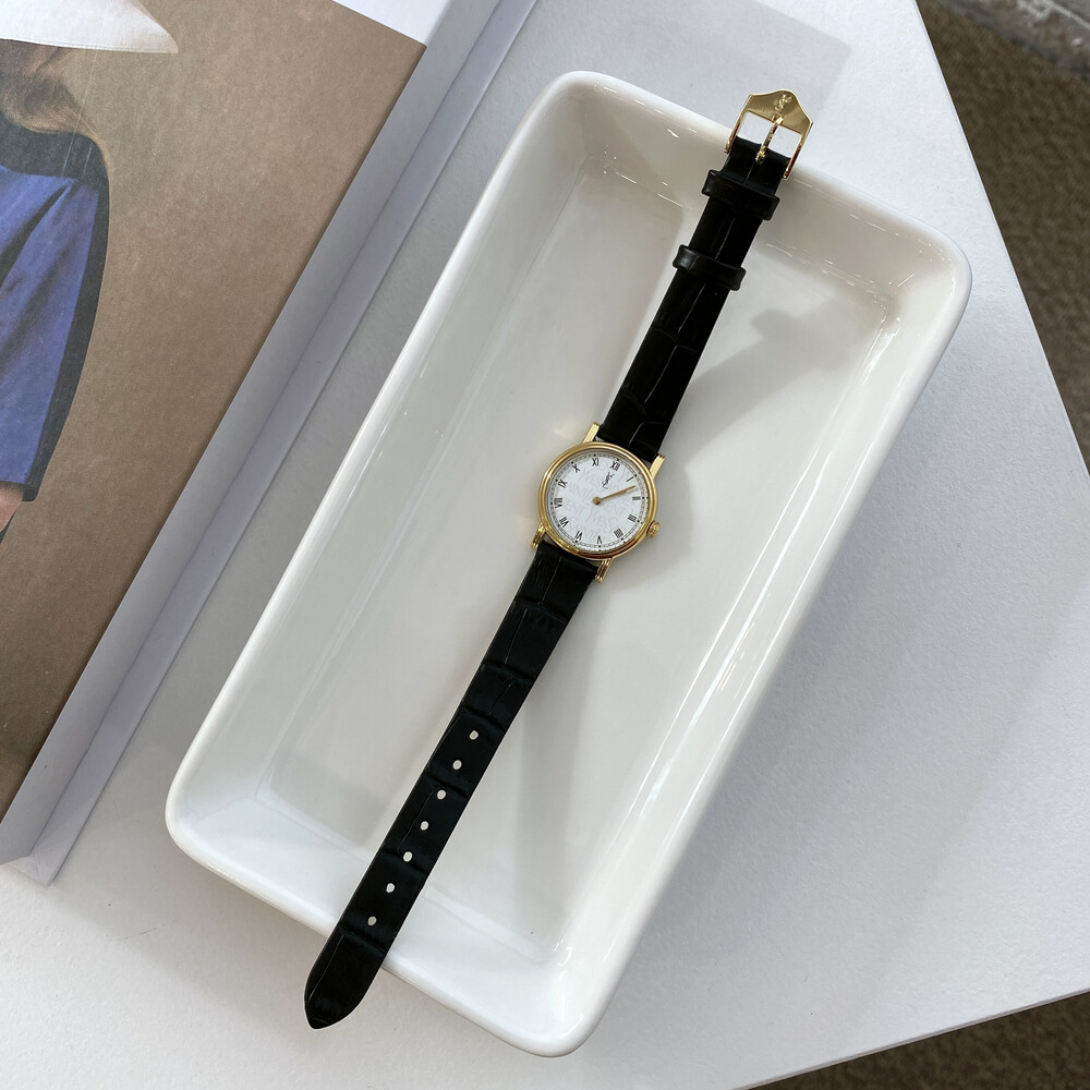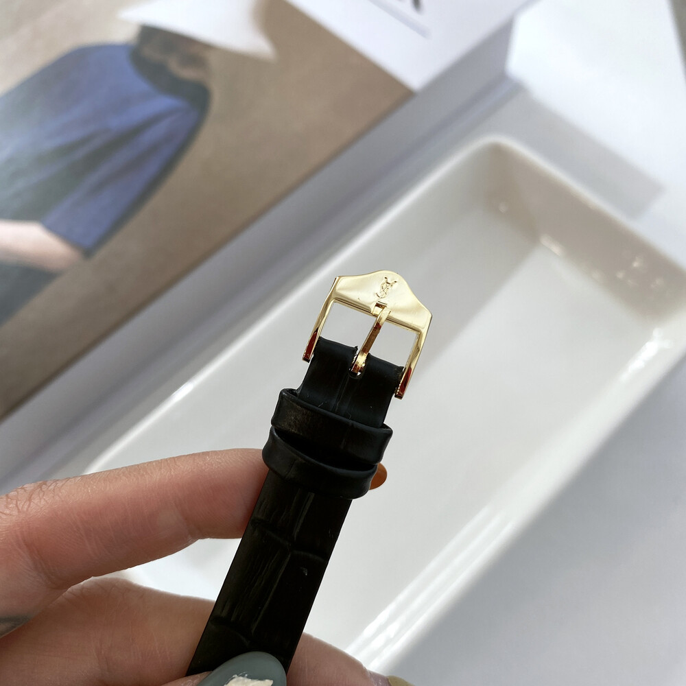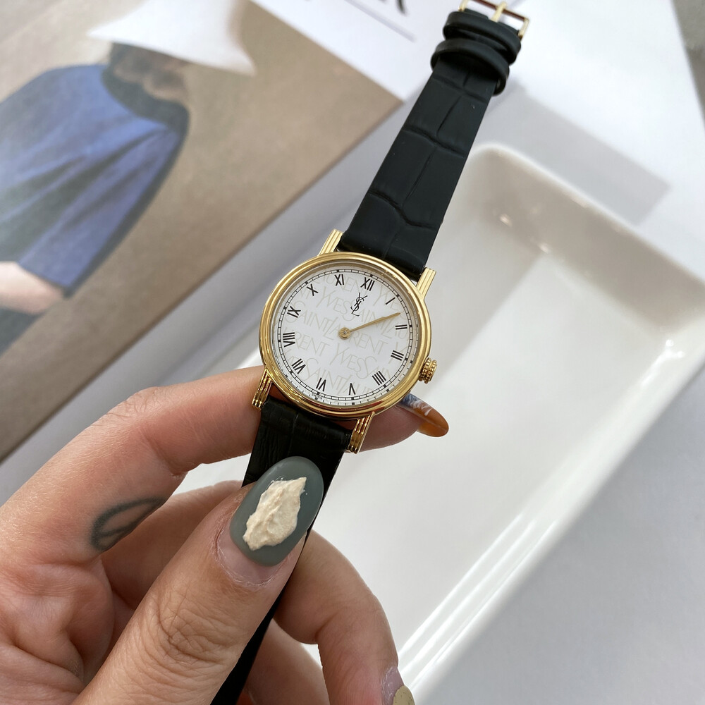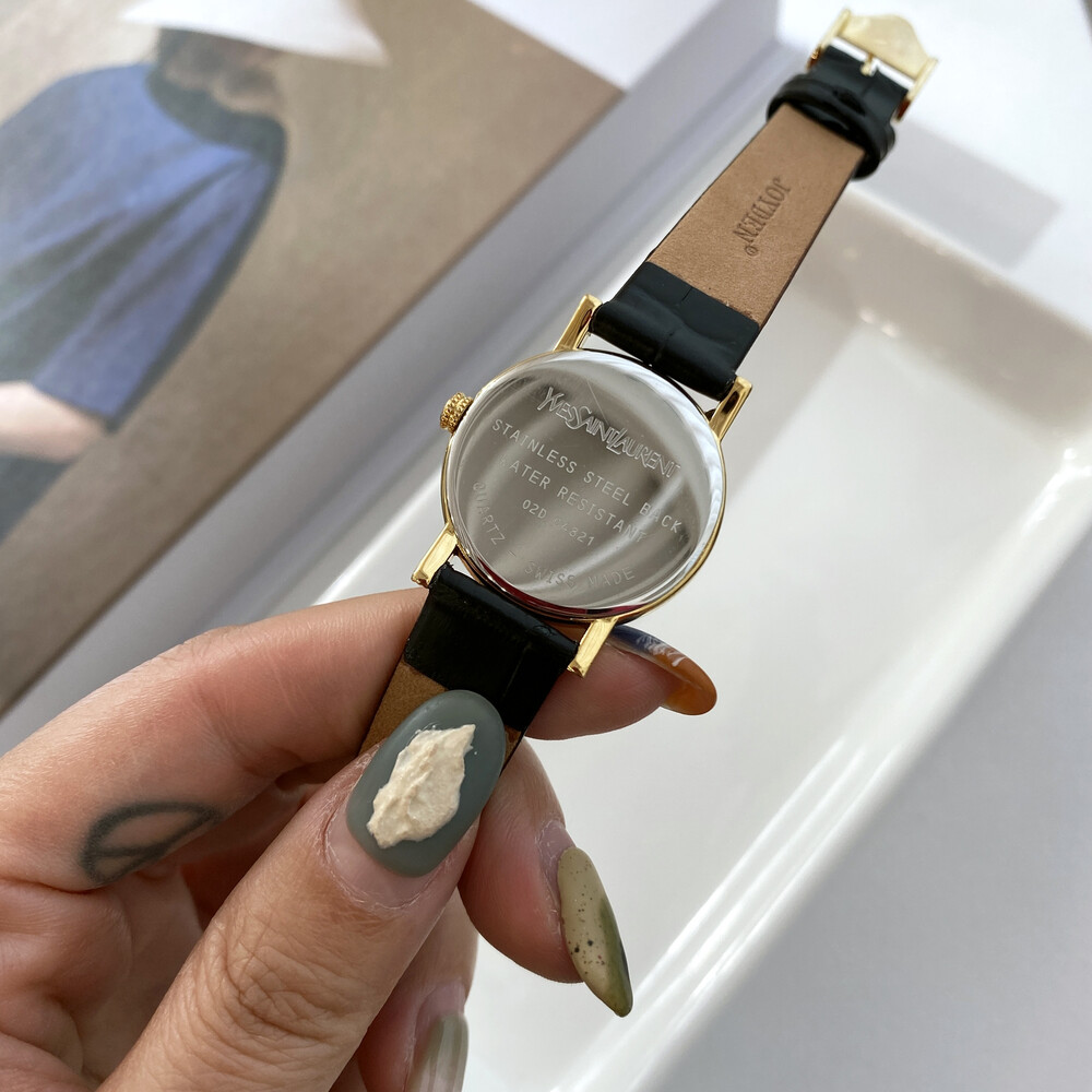 골드톤 라운드 케이스와 화이트 베젤 위를 장식하는 생로랑 YSL 시그니처가 매력적인 모델입니다.