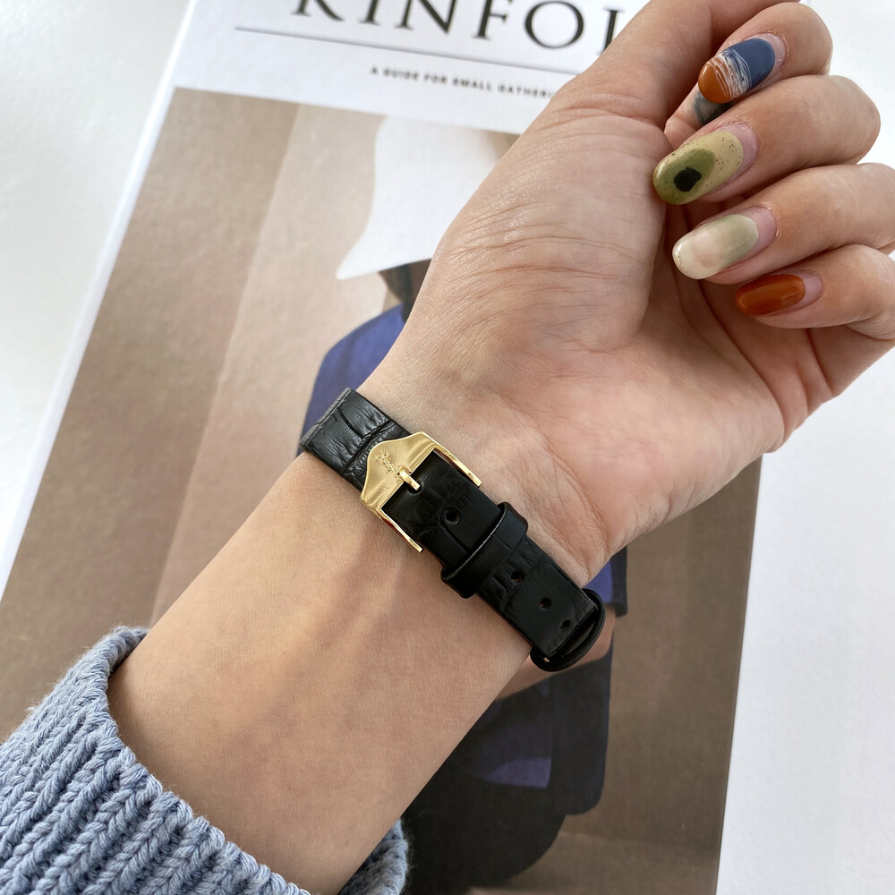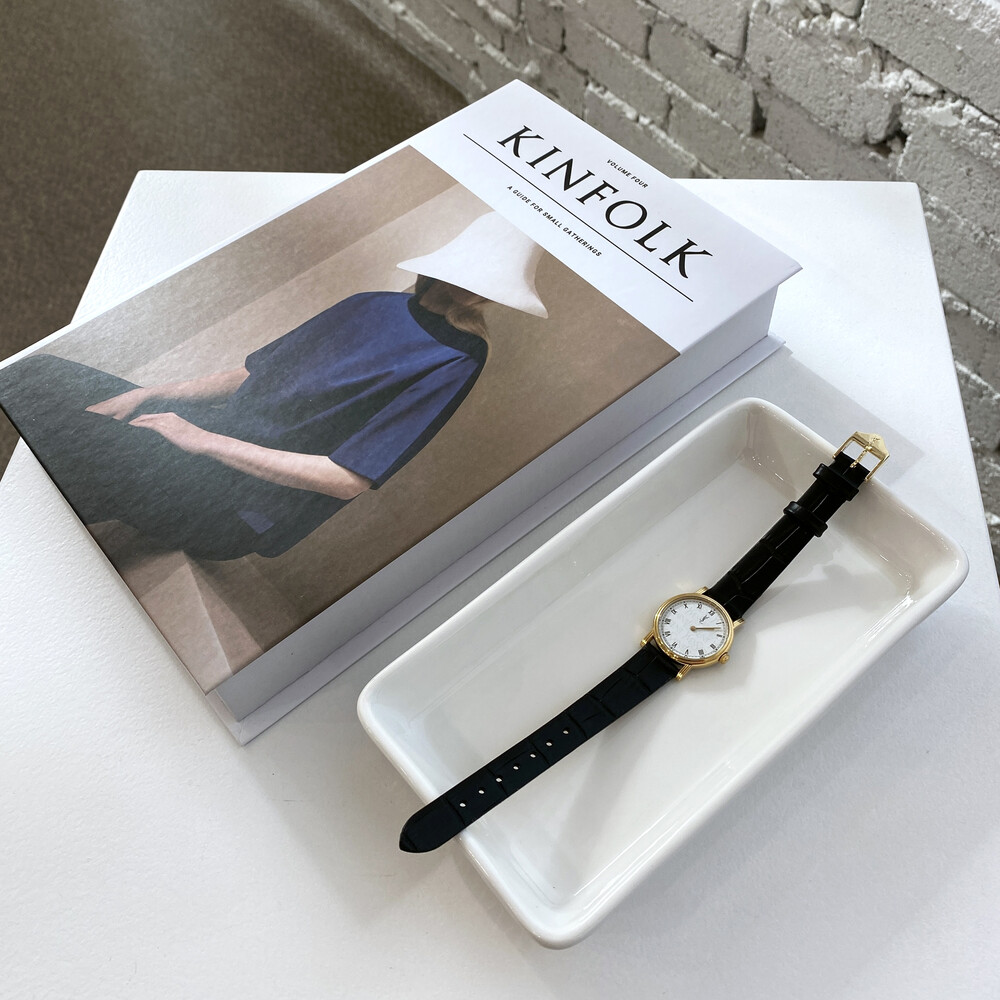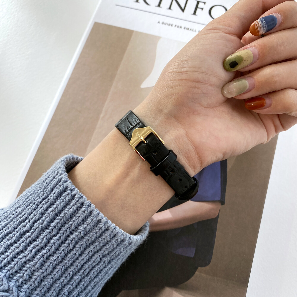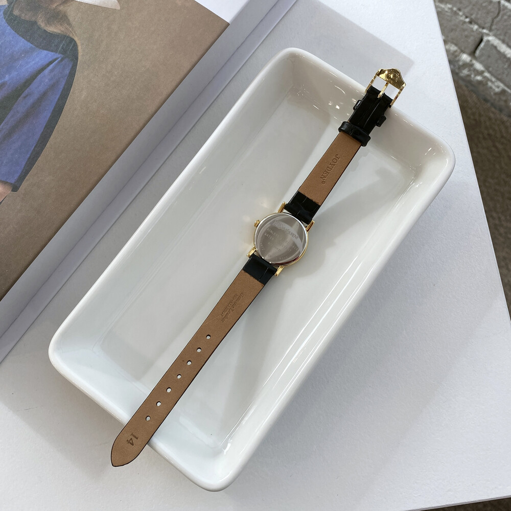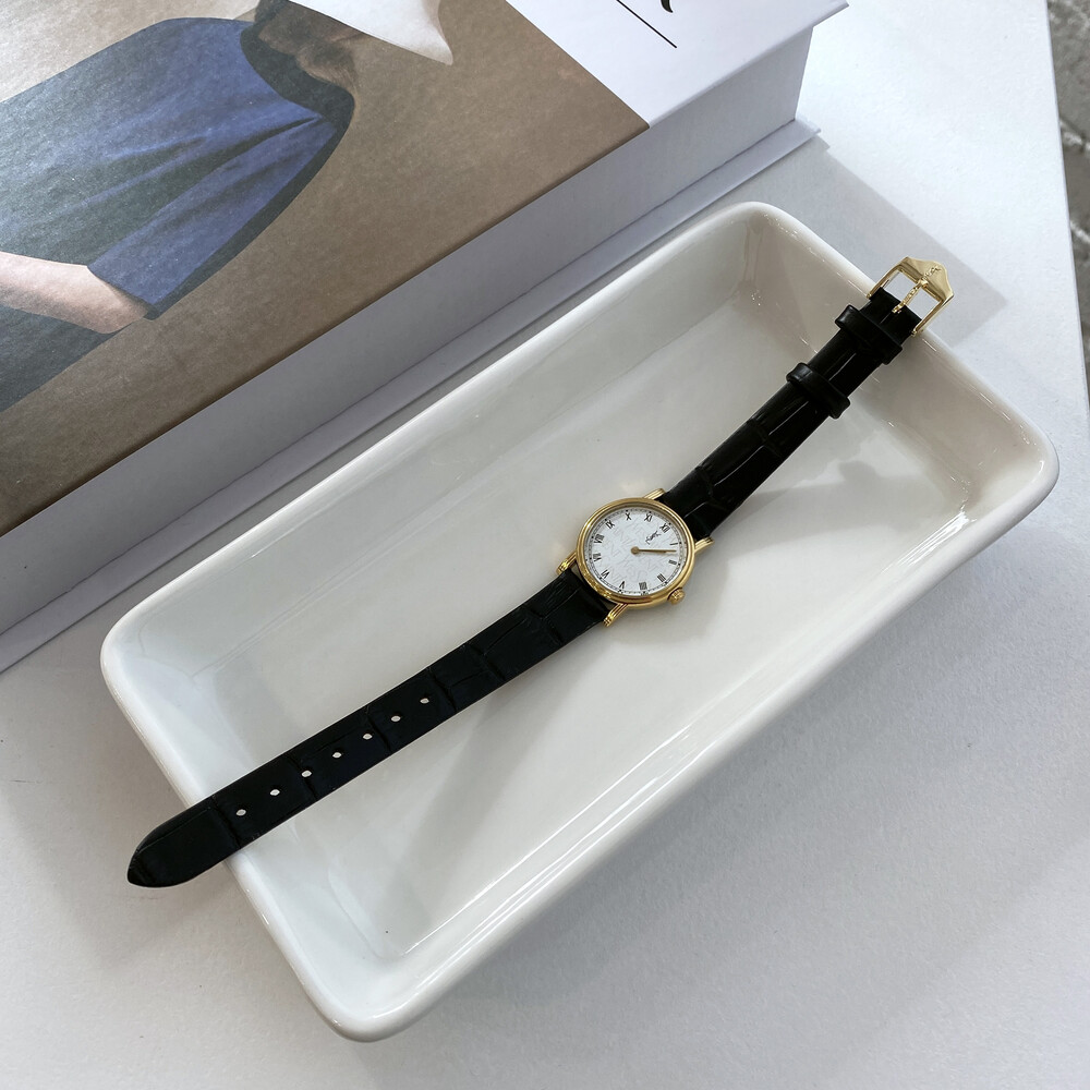 골드톤 라운드 케이스와 화이트 베젤 위를 장식하는 생로랑 YSL 시그니처가 매력적인 모델입니다.