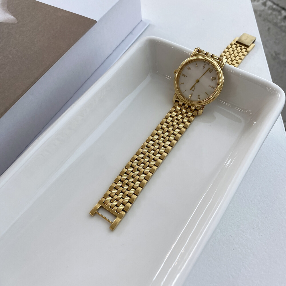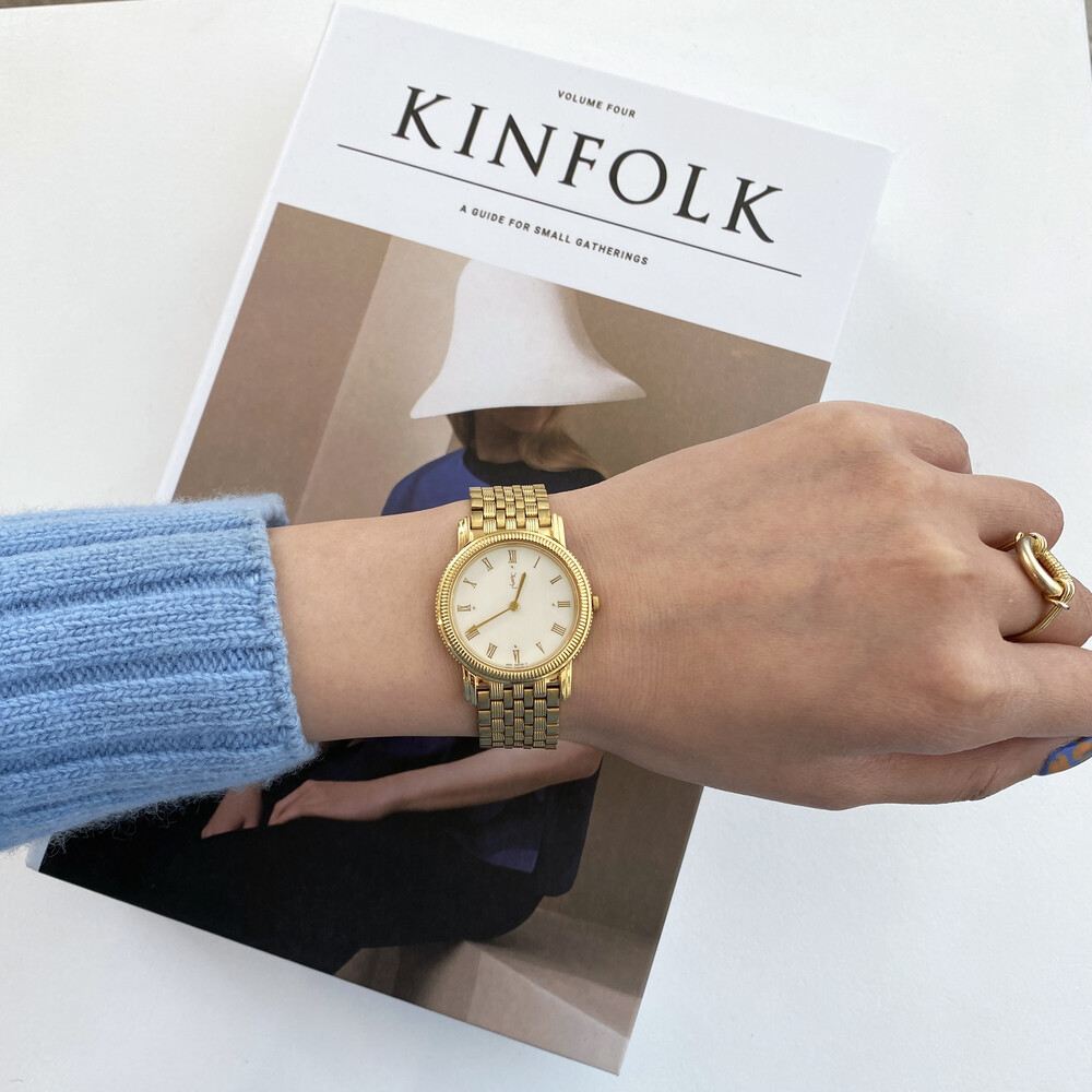 골드 톤 케이스와 화이트 톤의 다이얼 위를 장식하는