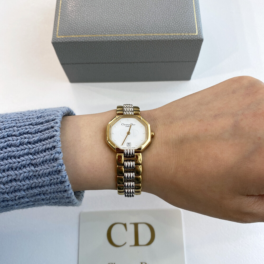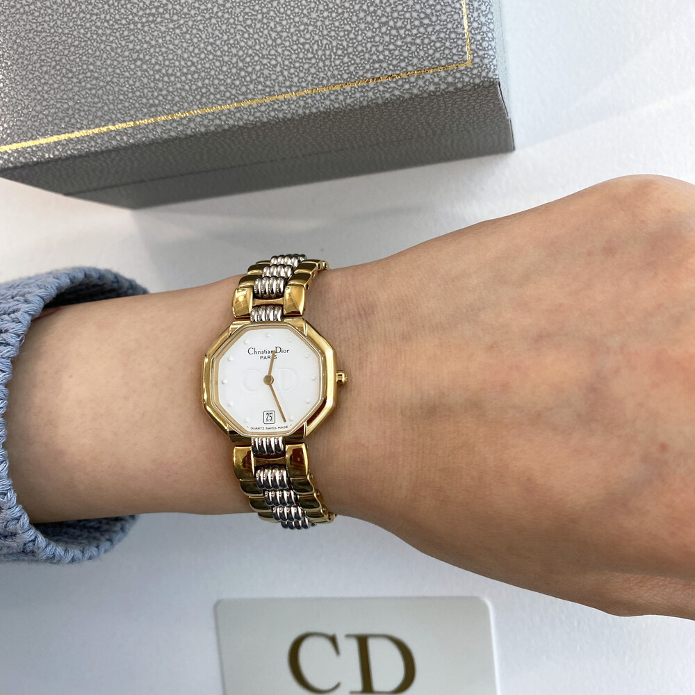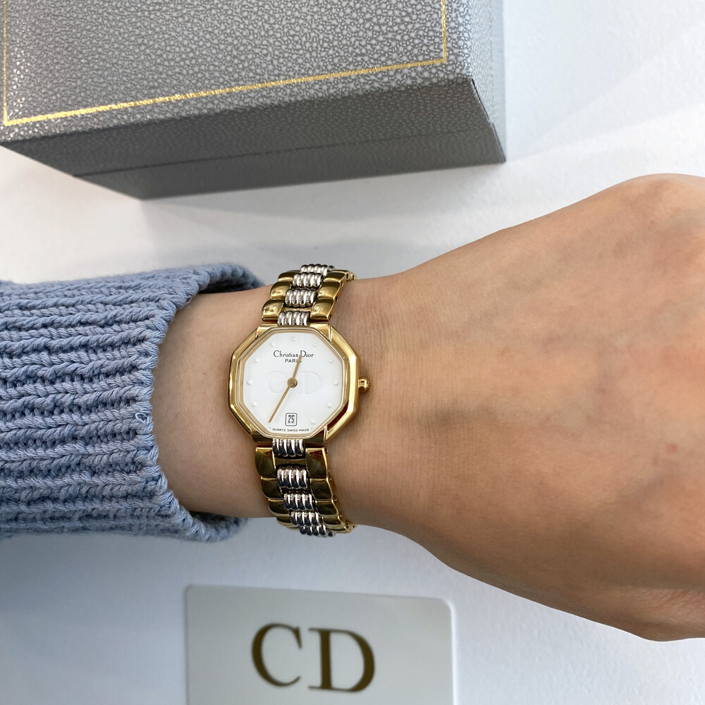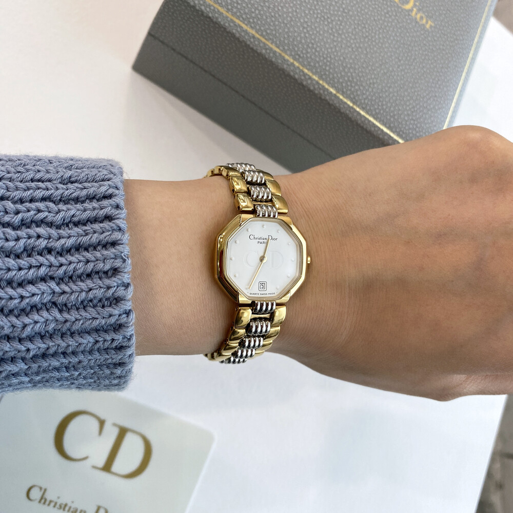옥타곤 타입의 투톤 케이스와 화이트 다이얼 위의 디올 CD 심볼이 매력적인 모델입니다.