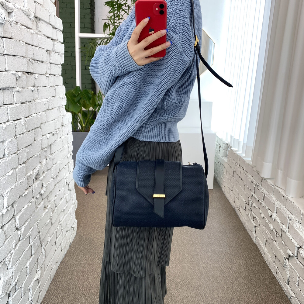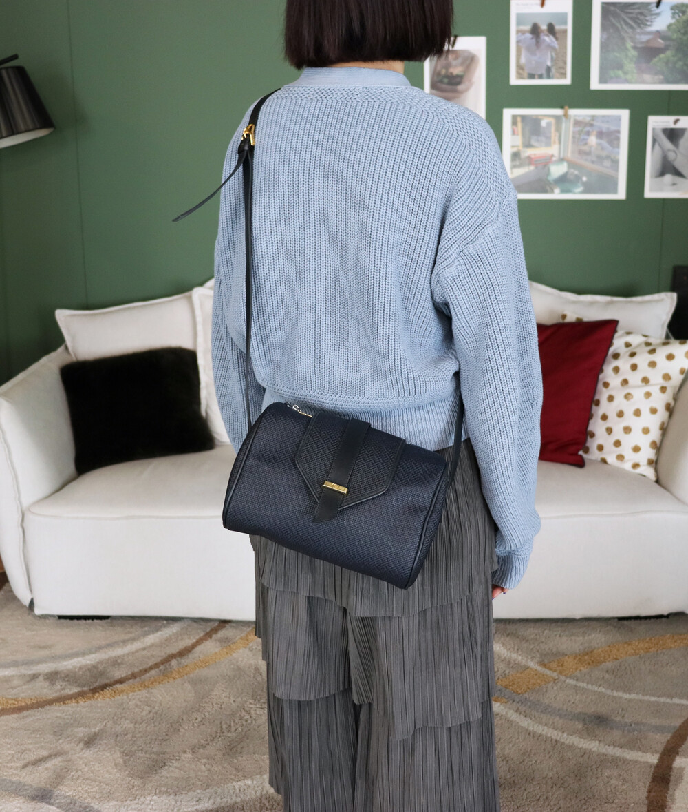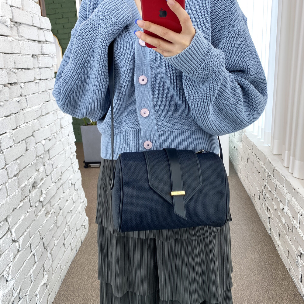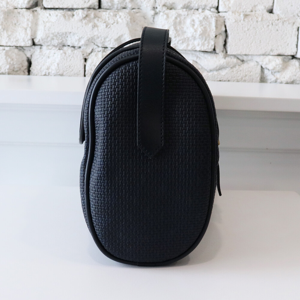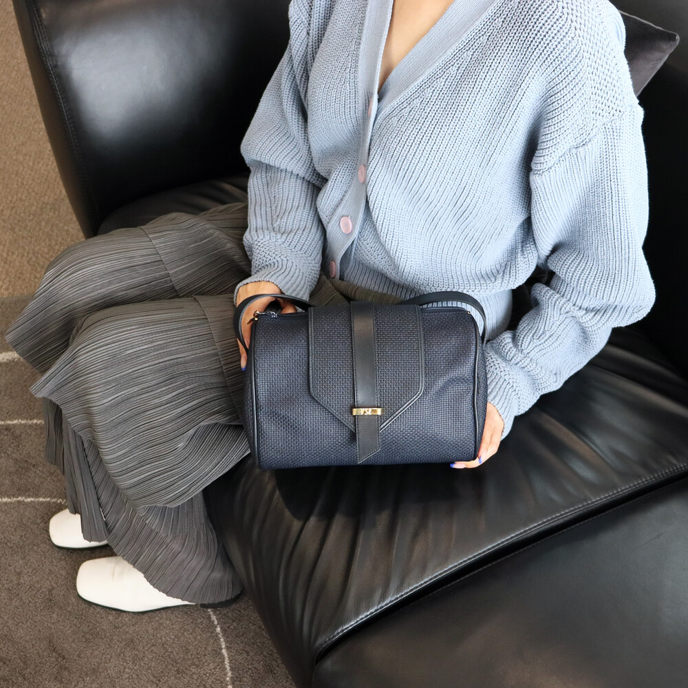 부드러운 평직 패턴의 PVC 바디와 시크한 네이비 톤의 가죽 트림,