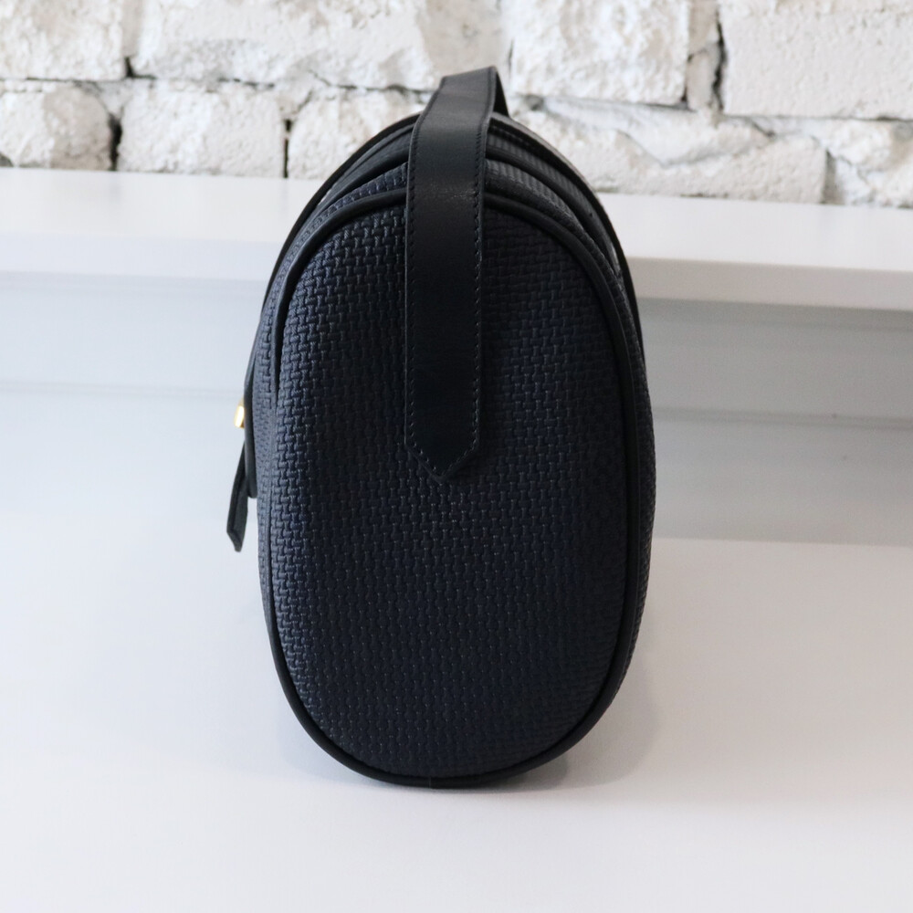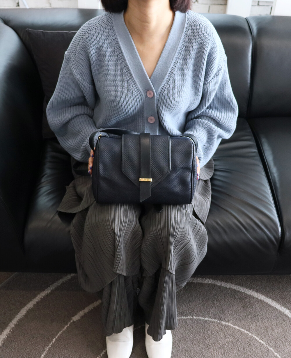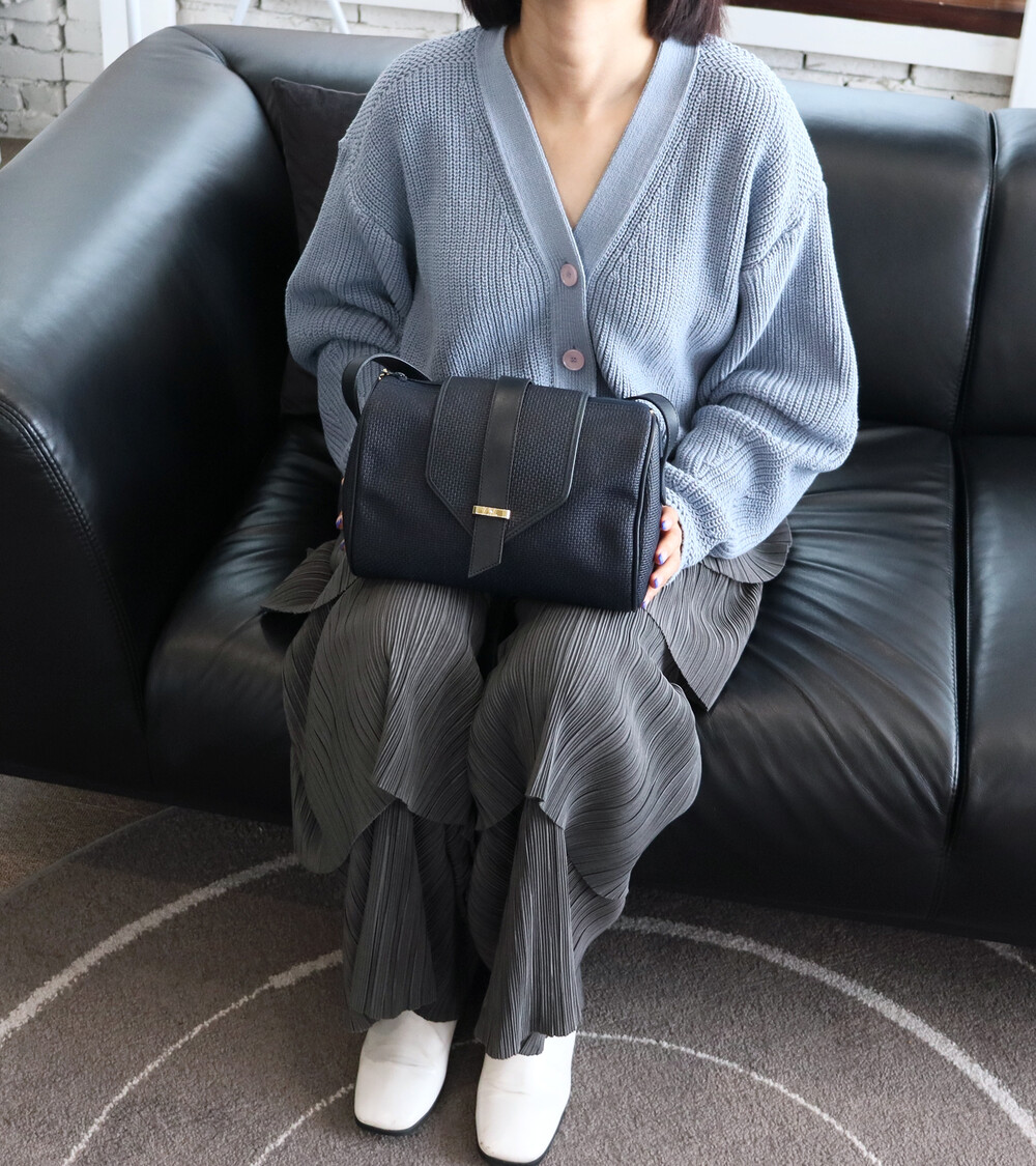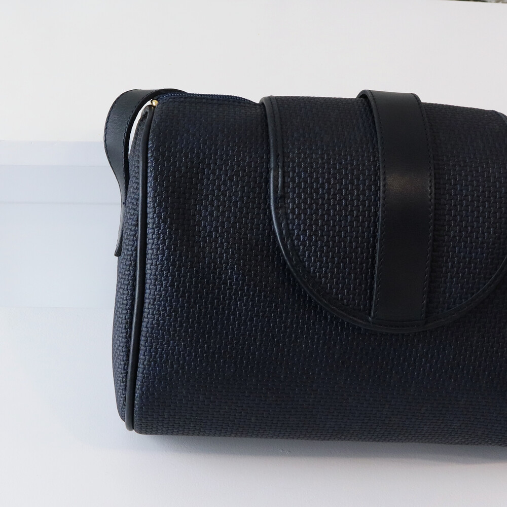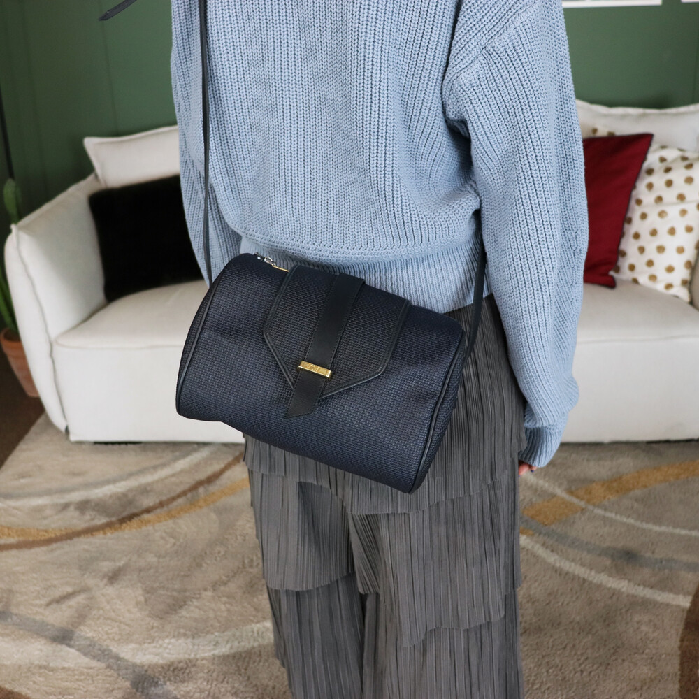 부드러운 평직 패턴의 PVC 바디와 시크한 네이비 톤의 가죽 트림,