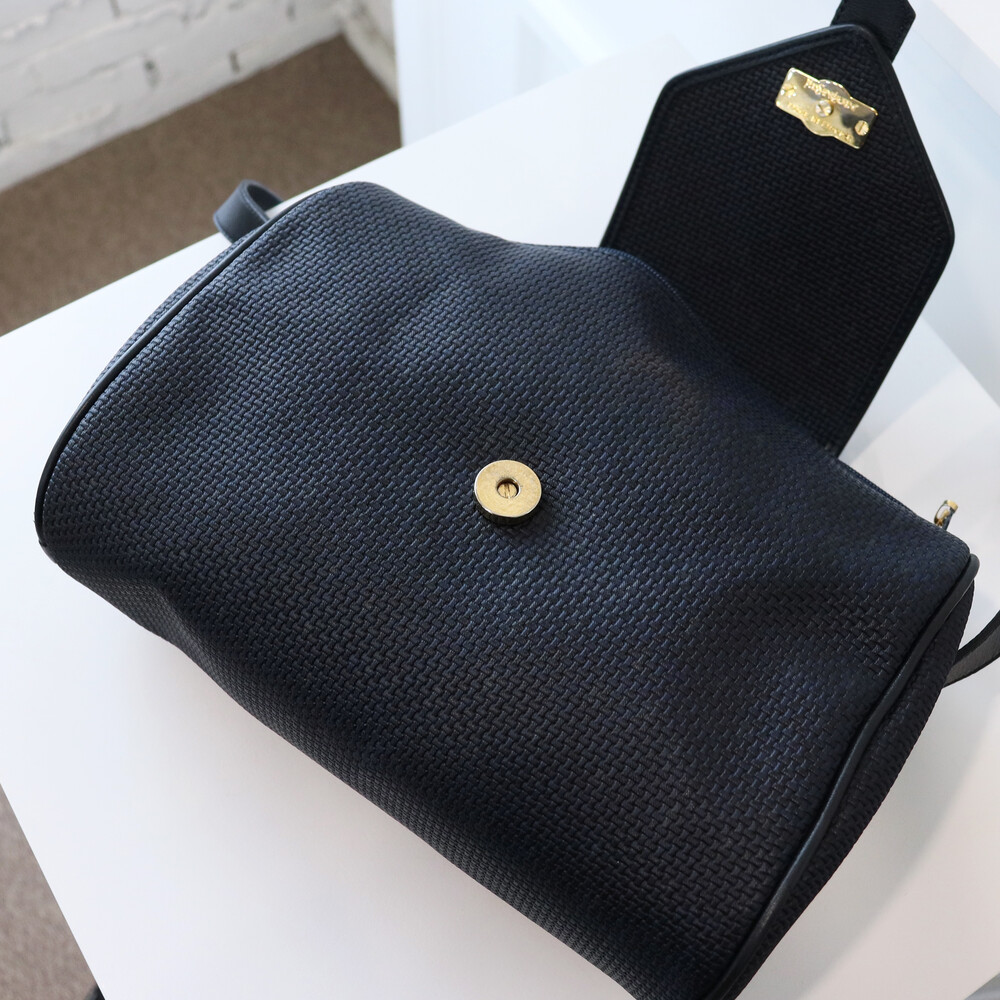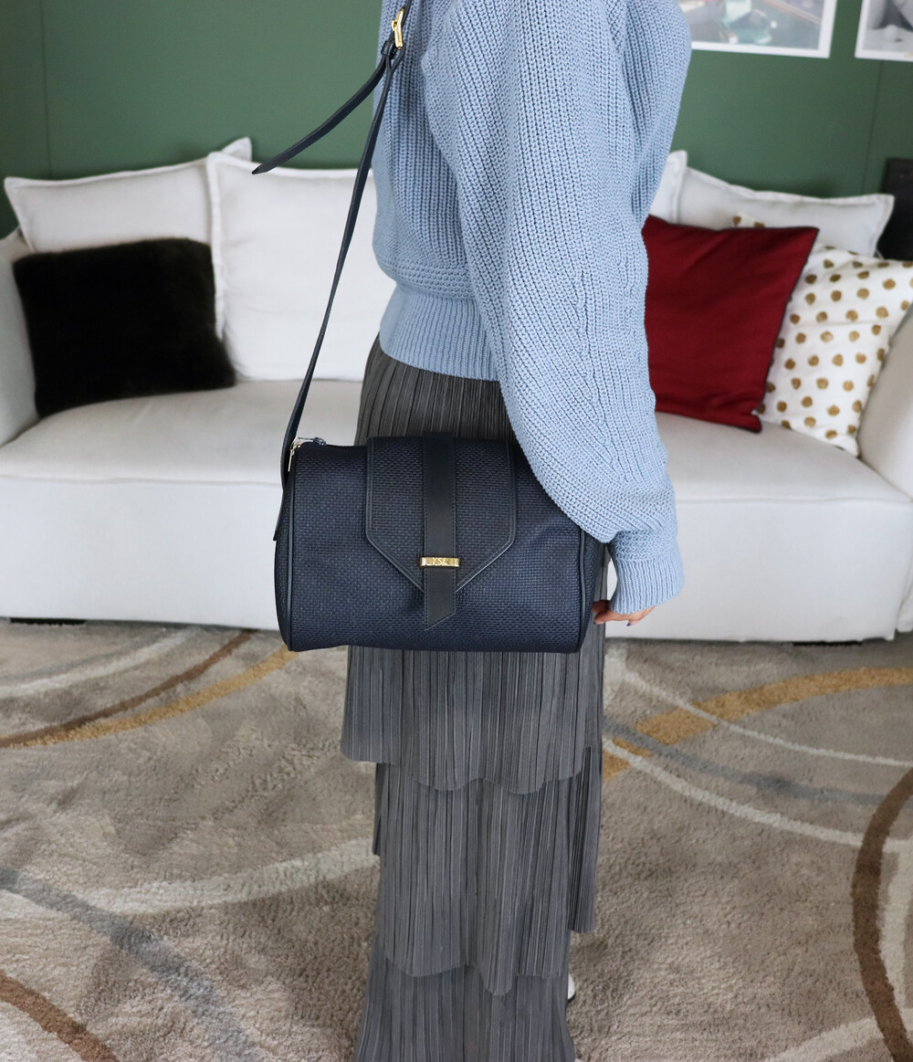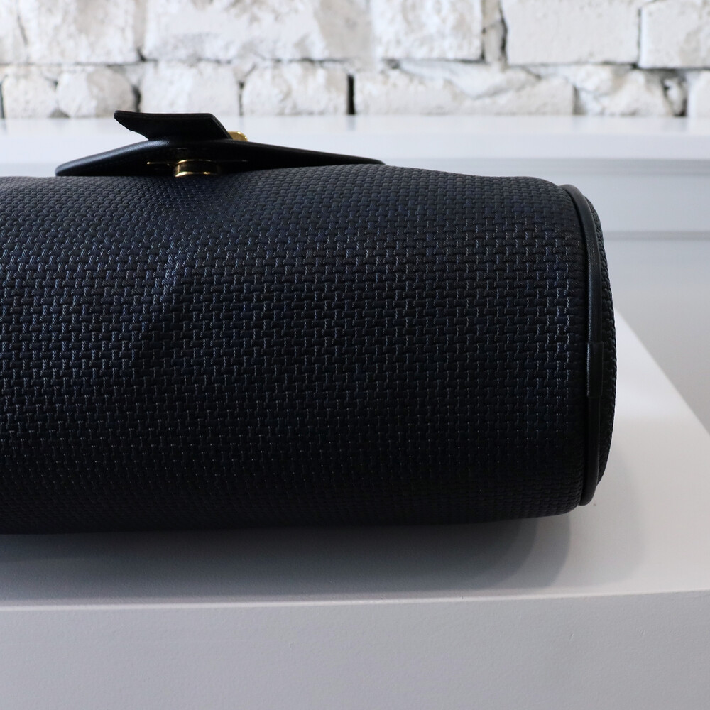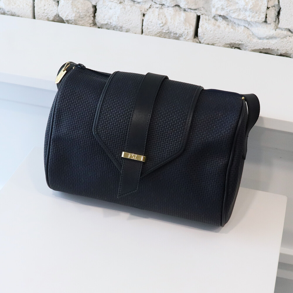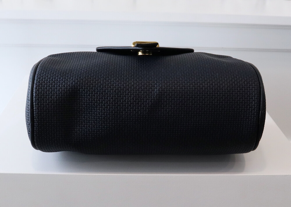 부드러운 평직 패턴의 PVC 바디와 시크한 네이비 톤의 가죽 트림,