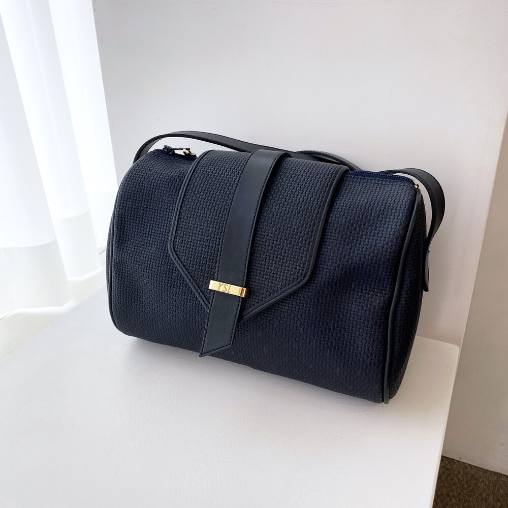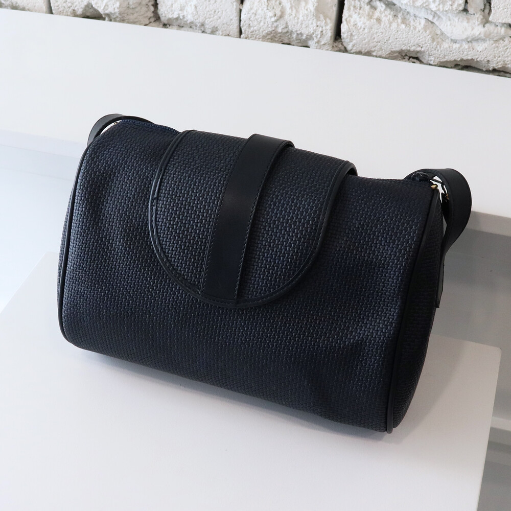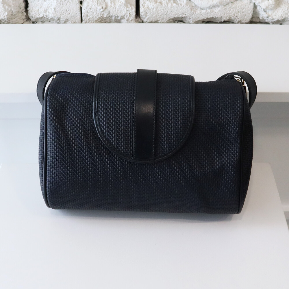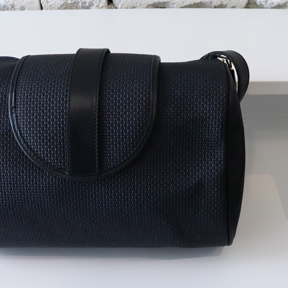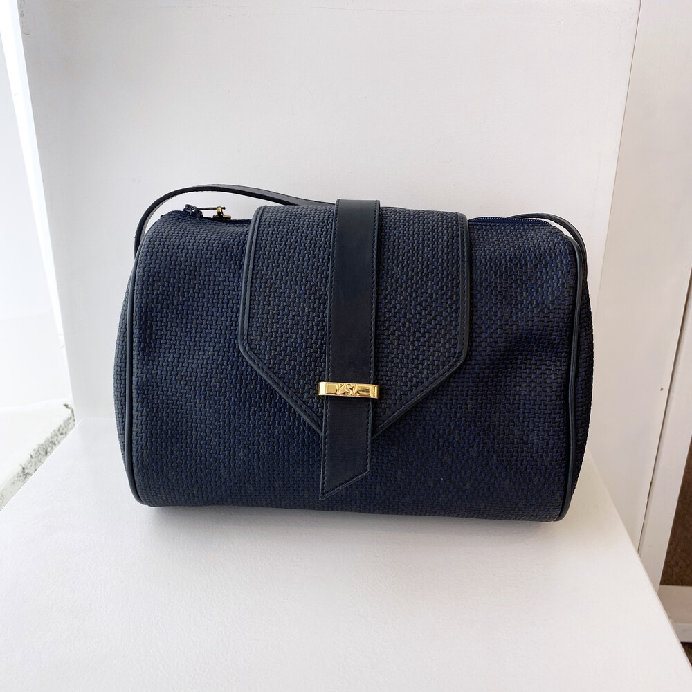 부드러운 평직 패턴의 PVC 바디와 시크한 네이비 톤의 가죽 트림,