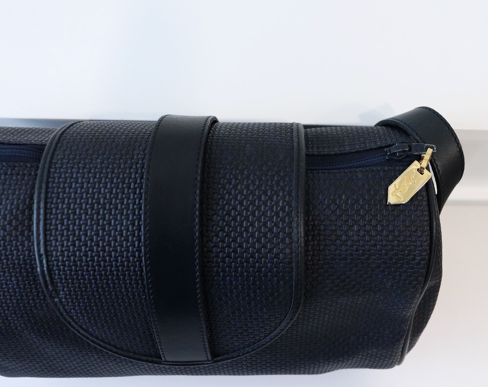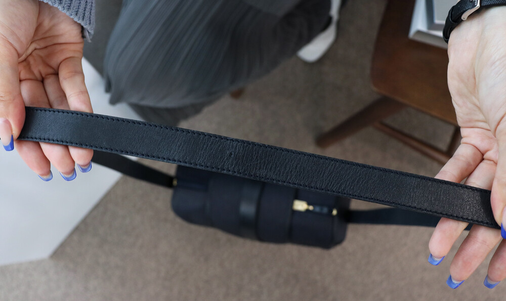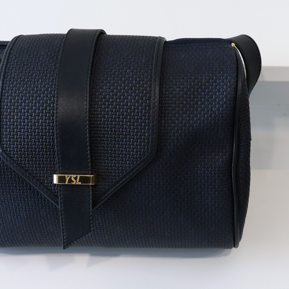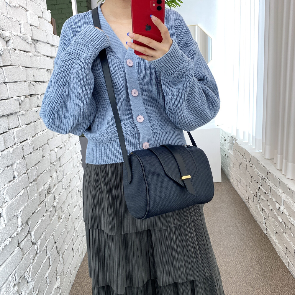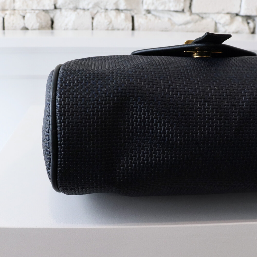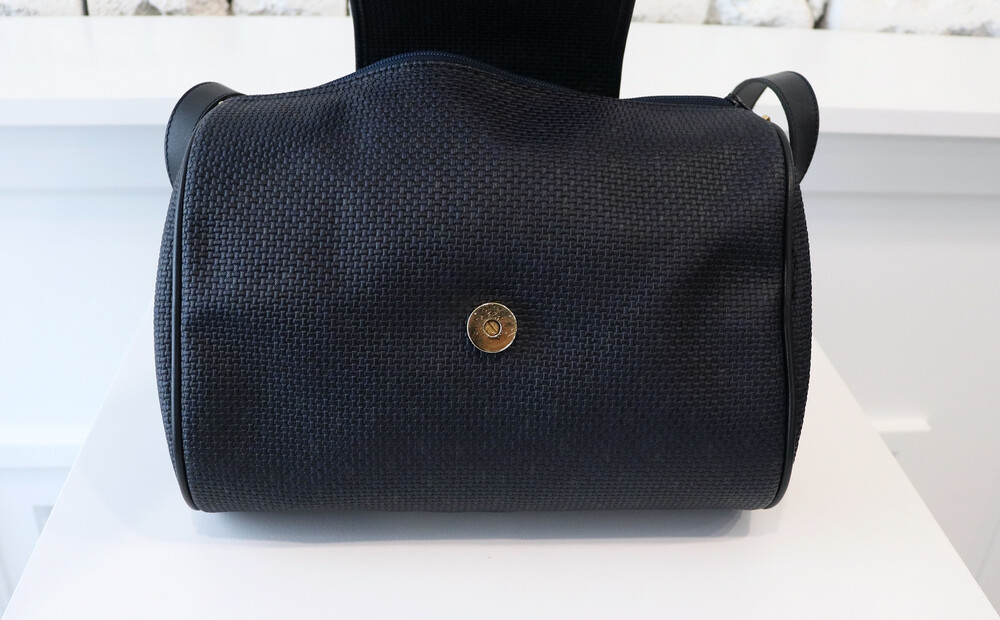 부드러운 평직 패턴의 PVC 바디와 시크한 네이비 톤의 가죽 트림,
