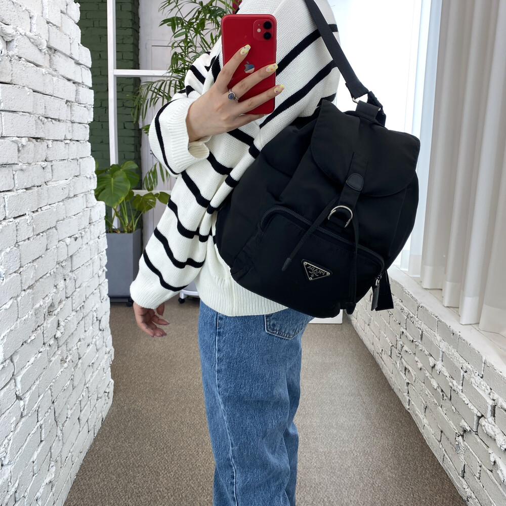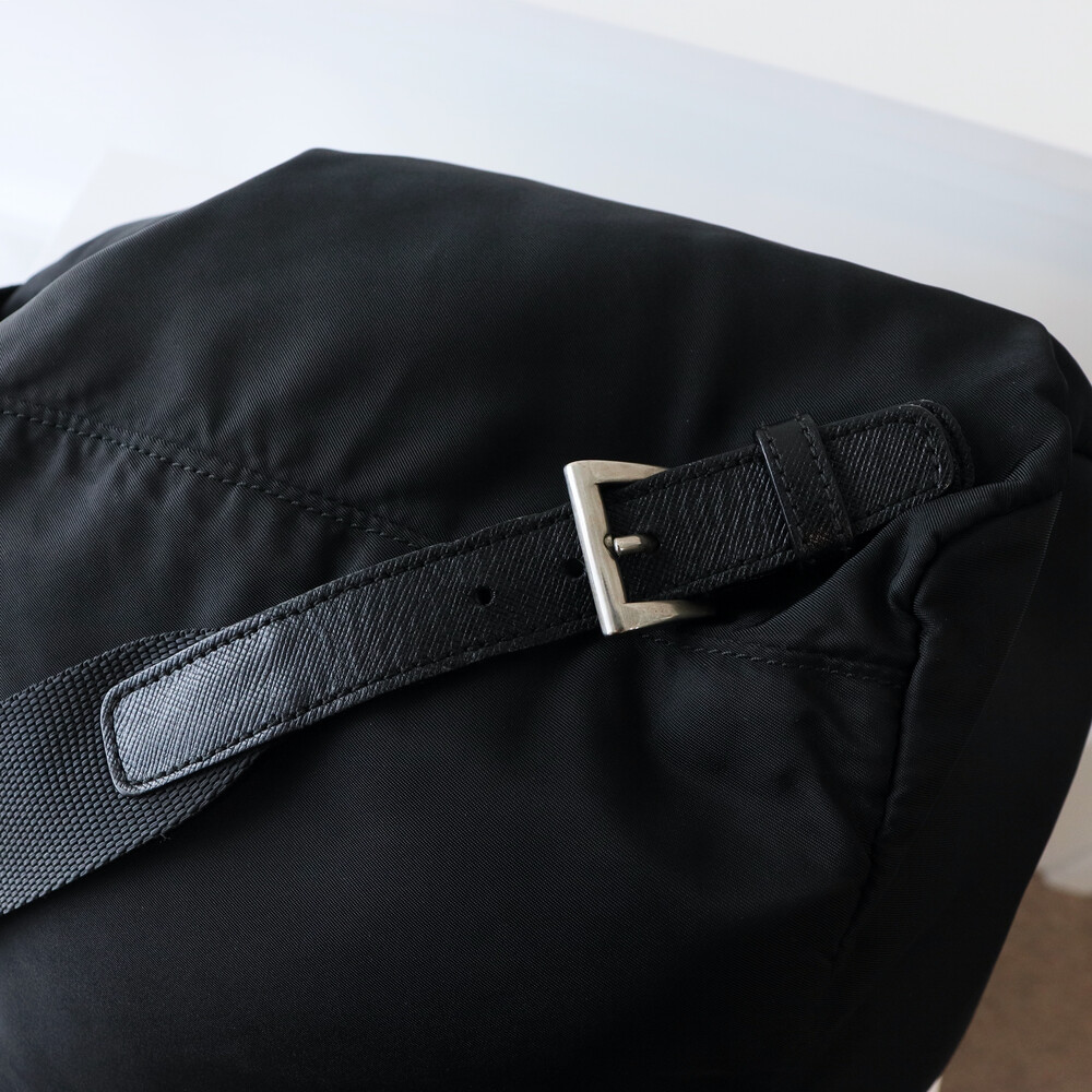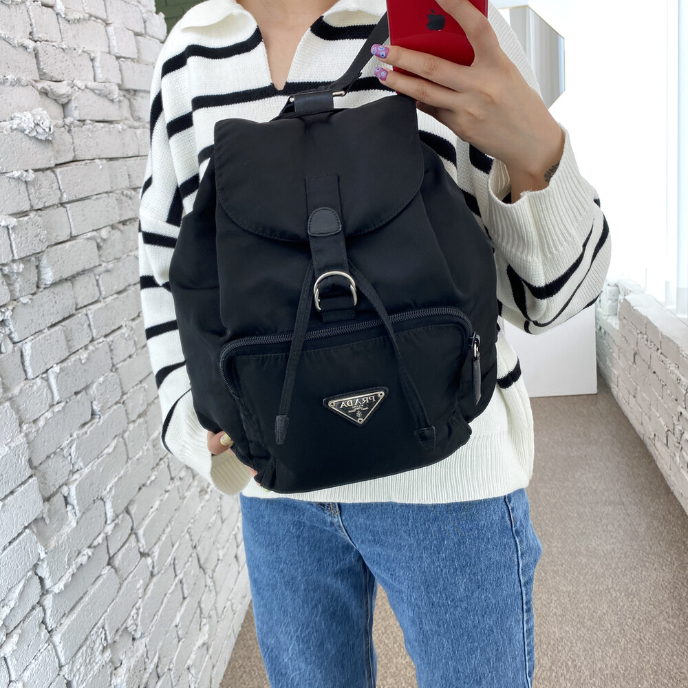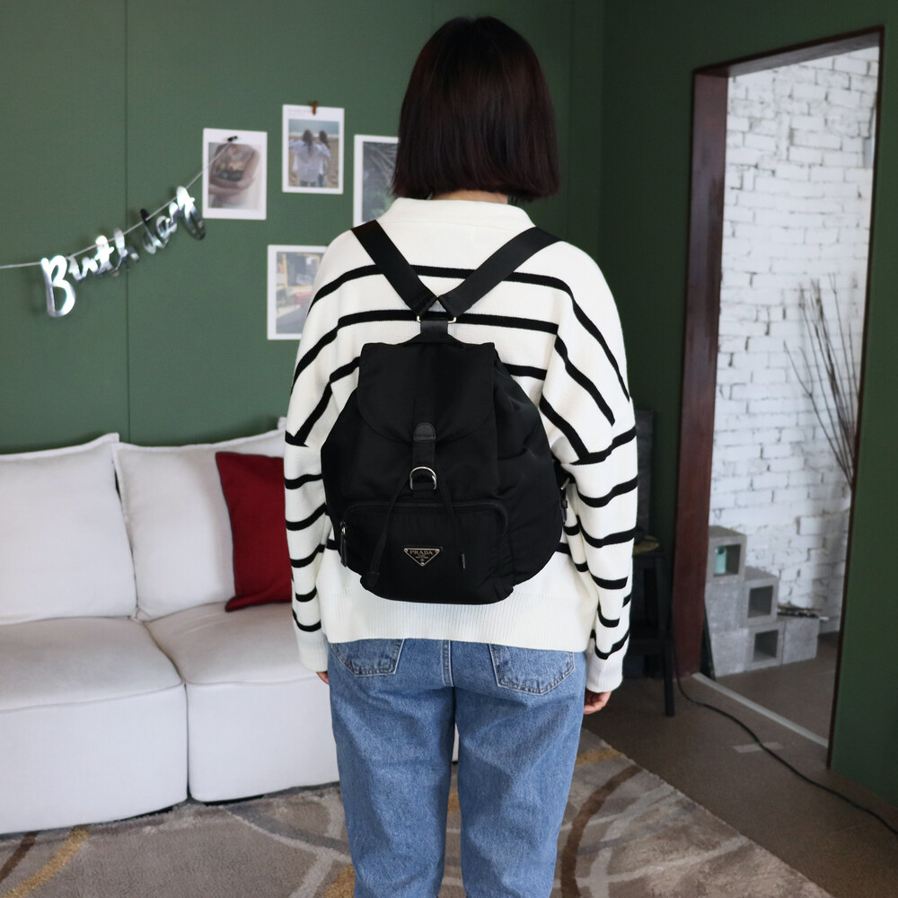 프라다 헤리티지 나일론 바디와 프라다 삼각 플레이트 장식이 매력적인 모델입니다.