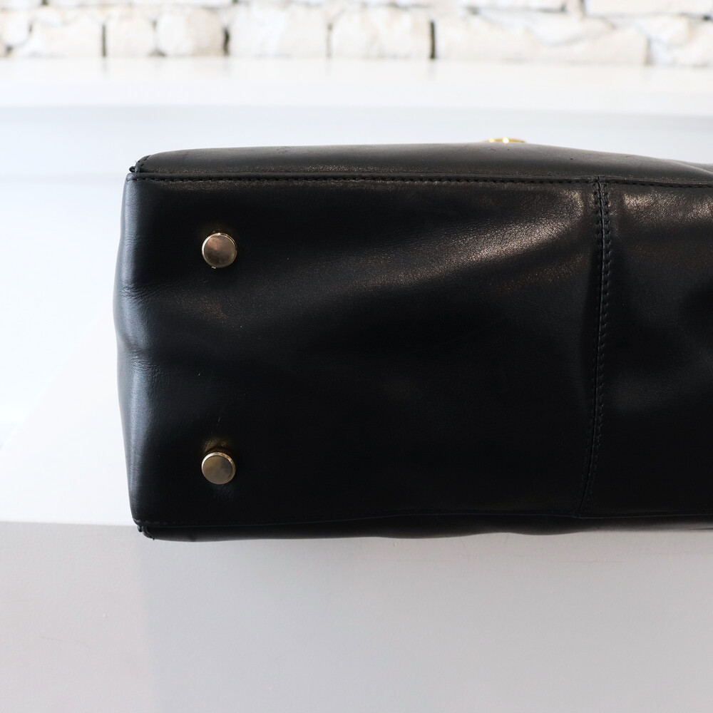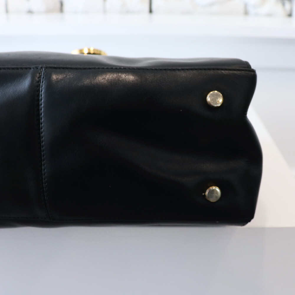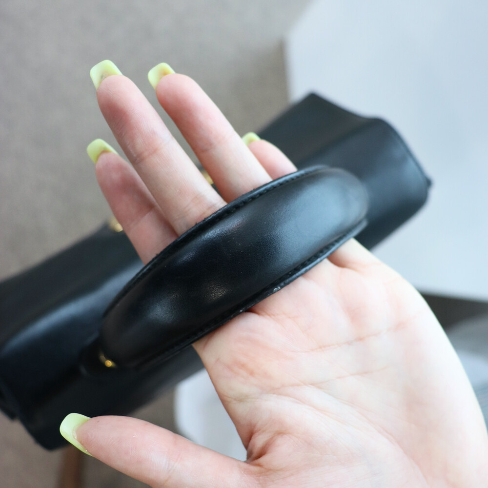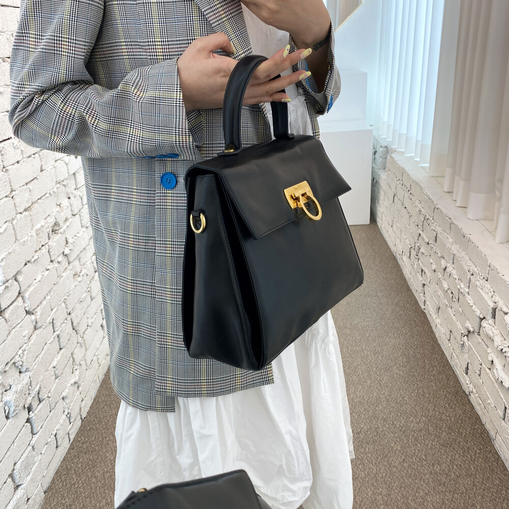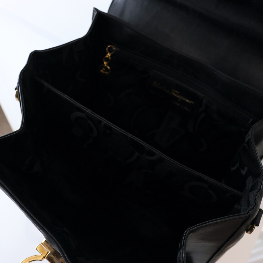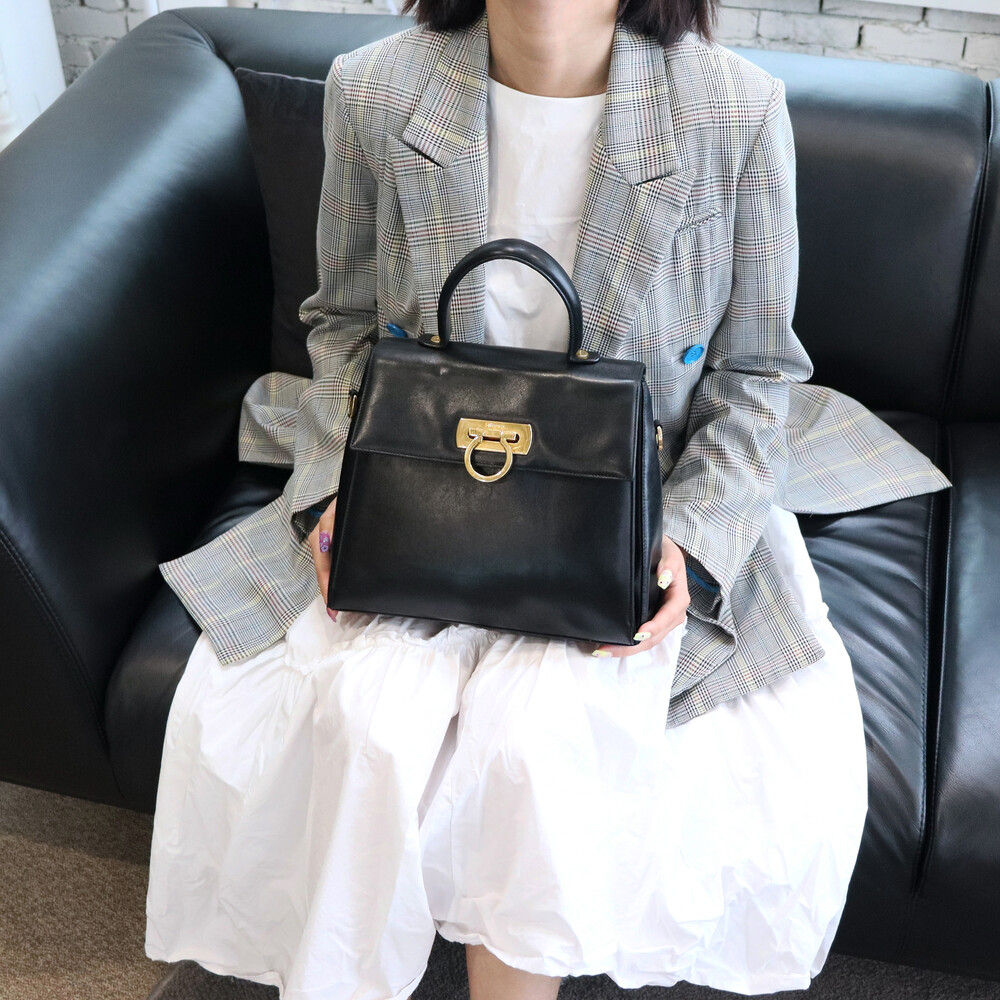 하드타입의 블랙 가죽 트림과 중앙의 페라가모 시그니처 간치니 장식이 매력적인 모델입니다.