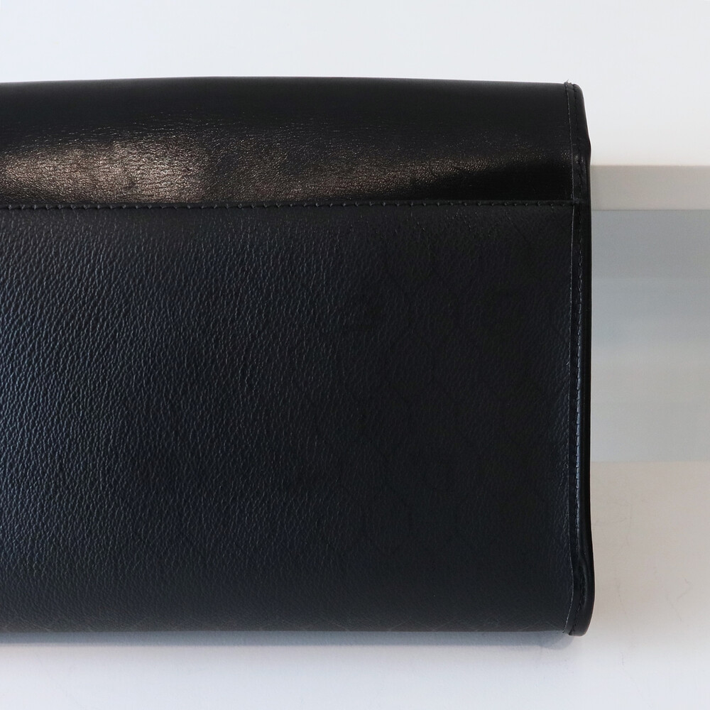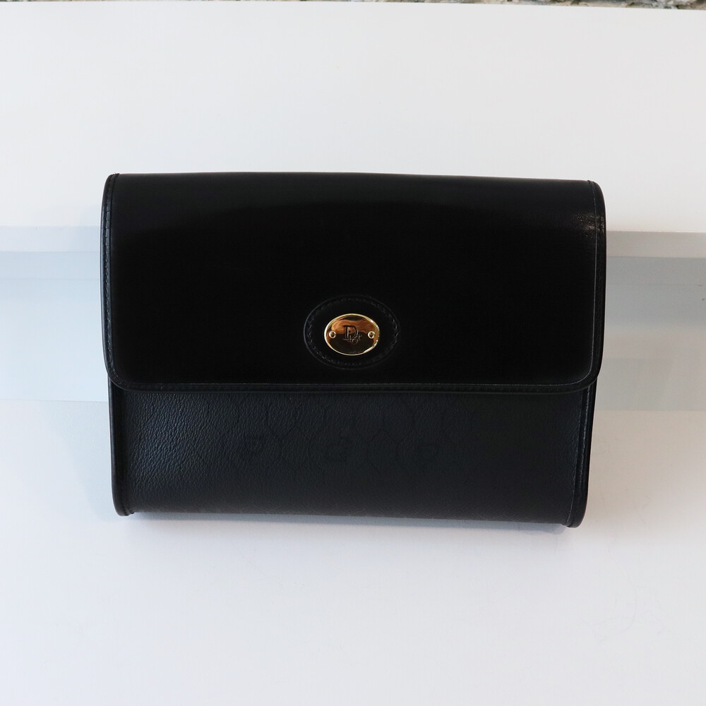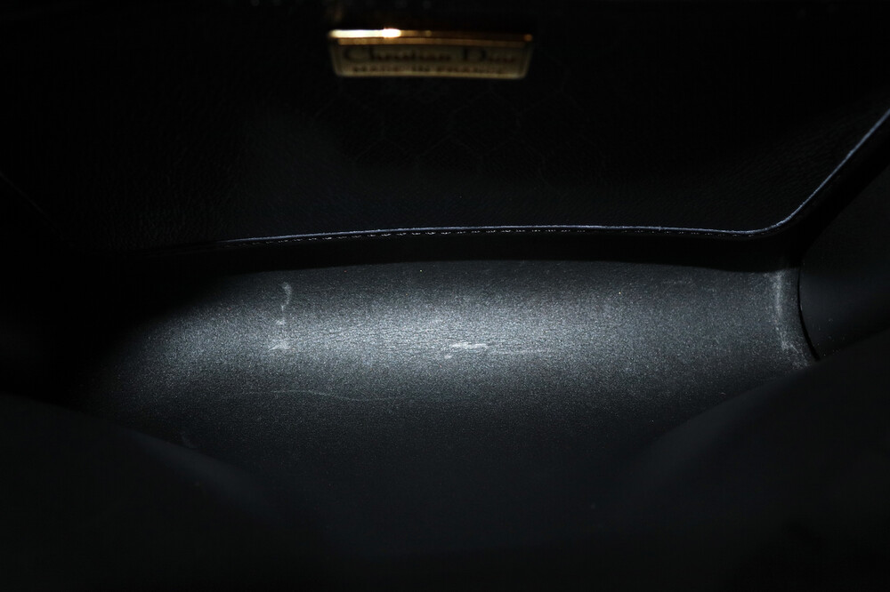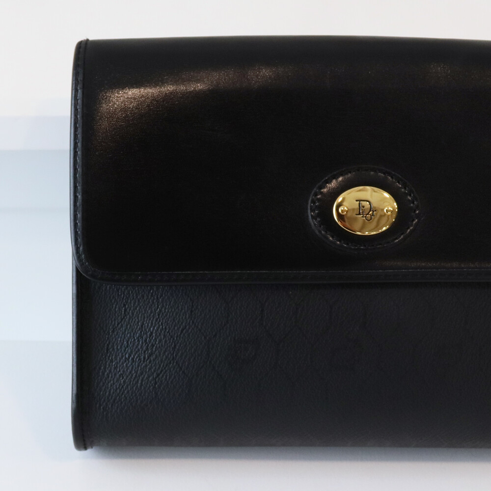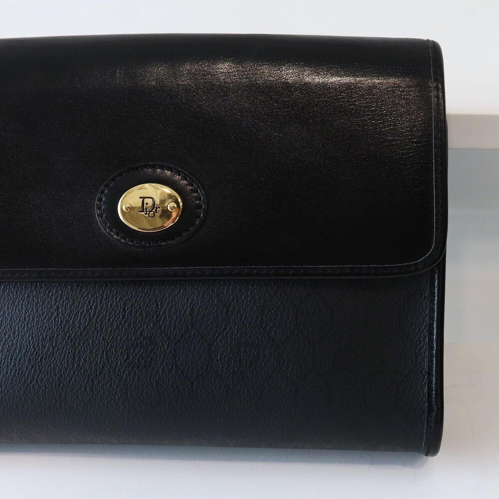 블랙 가죽 트림과 PVC 허니콤 패턴의 바디, 중앙의 디올 골드 심볼 장식이 돋보이는 제품입니다.
