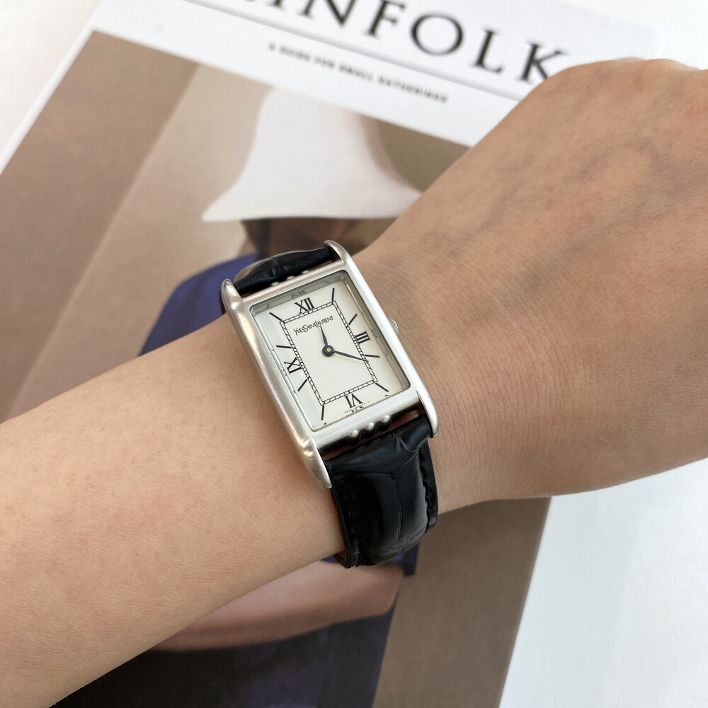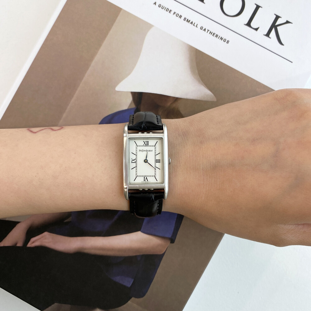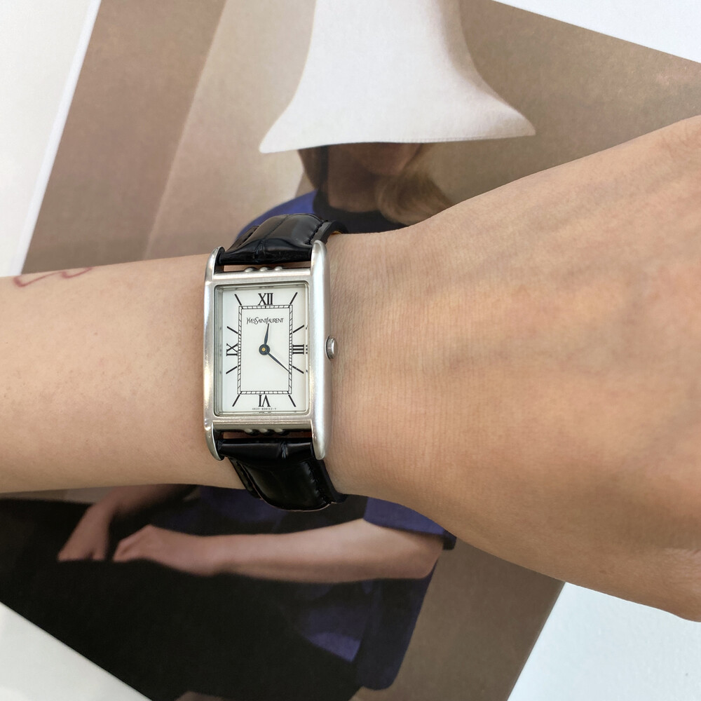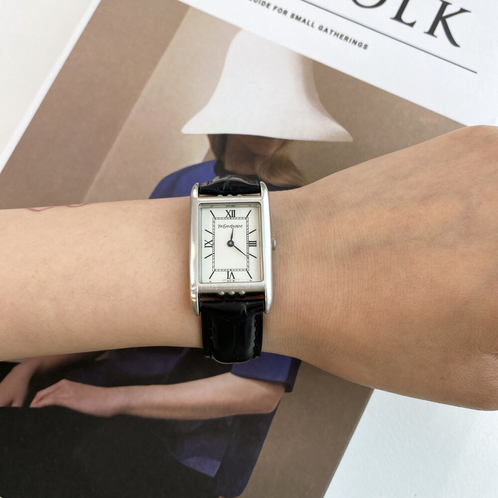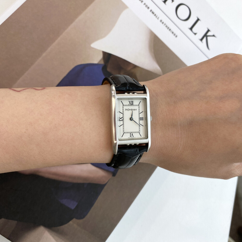 화이트 다이얼 위를 장식하는 입생로랑 로고가 매력적인 시계입니다.