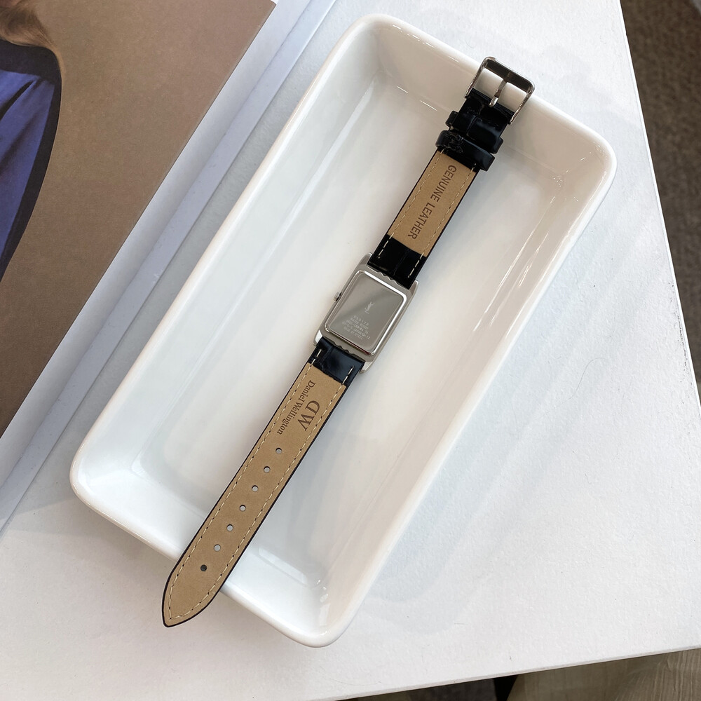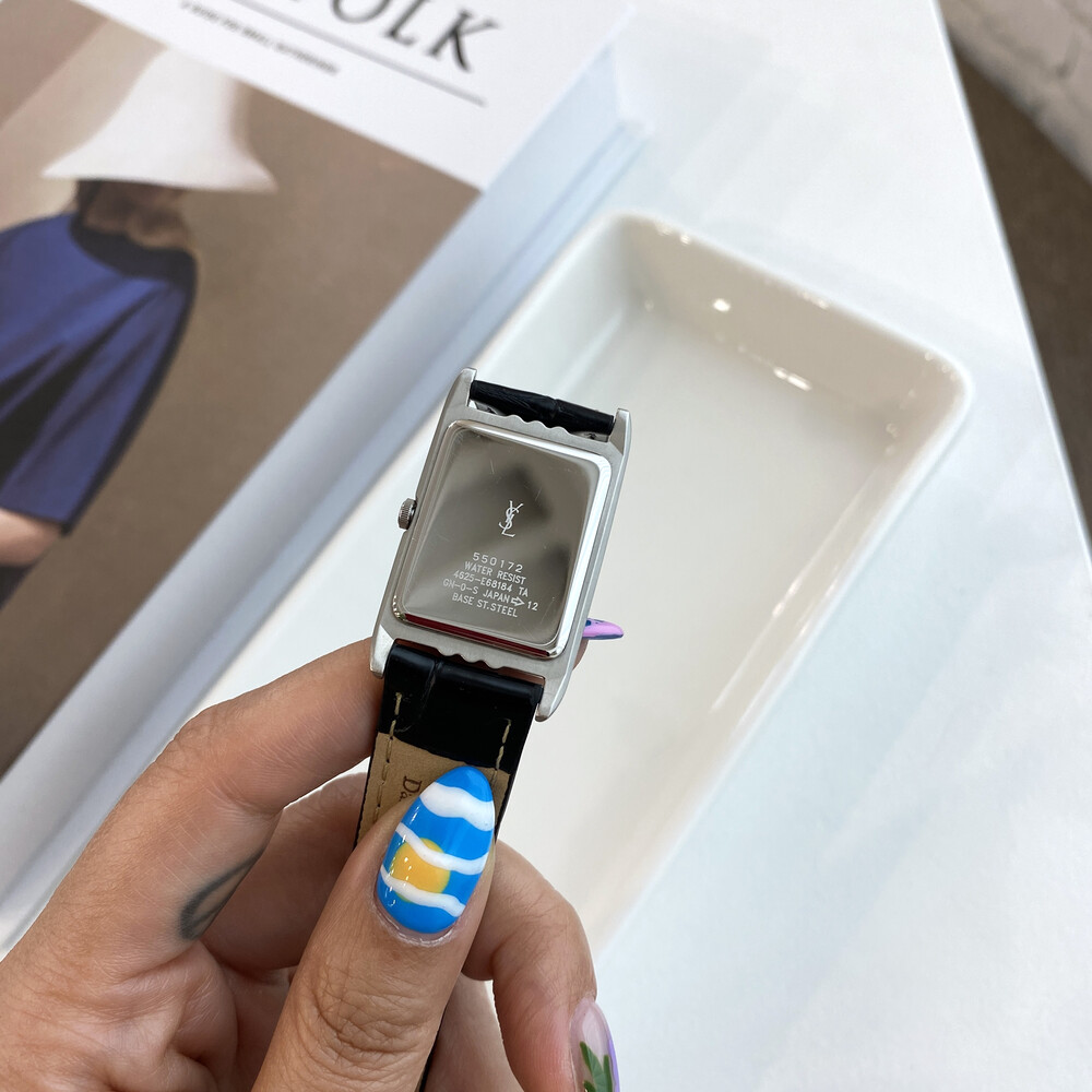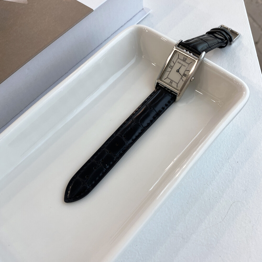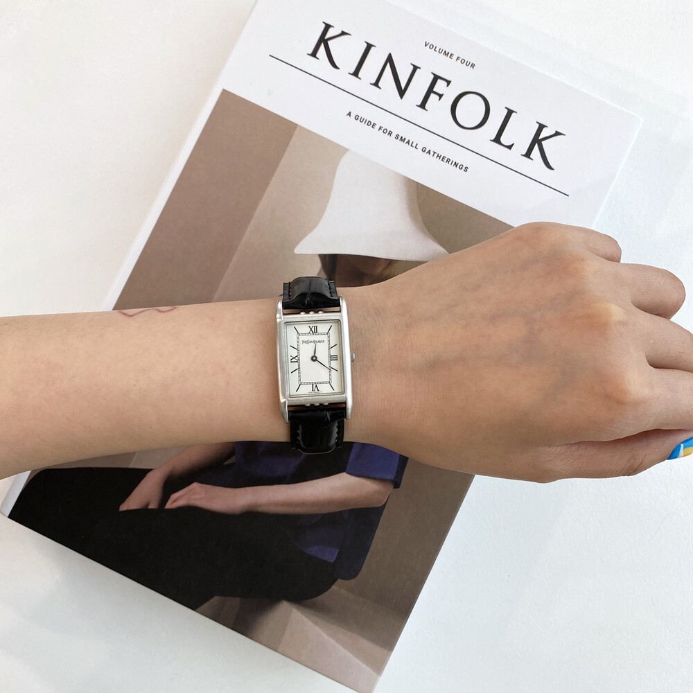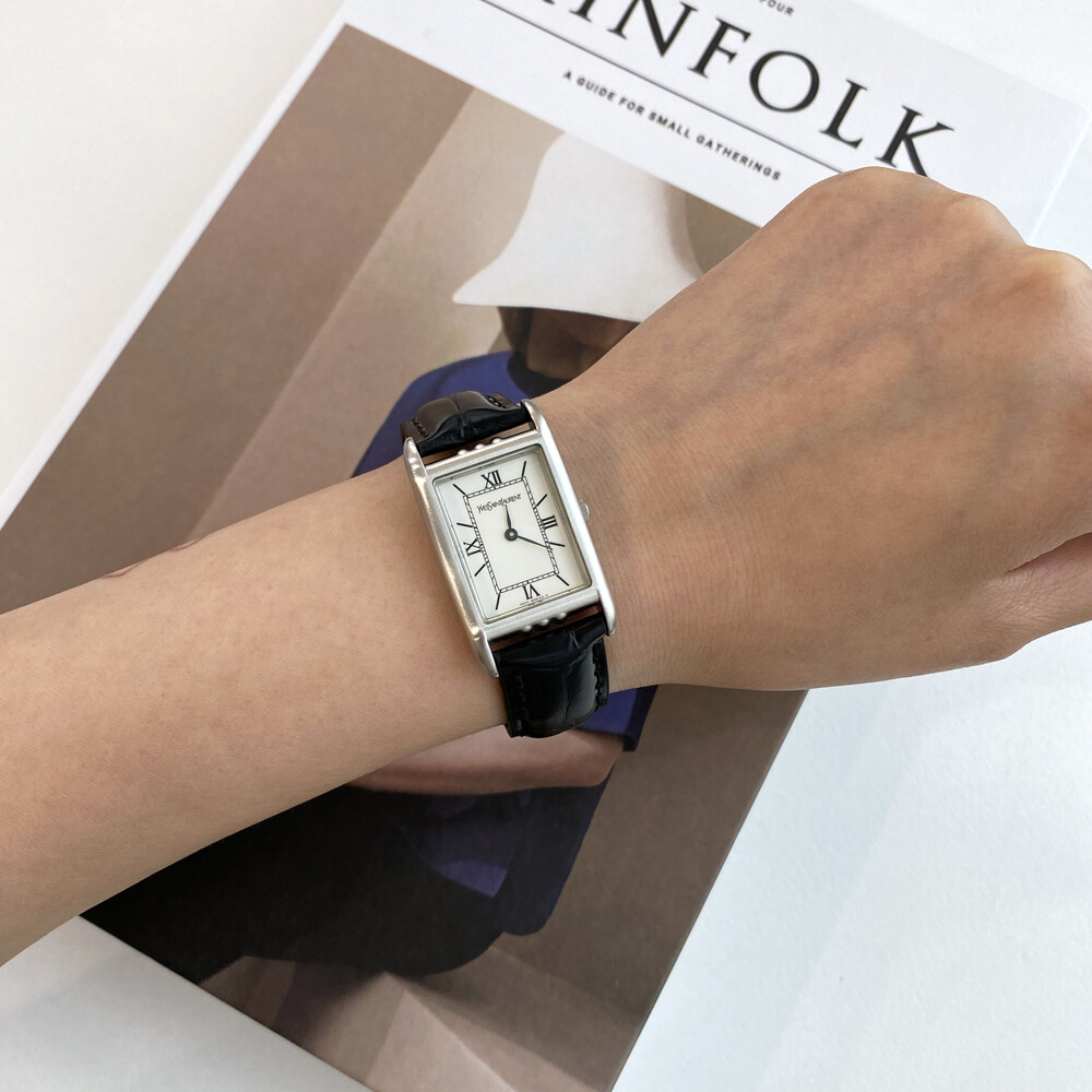 화이트 다이얼 위를 장식하는 입생로랑 로고가 매력적인 시계입니다.