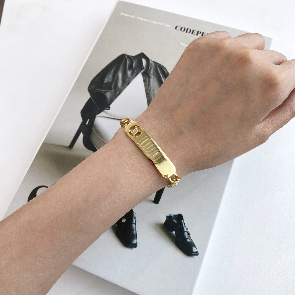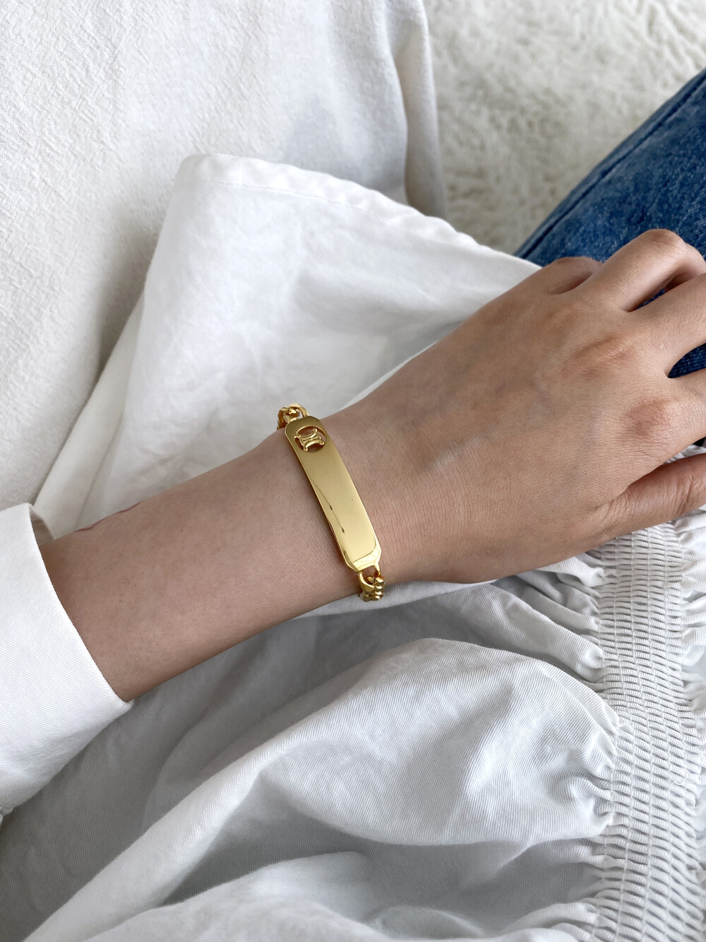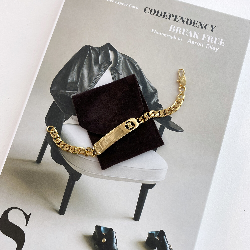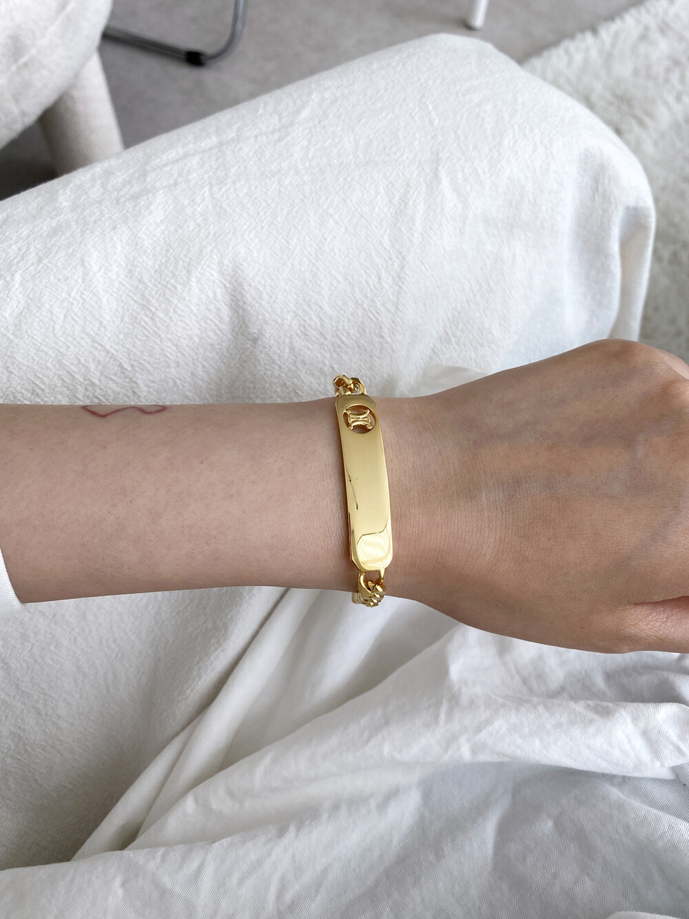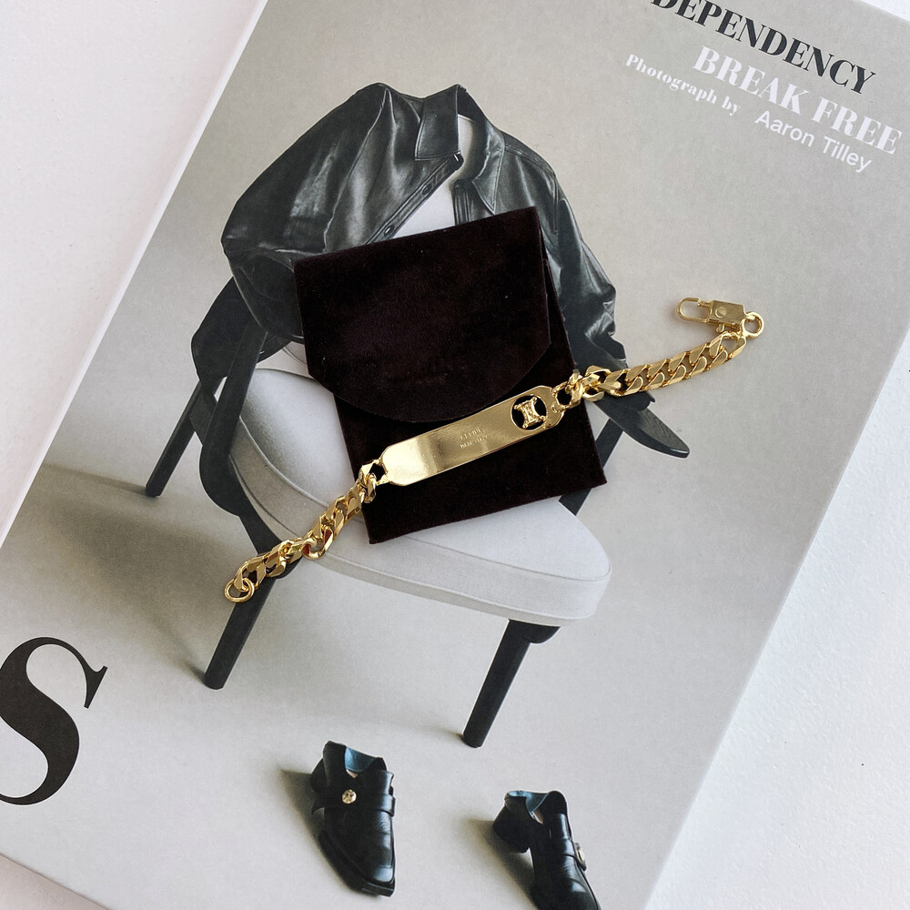 골드 톤의 플레이트 위를 장식한 셀린느 트리오페 심볼과 매끄럽게 흐르는 커브 체인이 손목을 부드럽게 감싸며 클래식한 존재감을 전하는 모델입니다.