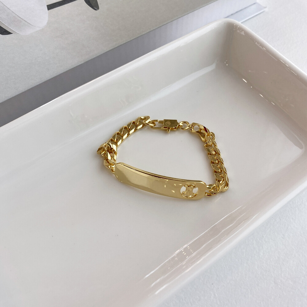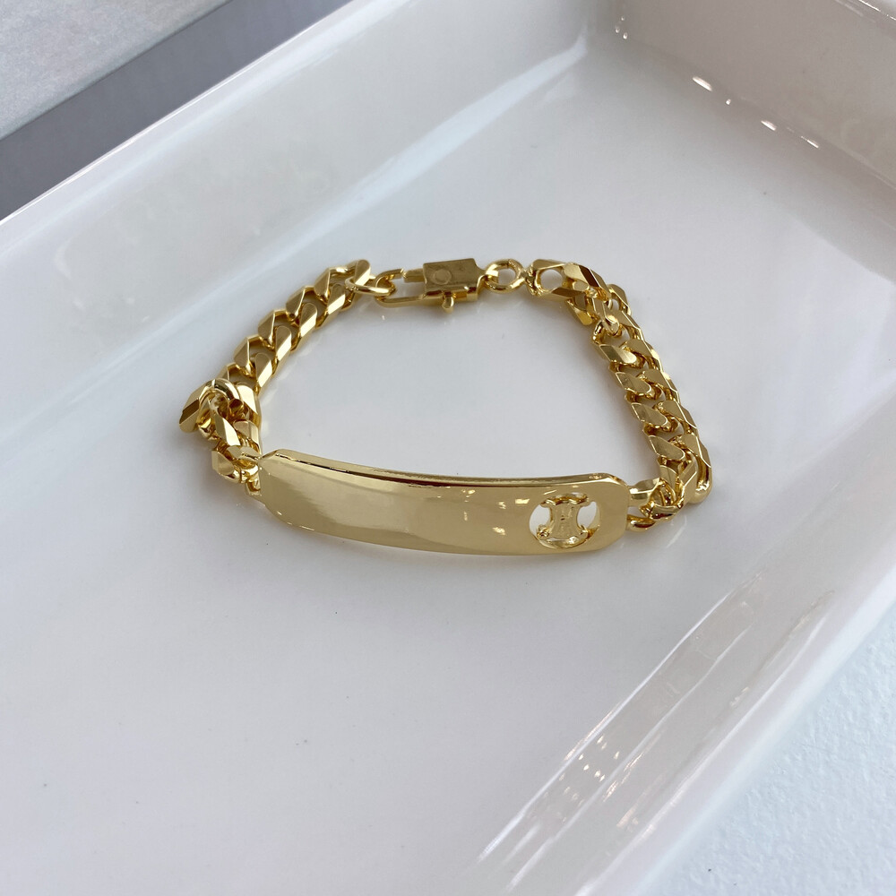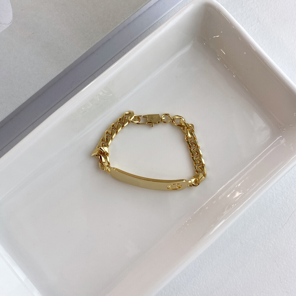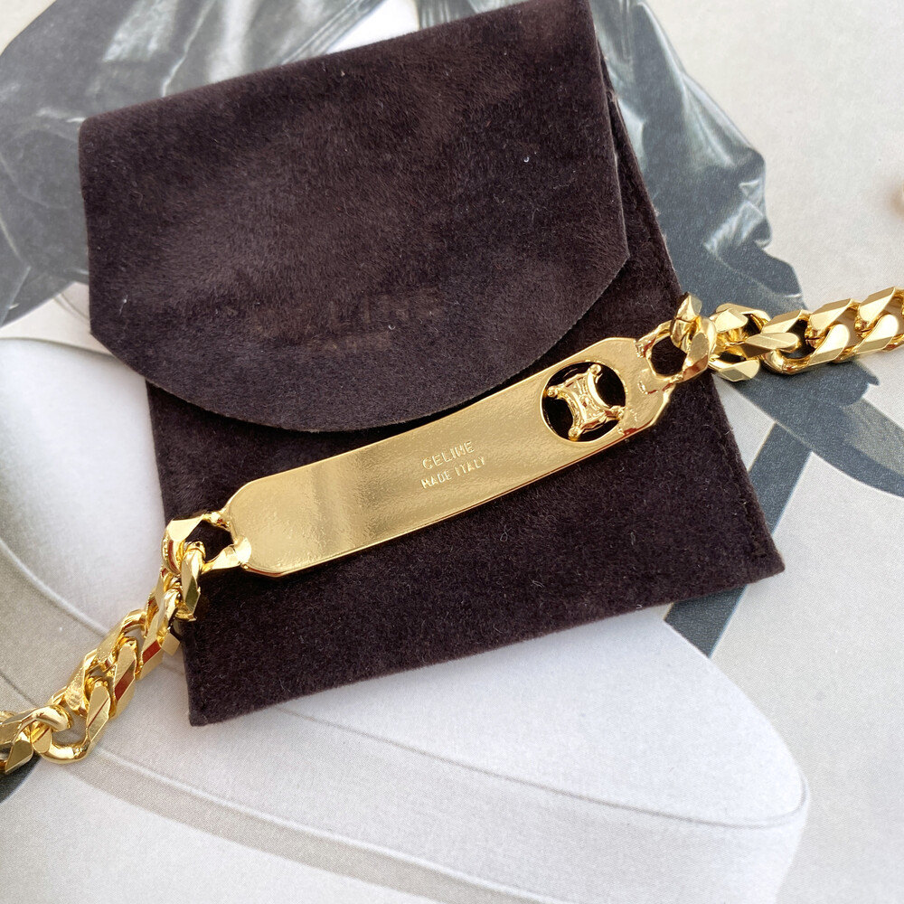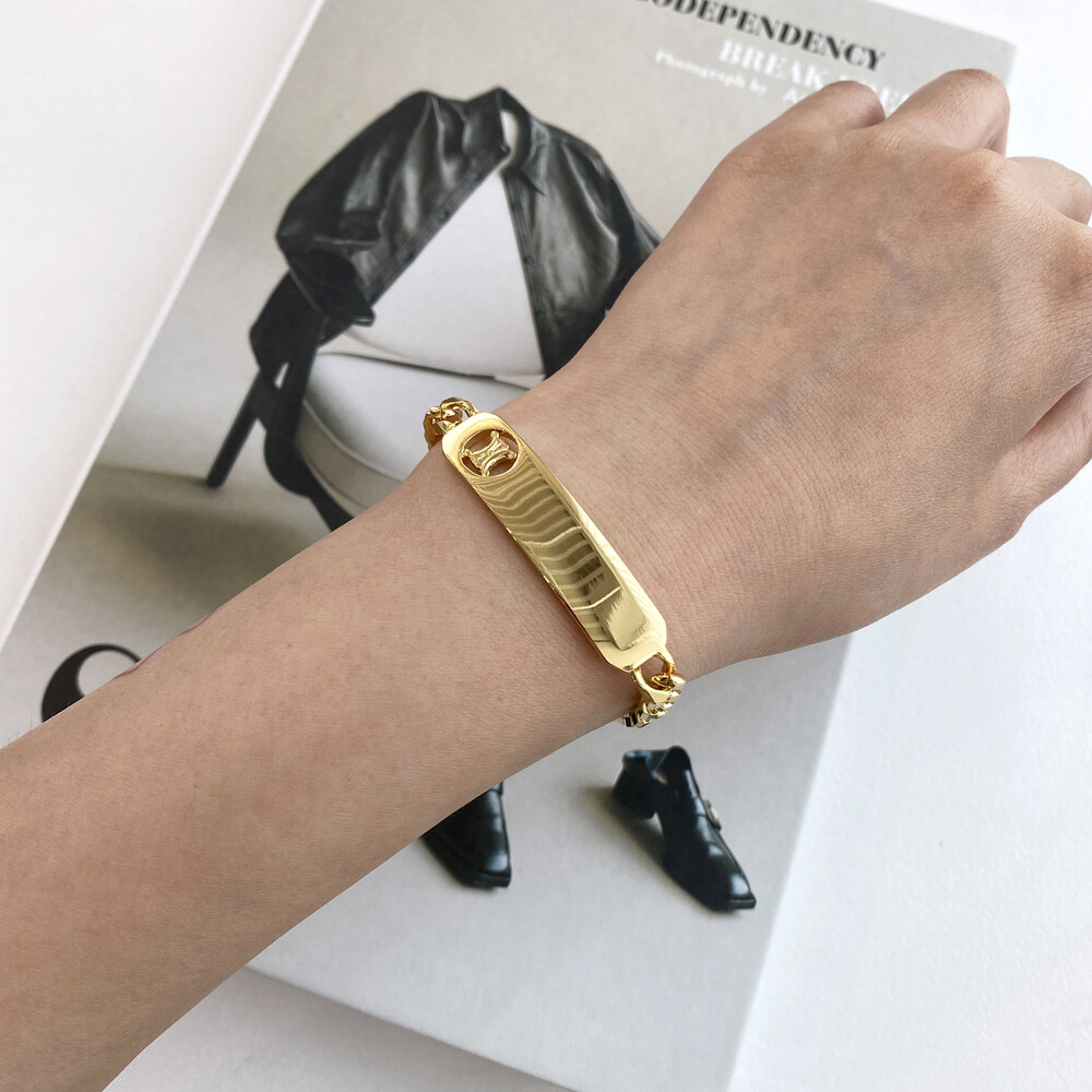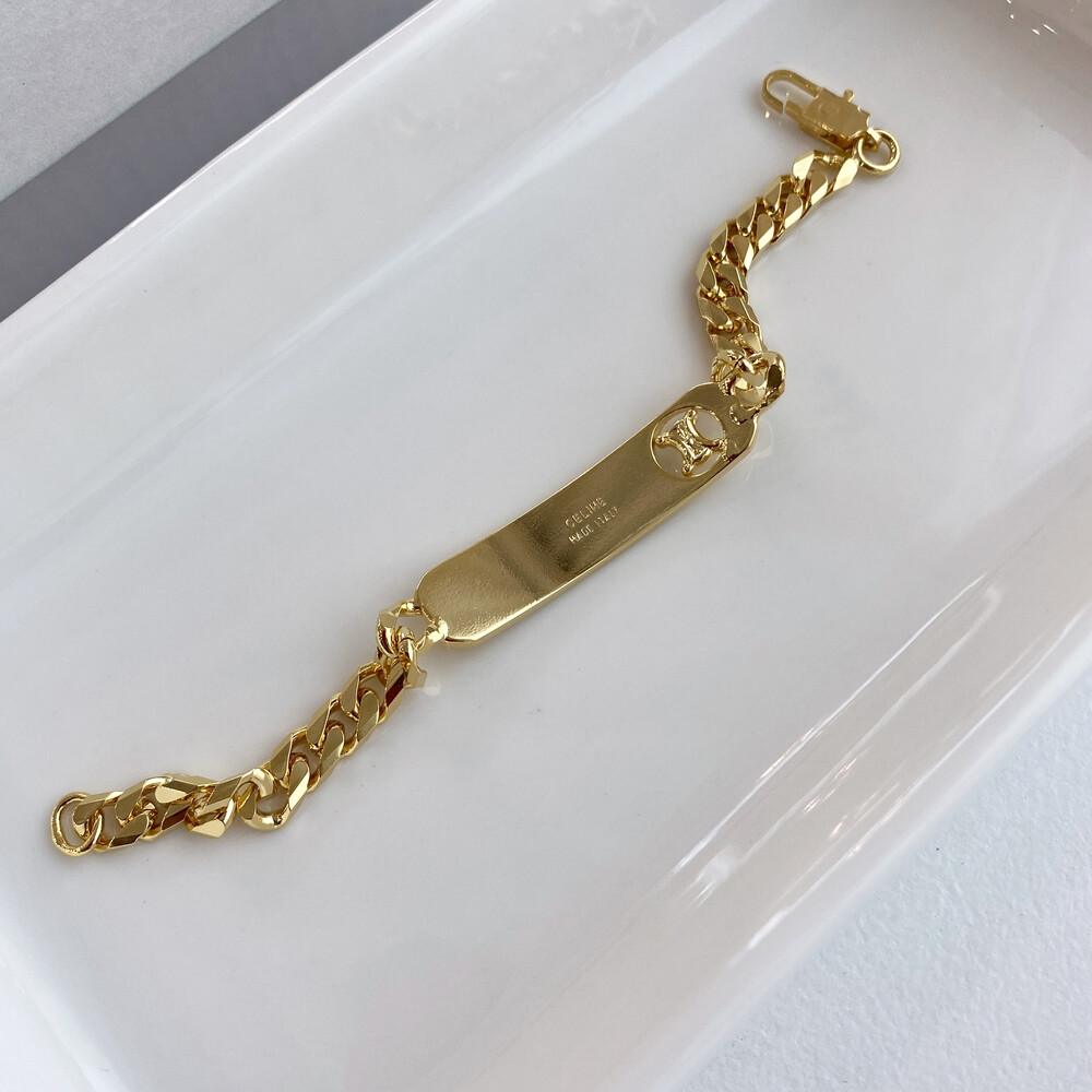 골드 톤의 플레이트 위를 장식한 셀린느 트리오페 심볼과 매끄럽게 흐르는 커브 체인이 손목을 부드럽게 감싸며 클래식한 존재감을 전하는 모델입니다.