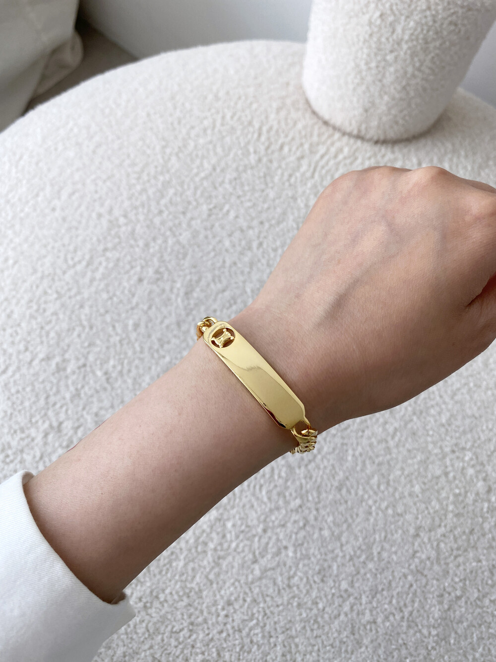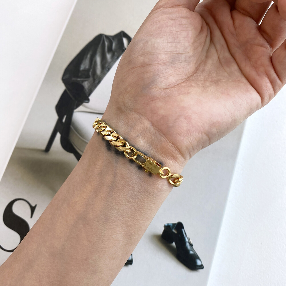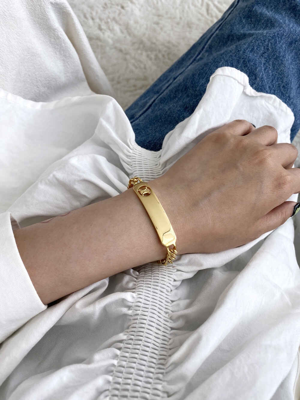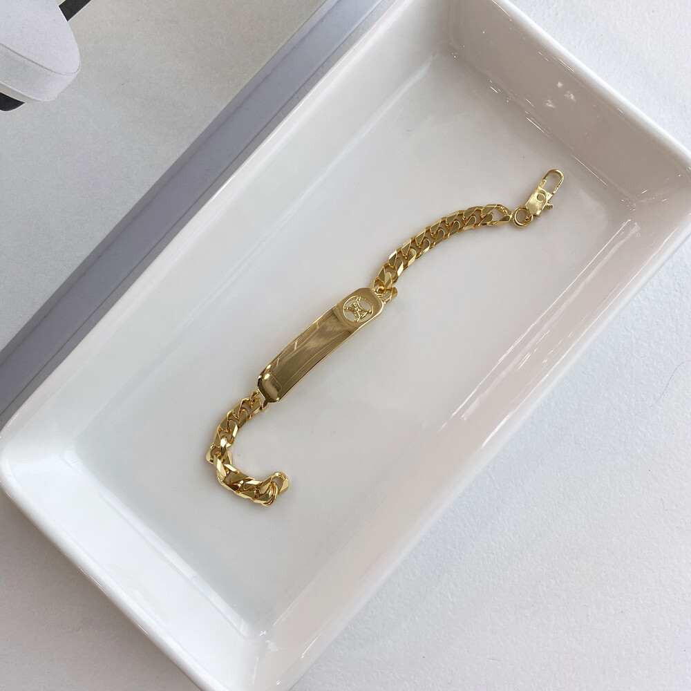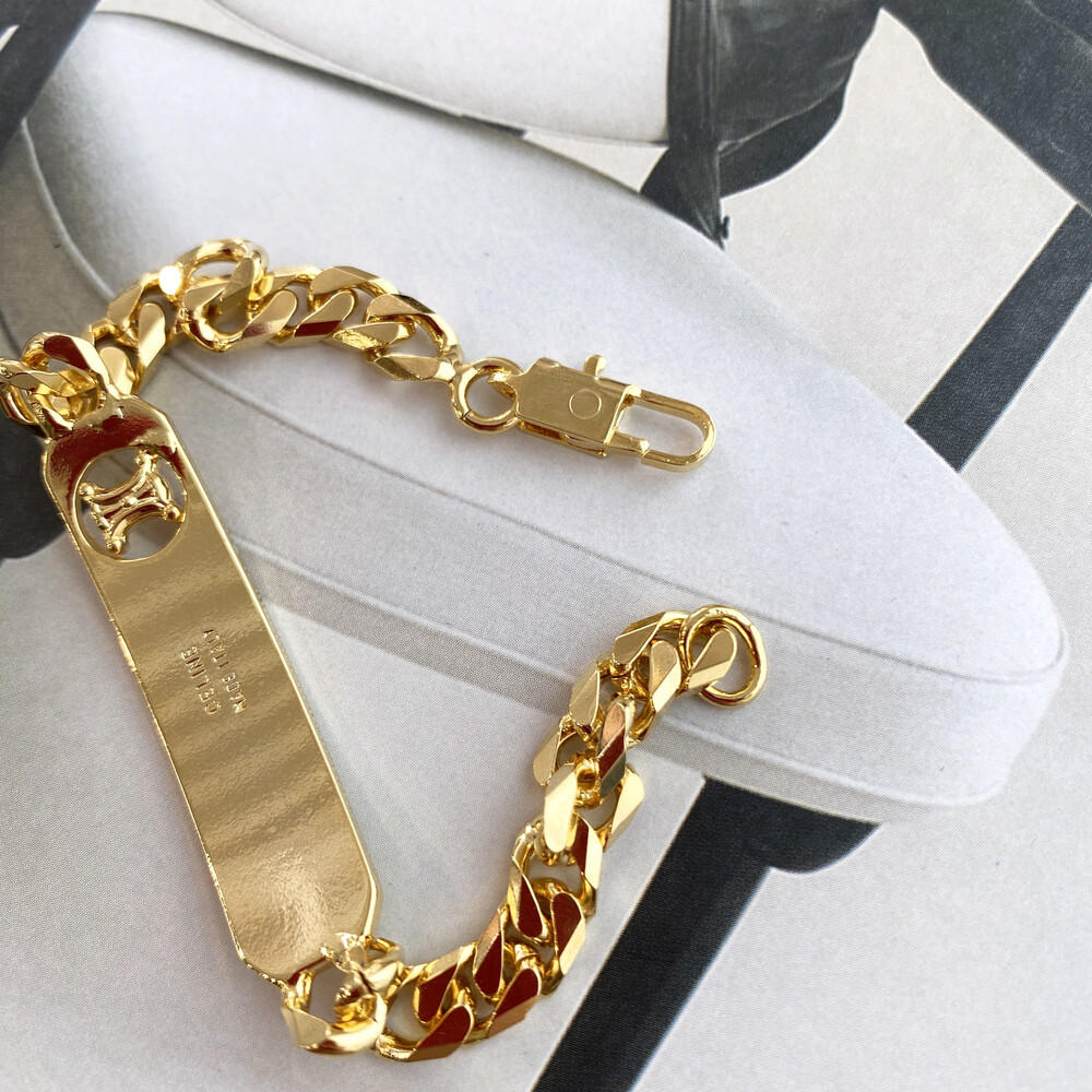 골드 톤의 플레이트 위를 장식한 셀린느 트리오페 심볼과 매끄럽게 흐르는 커브 체인이 손목을 부드럽게 감싸며 클래식한 존재감을 전하는 모델입니다.