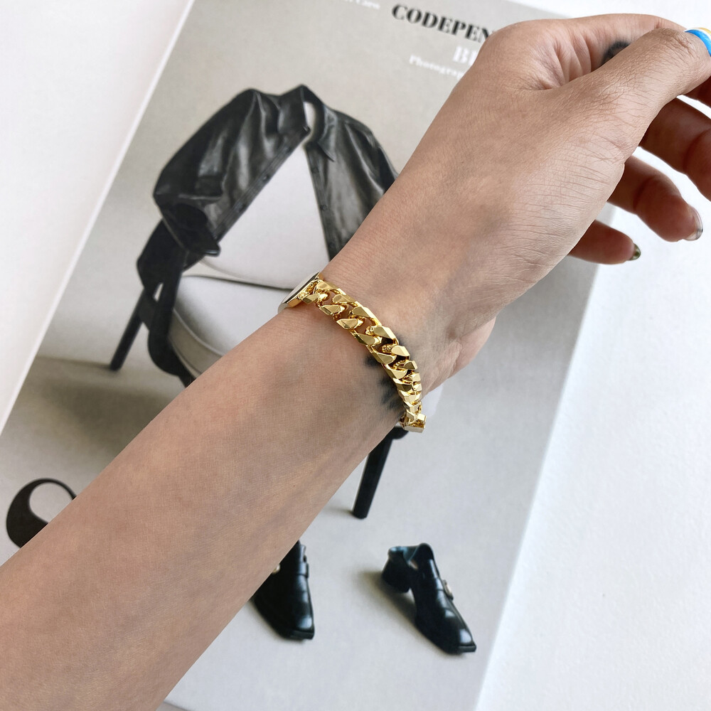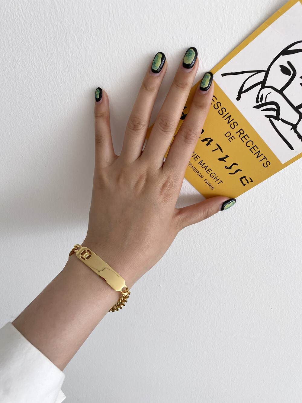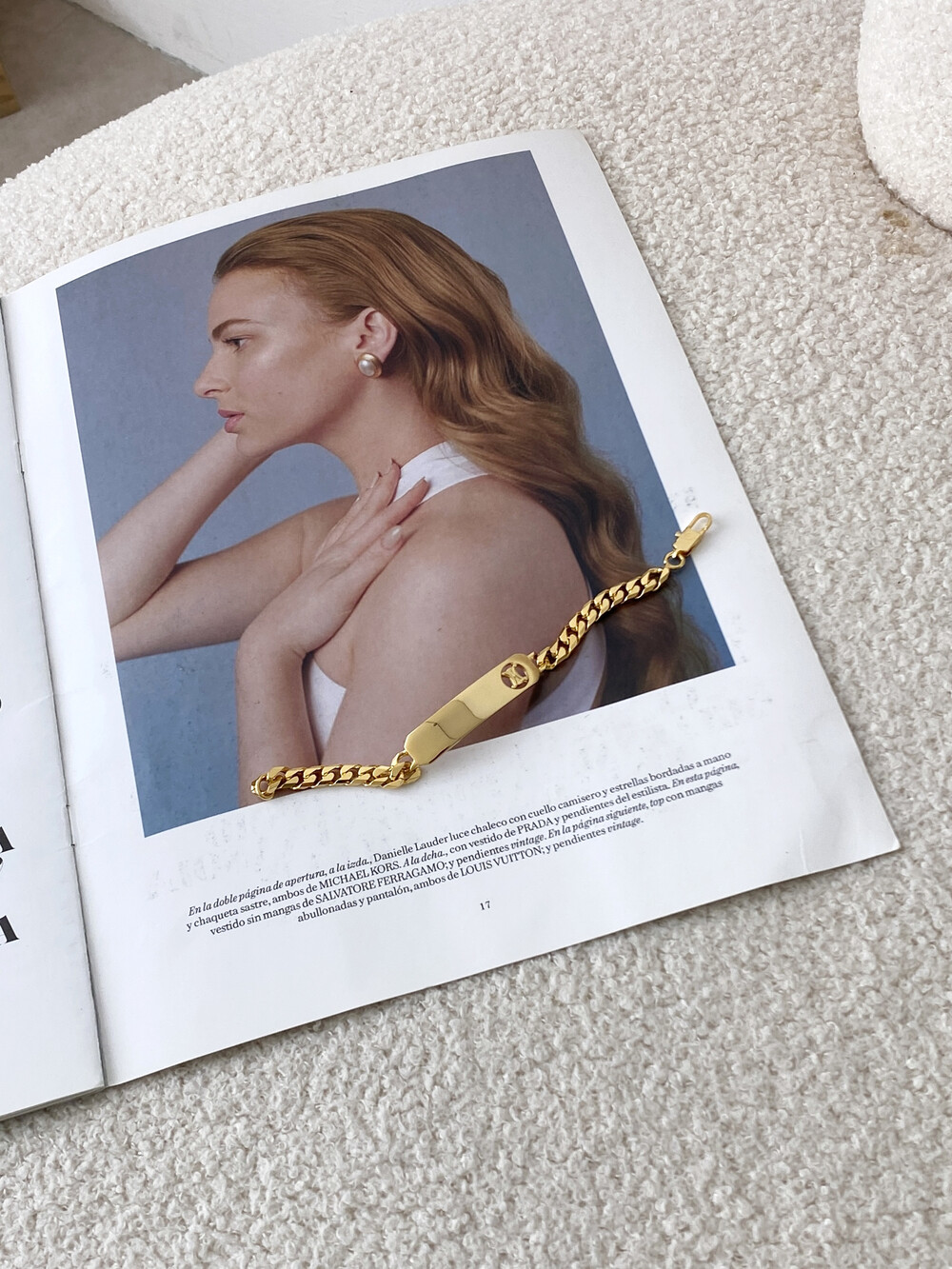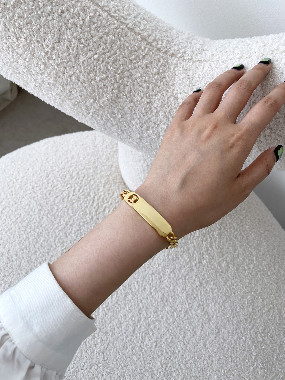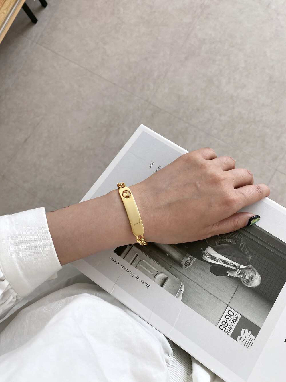 골드 톤의 플레이트 위를 장식한 셀린느 트리오페 심볼과 매끄럽게 흐르는 커브 체인이 손목을 부드럽게 감싸며 클래식한 존재감을 전하는 모델입니다.