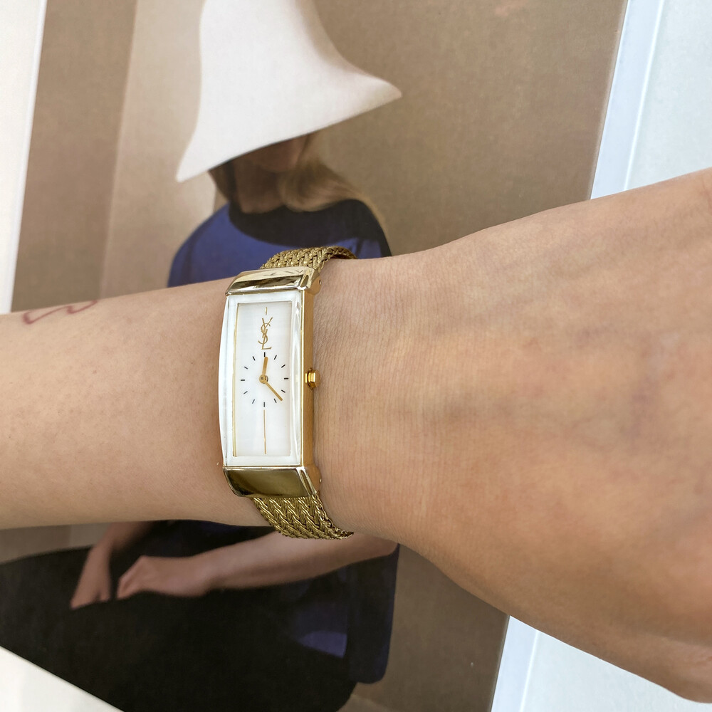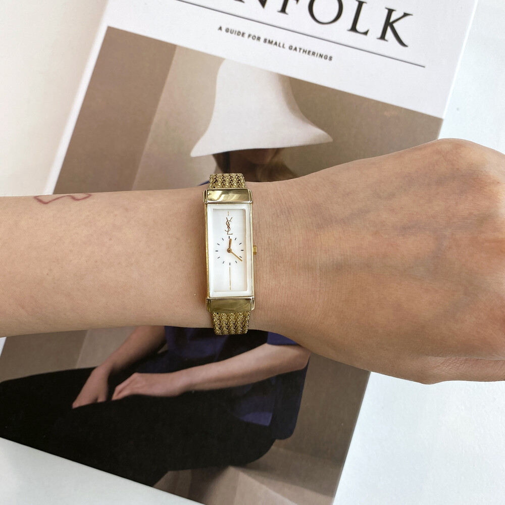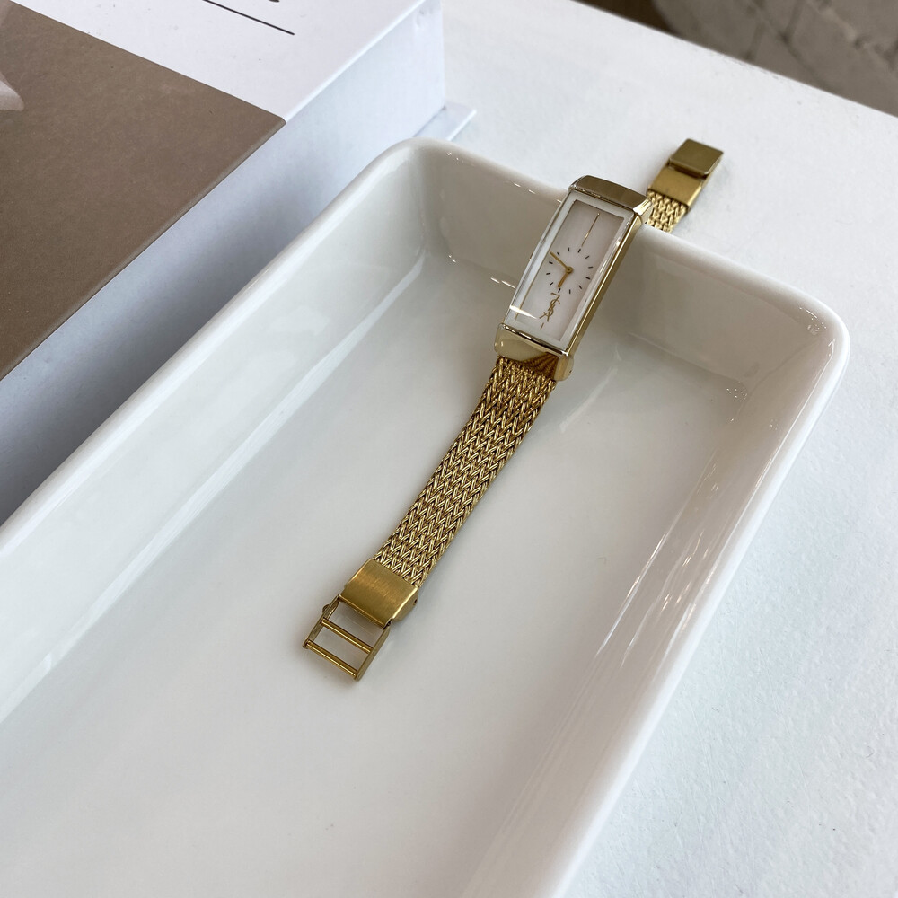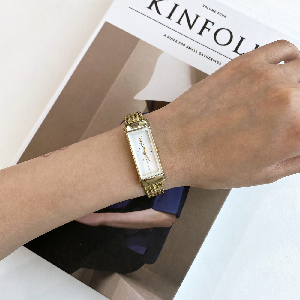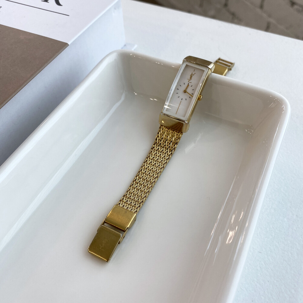 매력적인 스퀘어 바디와 화이트 다이얼 위를 장식하는 생로랑 YSL 시그니처가