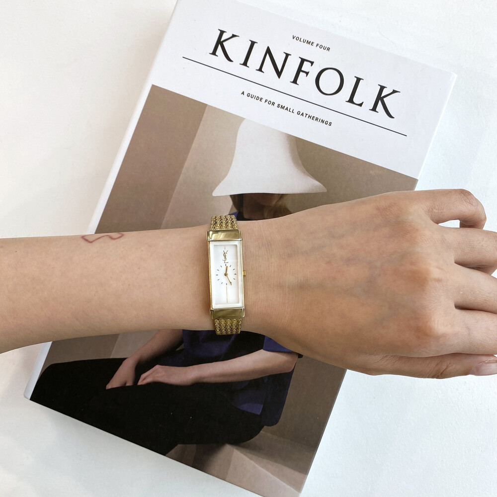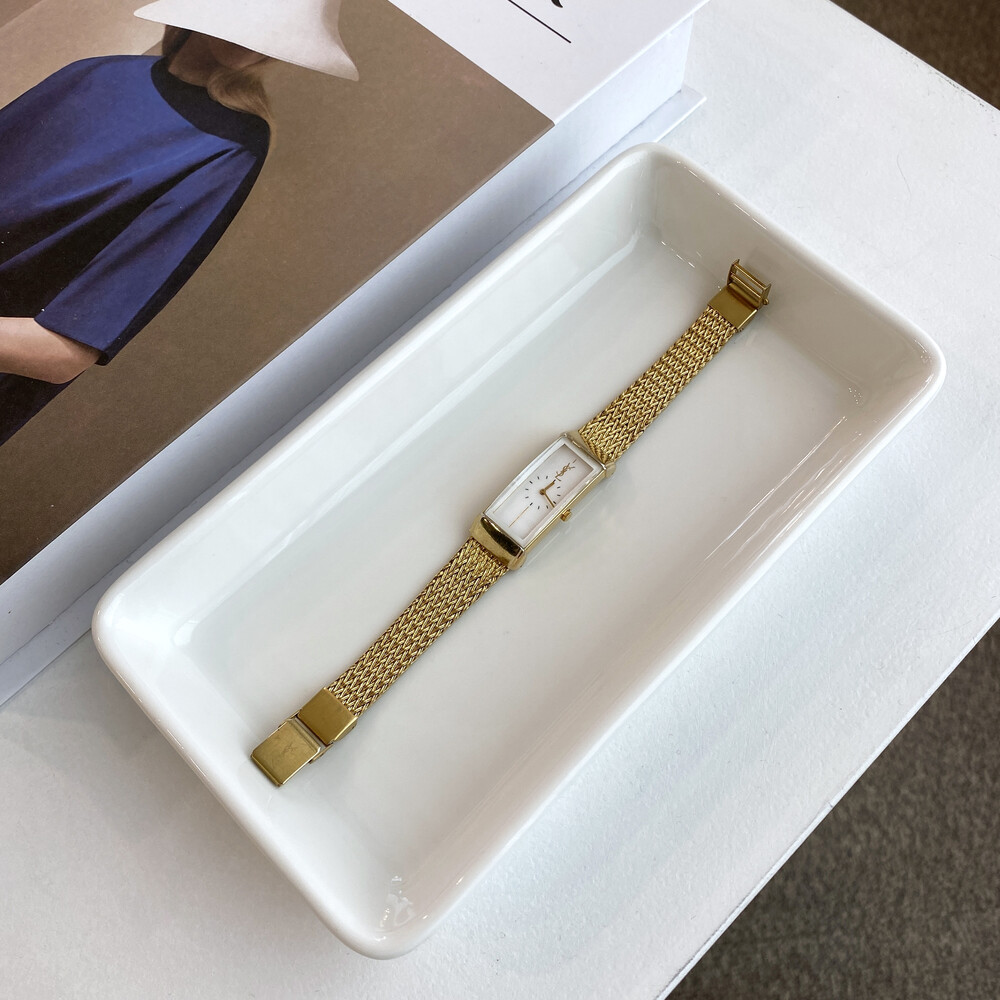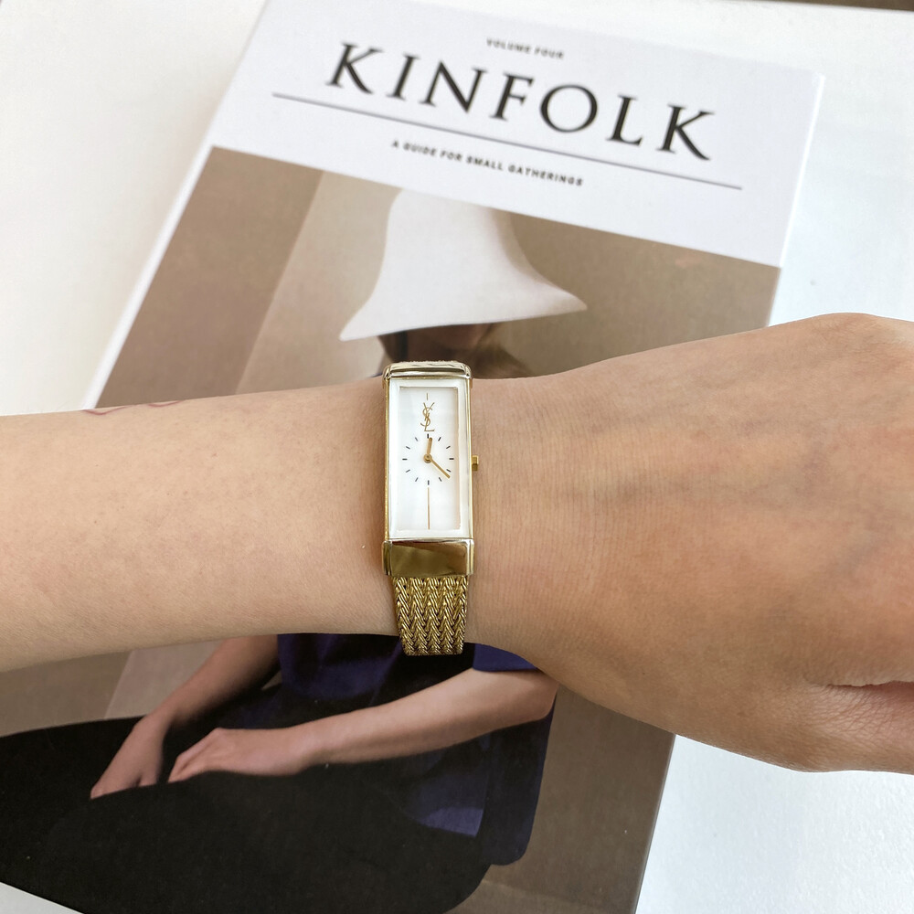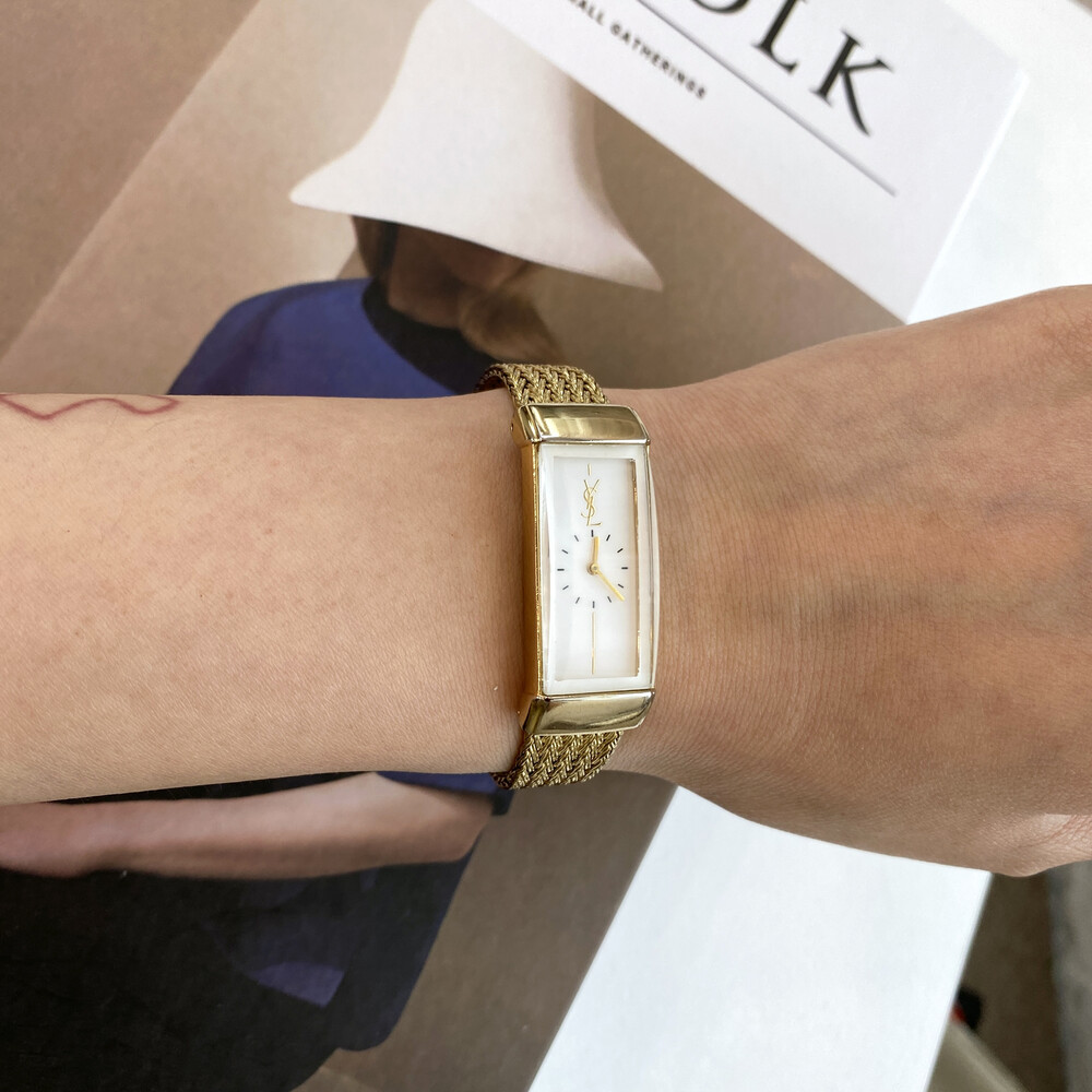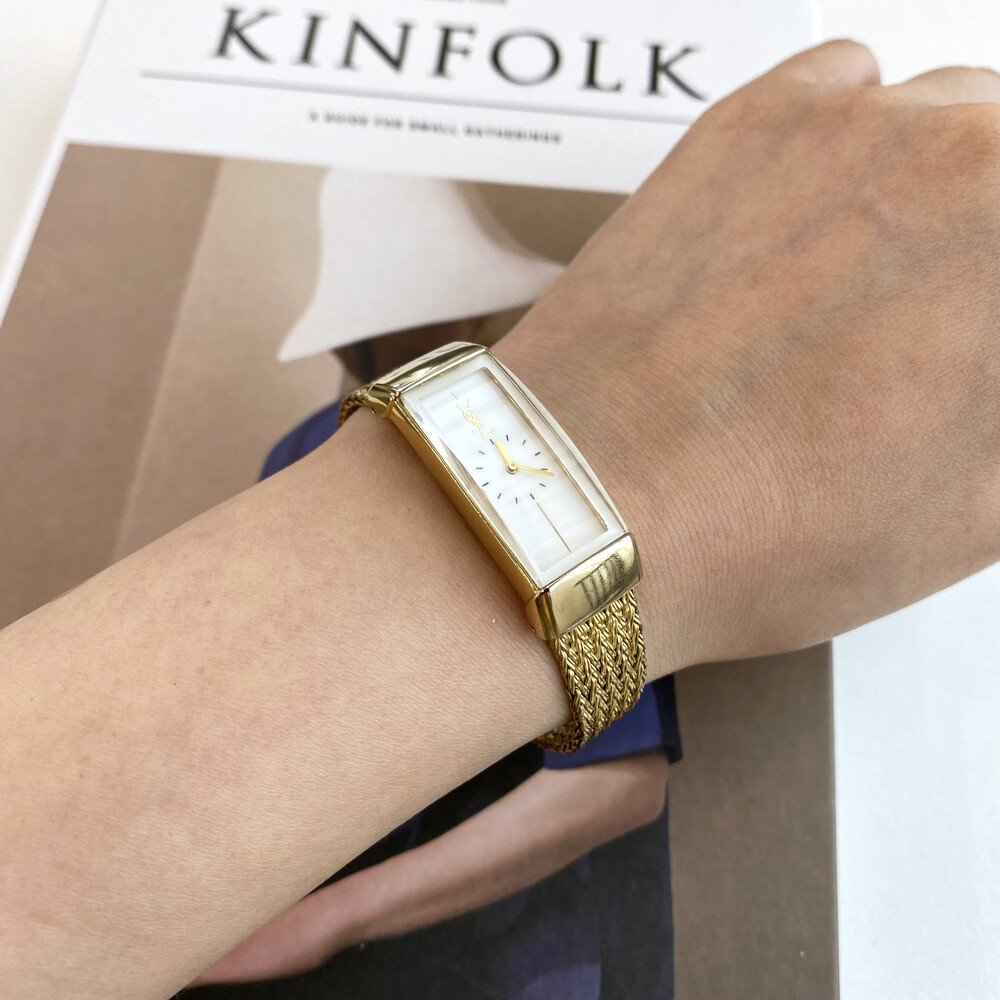 매력적인 스퀘어 바디와 화이트 다이얼 위를 장식하는 생로랑 YSL 시그니처가
