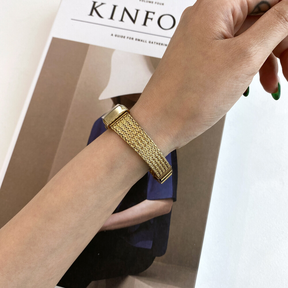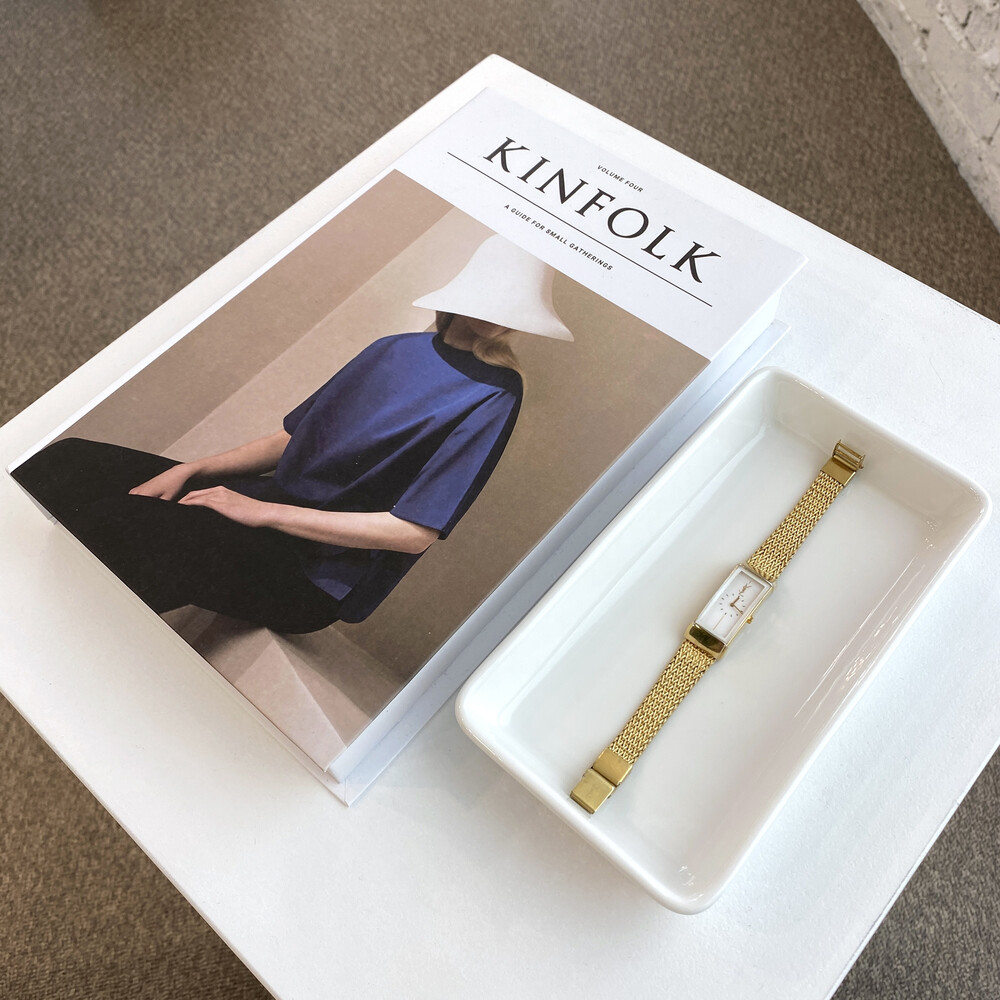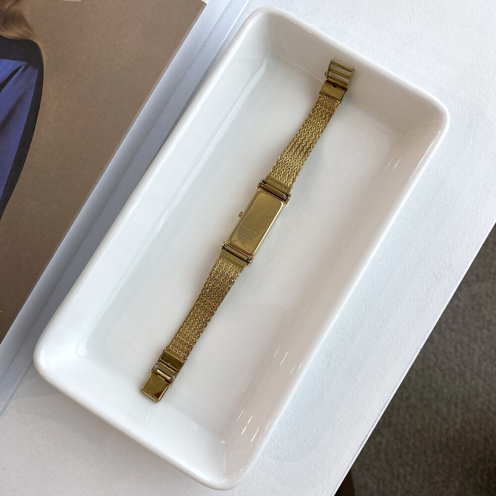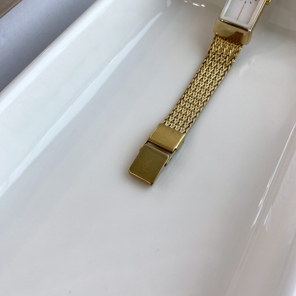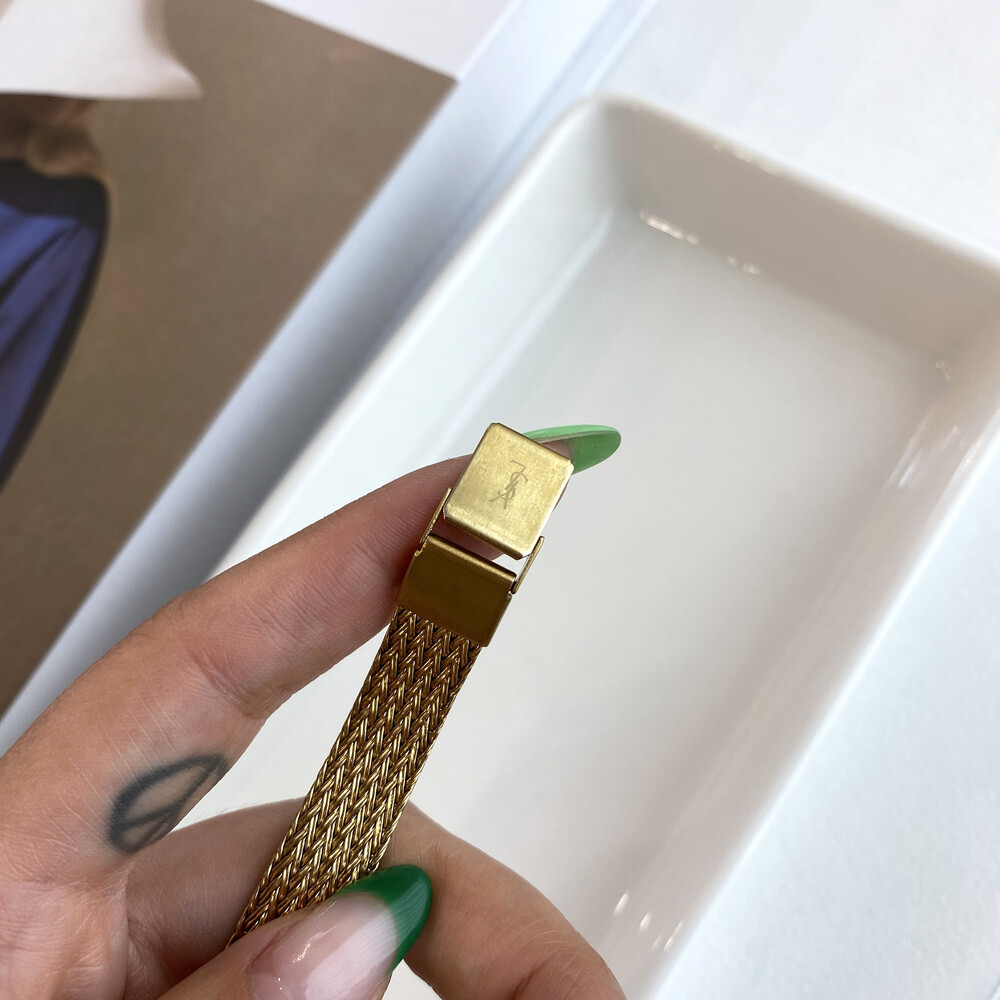 매력적인 스퀘어 바디와 화이트 다이얼 위를 장식하는 생로랑 YSL 시그니처가