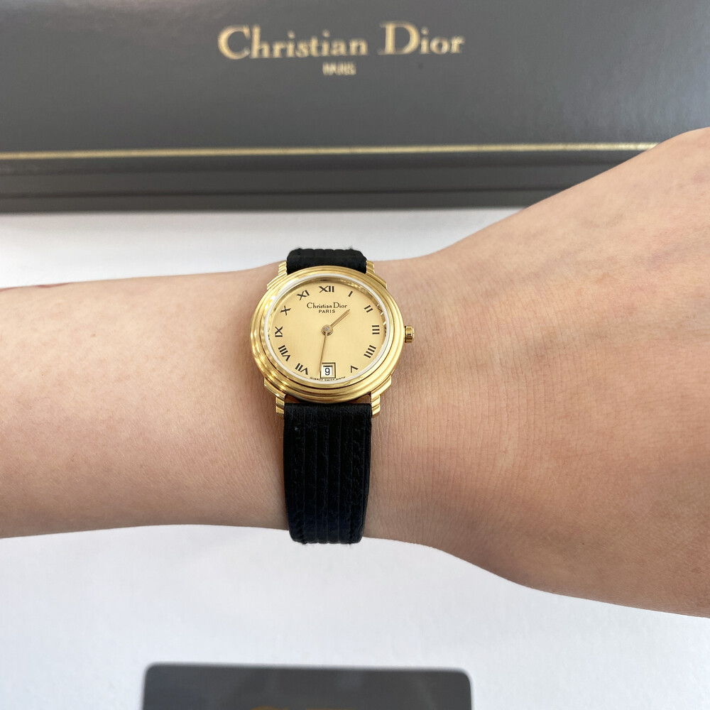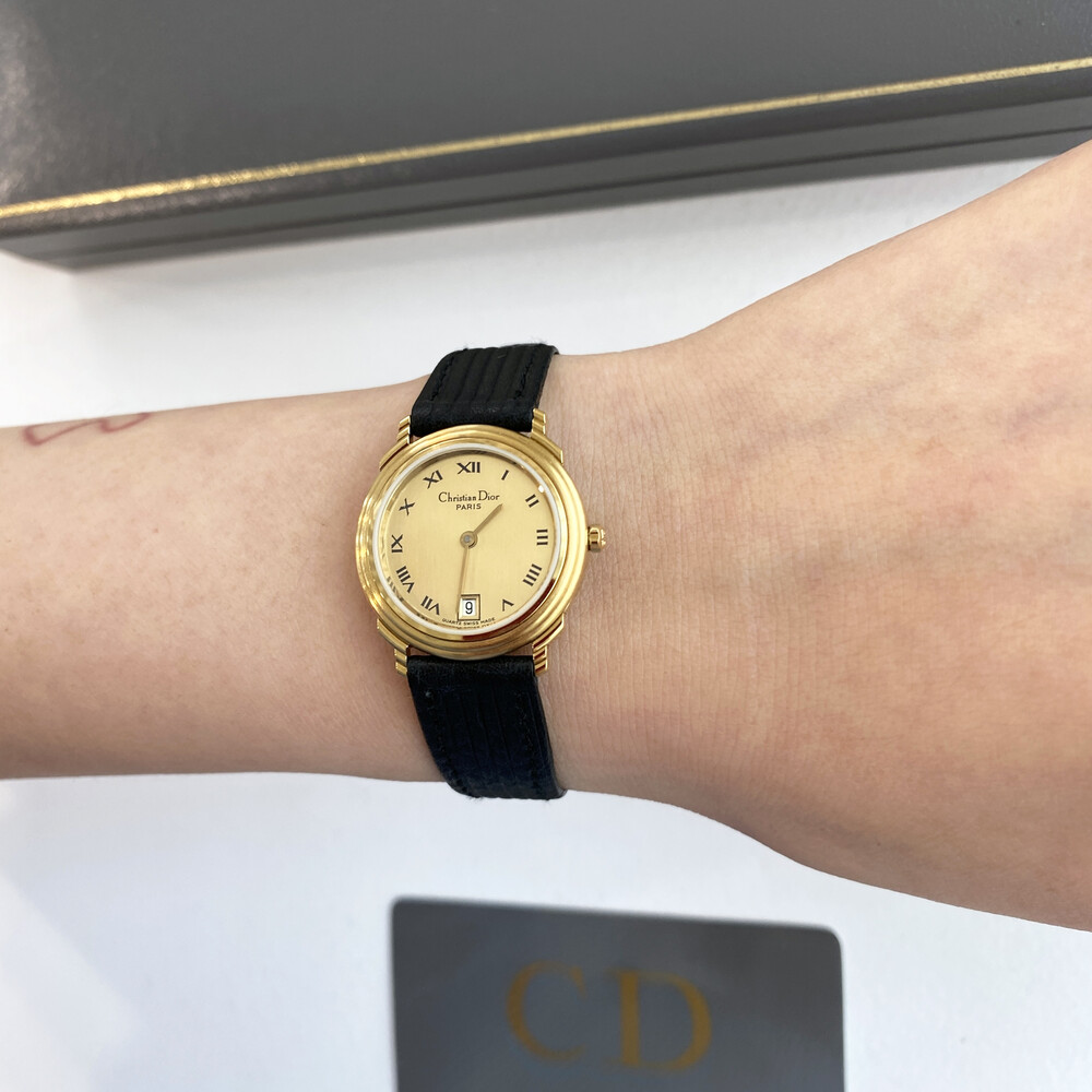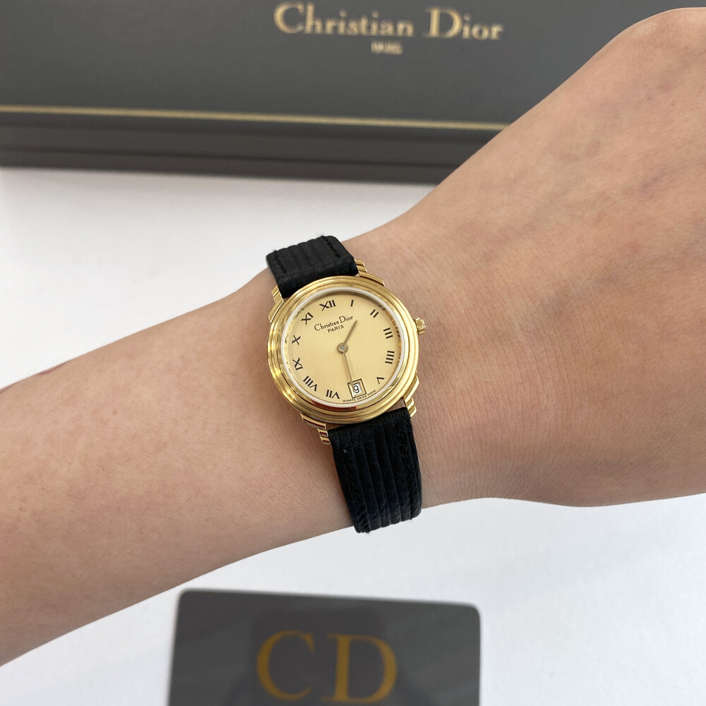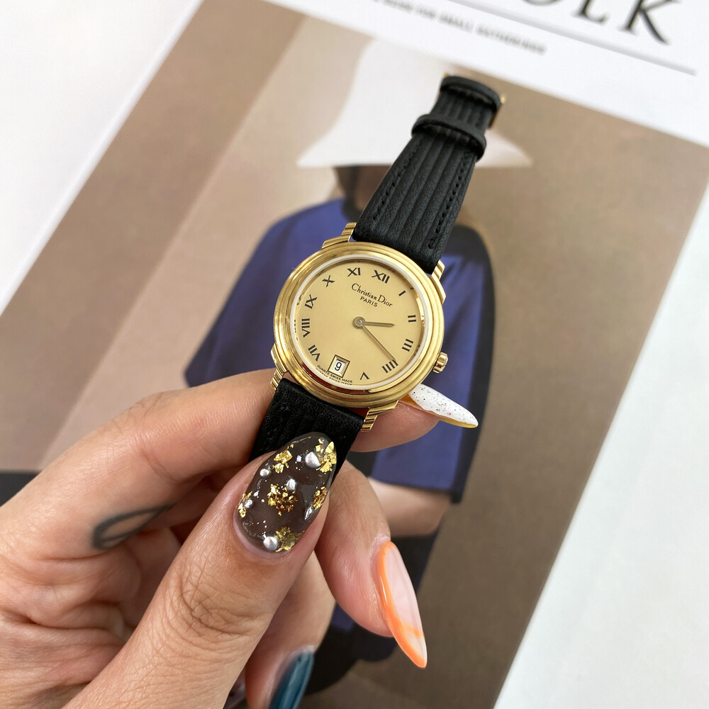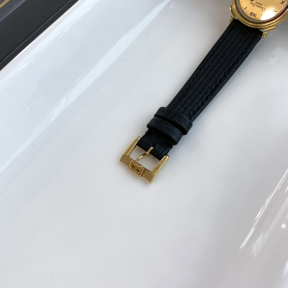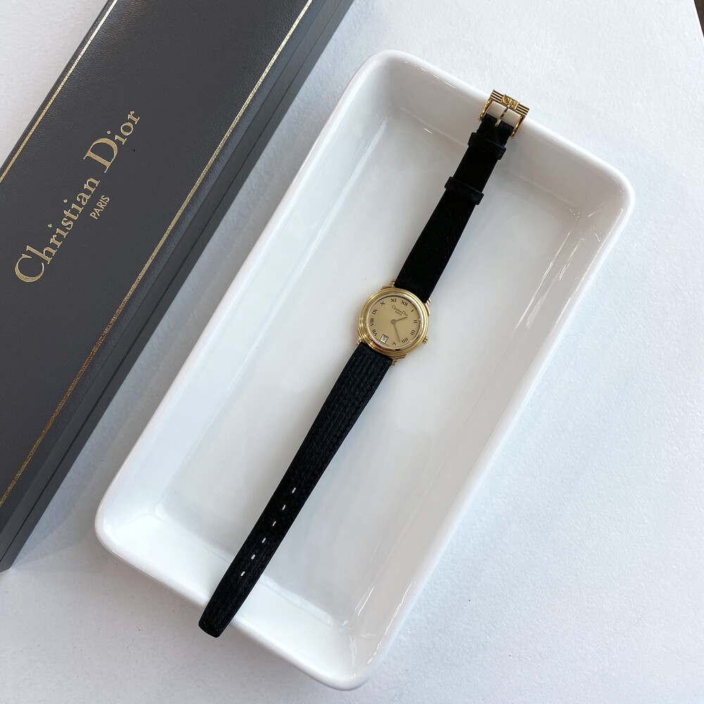 골드톤 라운드 케이스와 다이얼 위를 장식하는 디올 로고와 로마 인덱스가