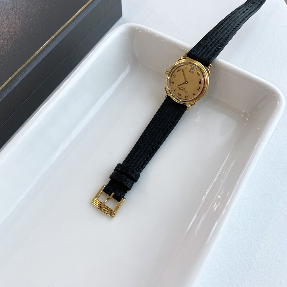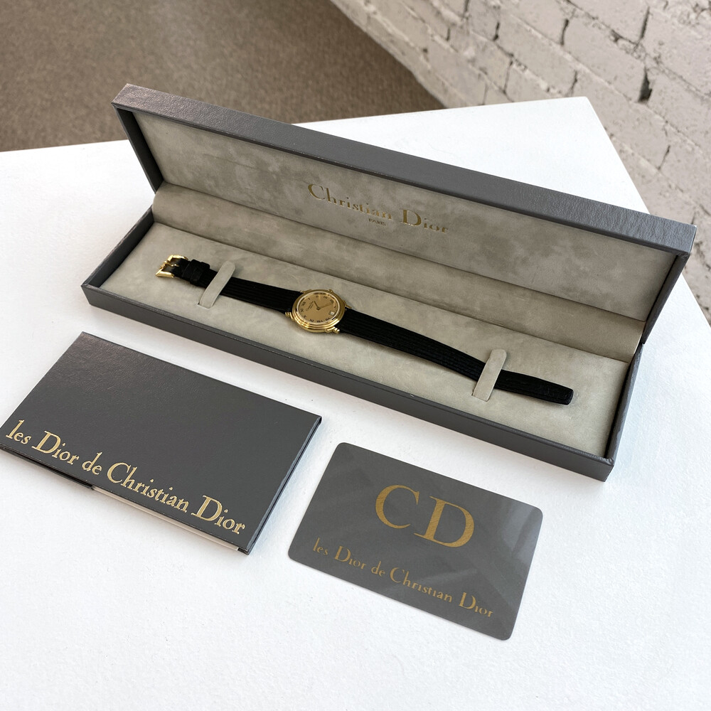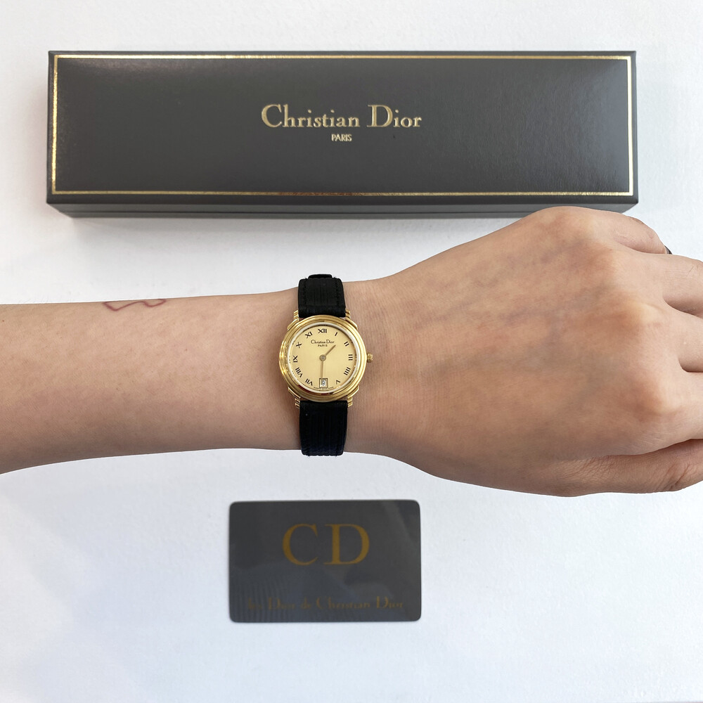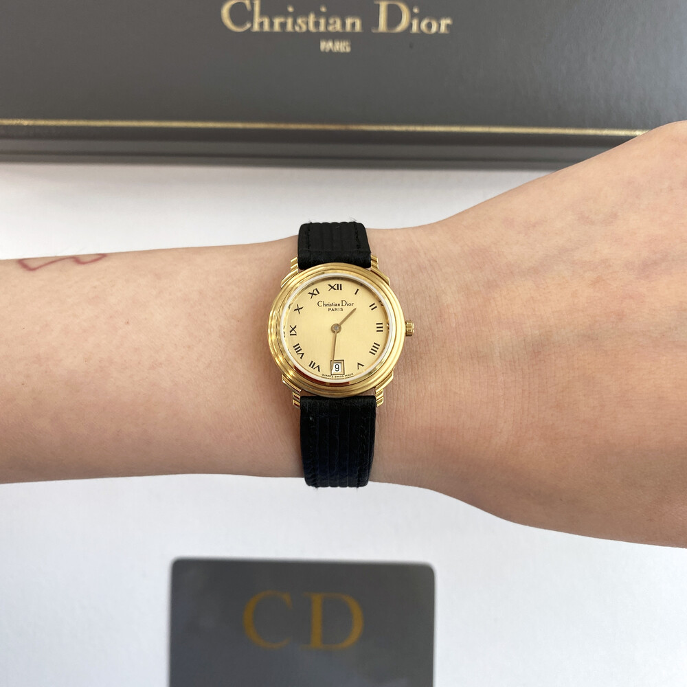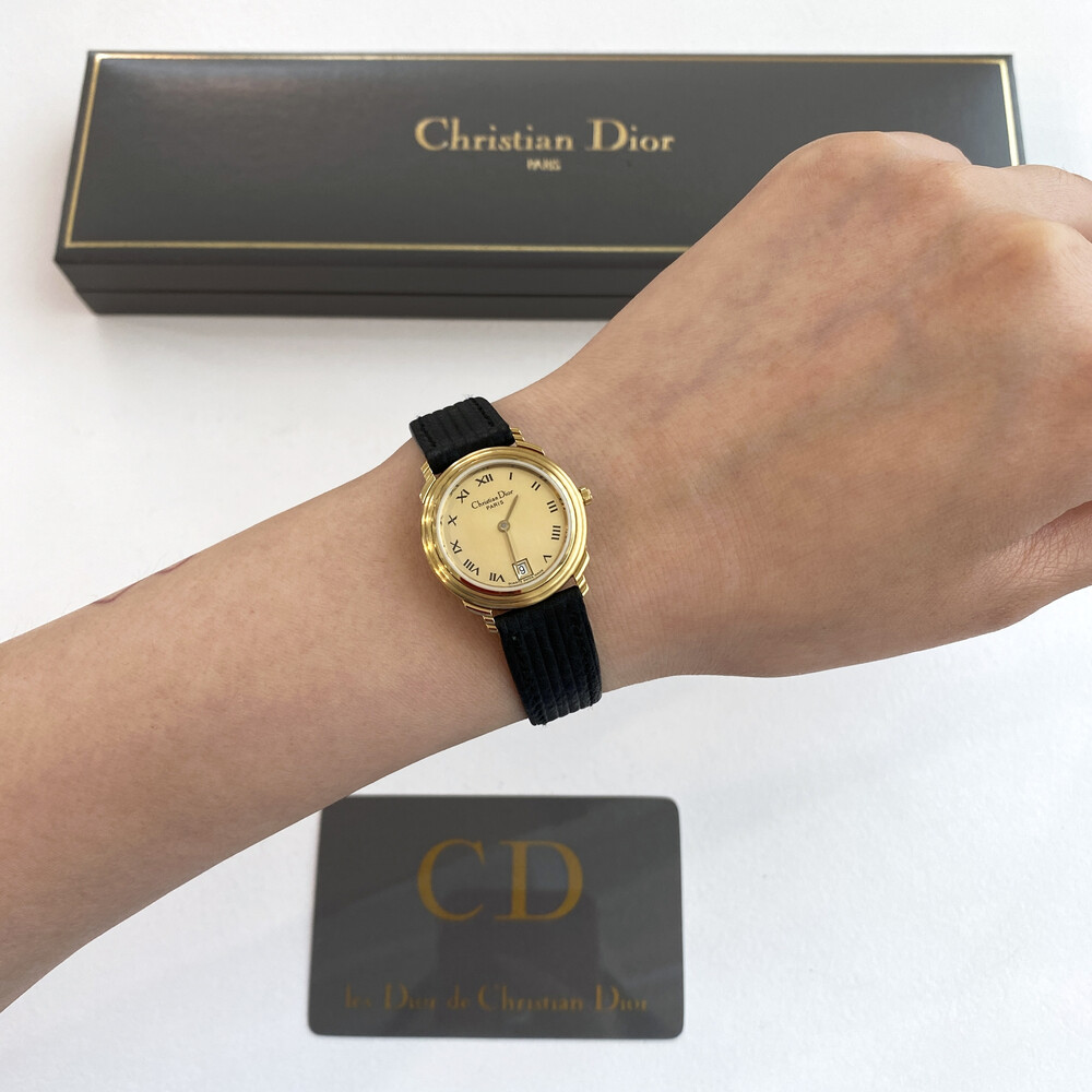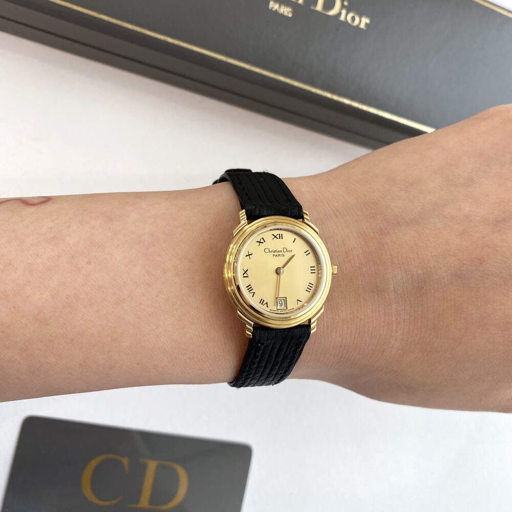 골드톤 라운드 케이스와 다이얼 위를 장식하는 디올 로고와 로마 인덱스가