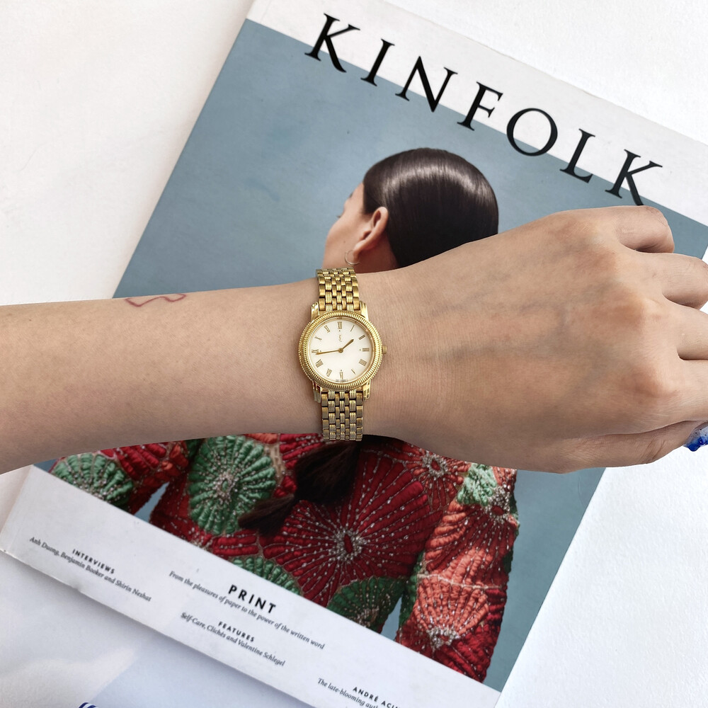부드러운 라운드 케이스와 화이트 톤의 다이얼 위를 장식하는 로마 인덱스,
