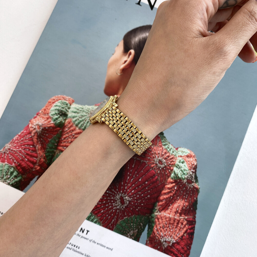 여성용으로 제작된 생로랑 시계이며 쿼츠 무브먼트로 제작되었습니다.