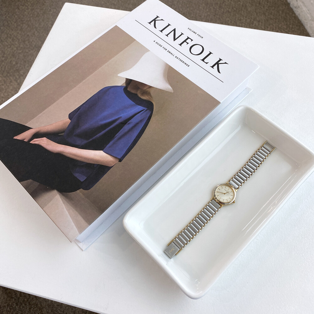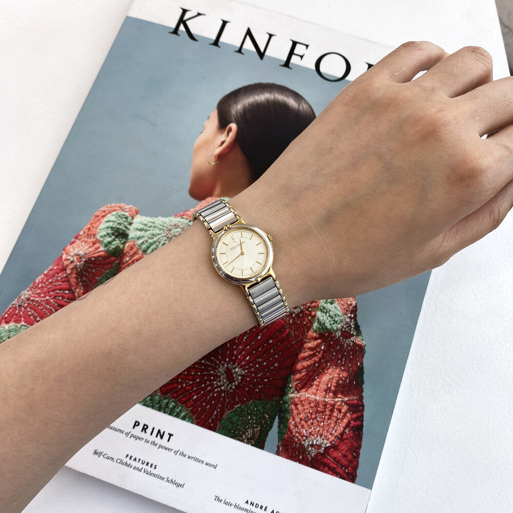 부드러운 투톤 라운드 케이스와 샴페인톤 다이얼 위를 장식하는