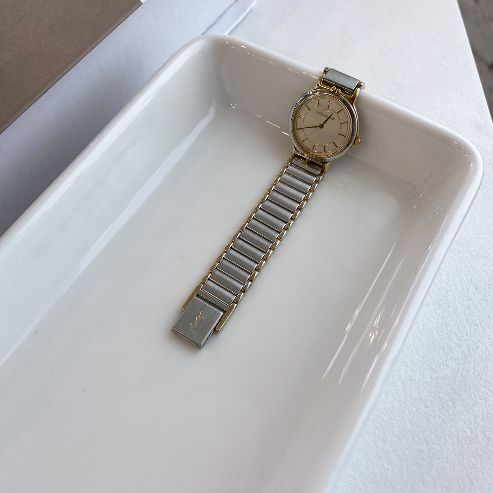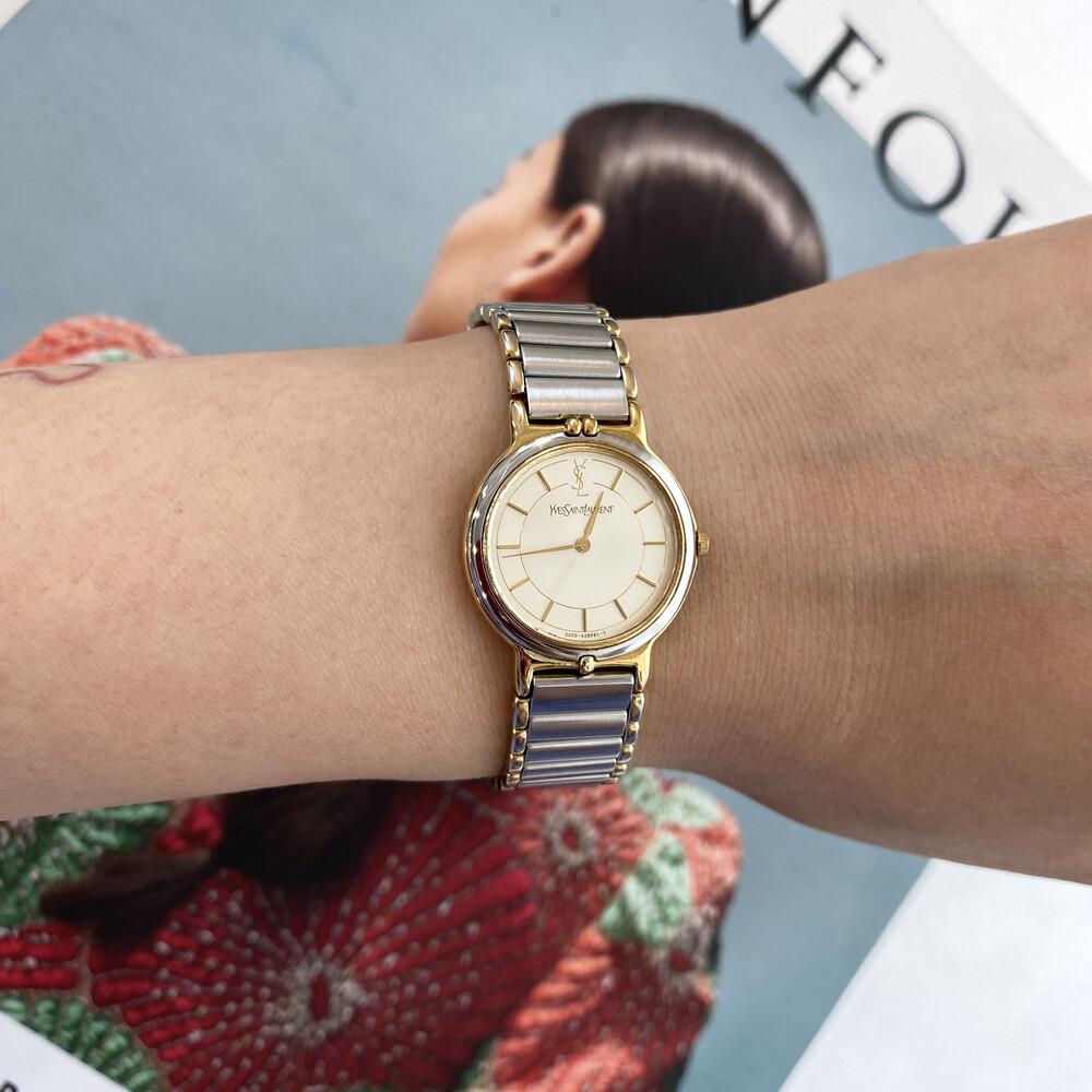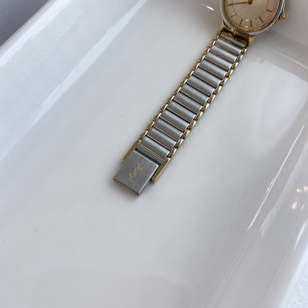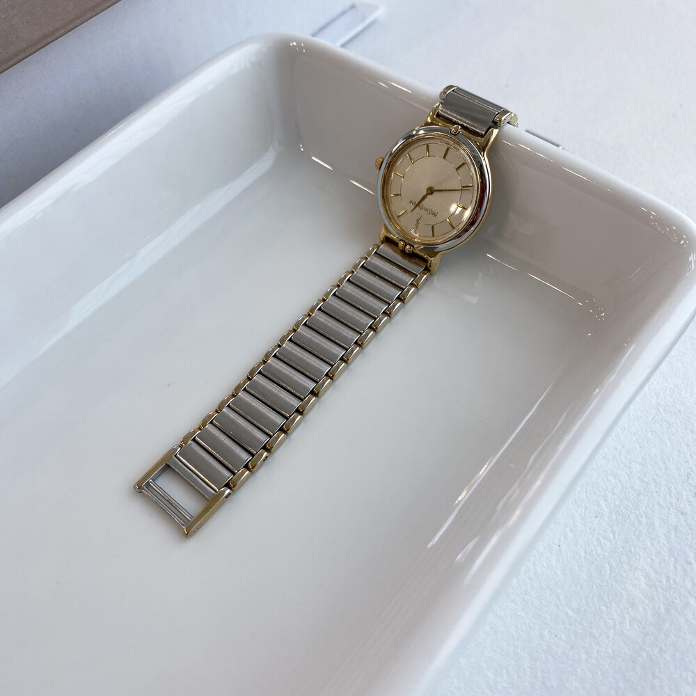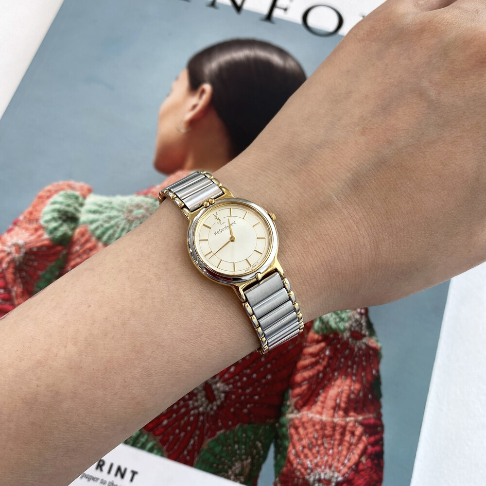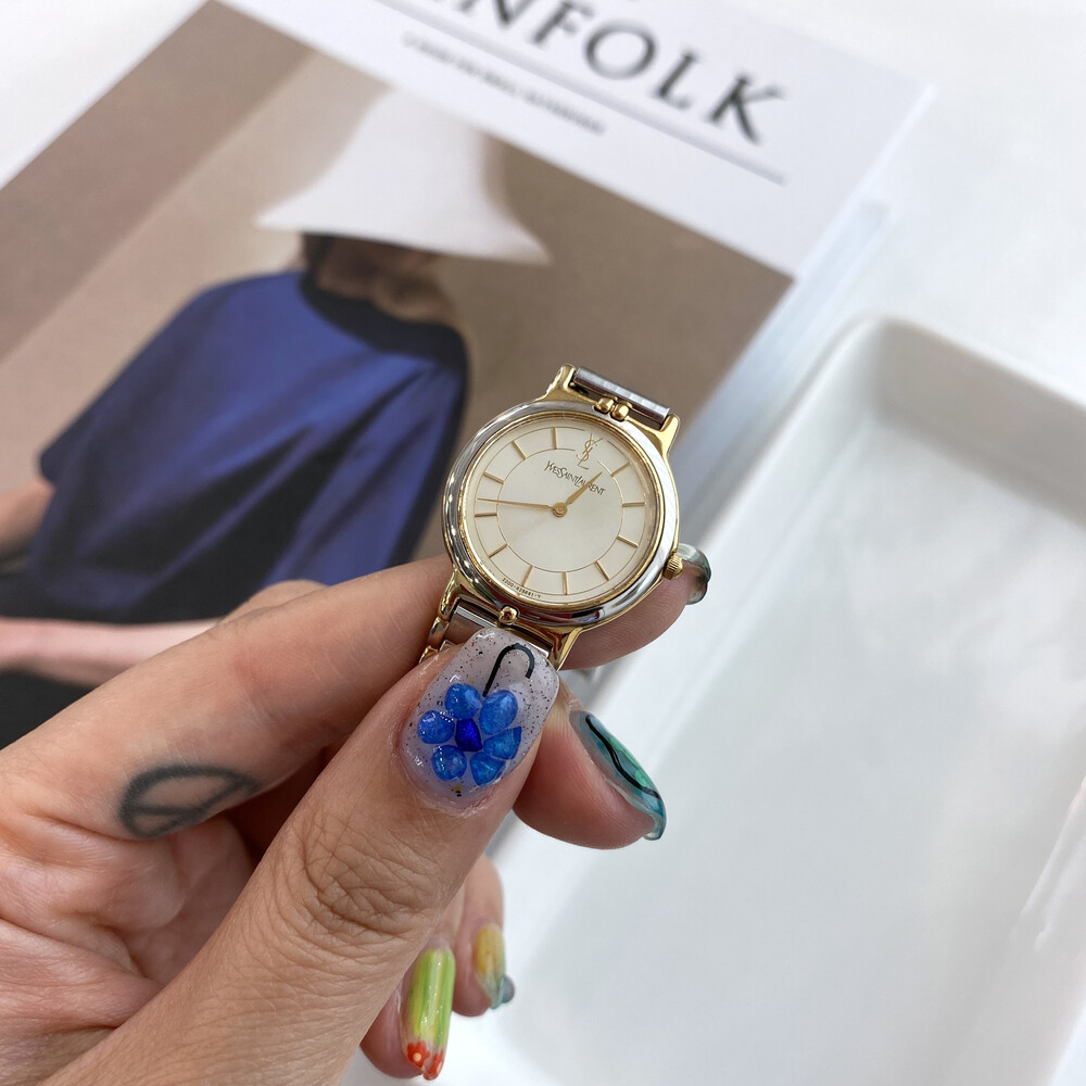 여성용으로 제작된 생로랑 시계이며 쿼츠 무브먼트로 제작되었습니다.