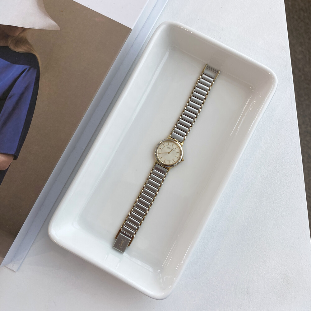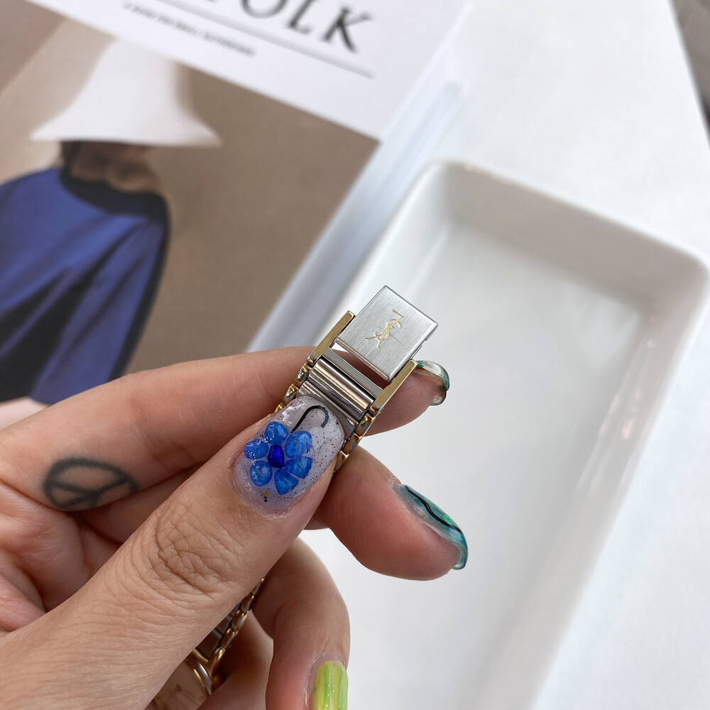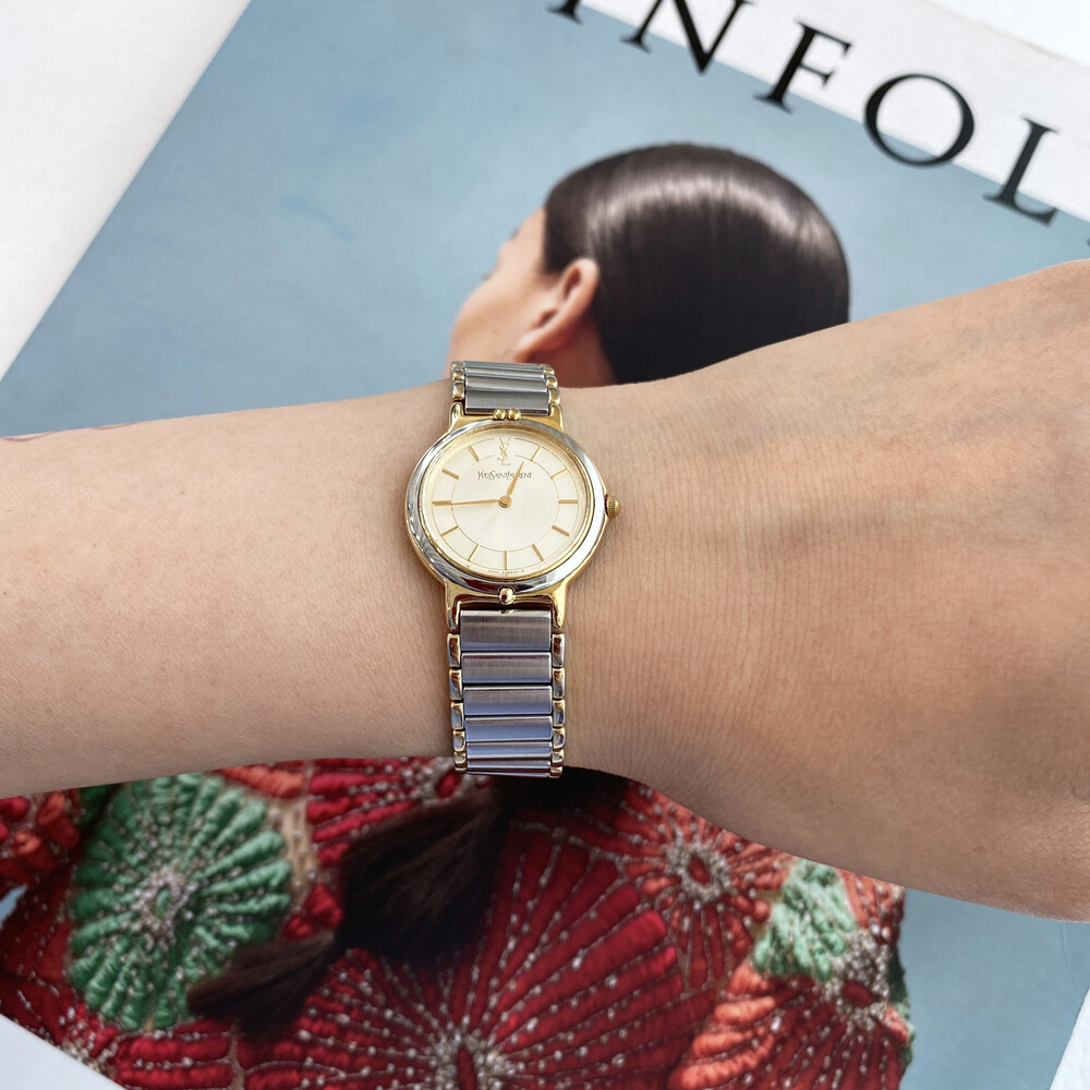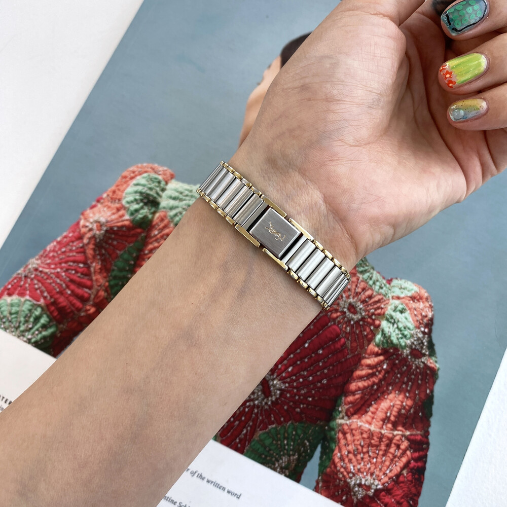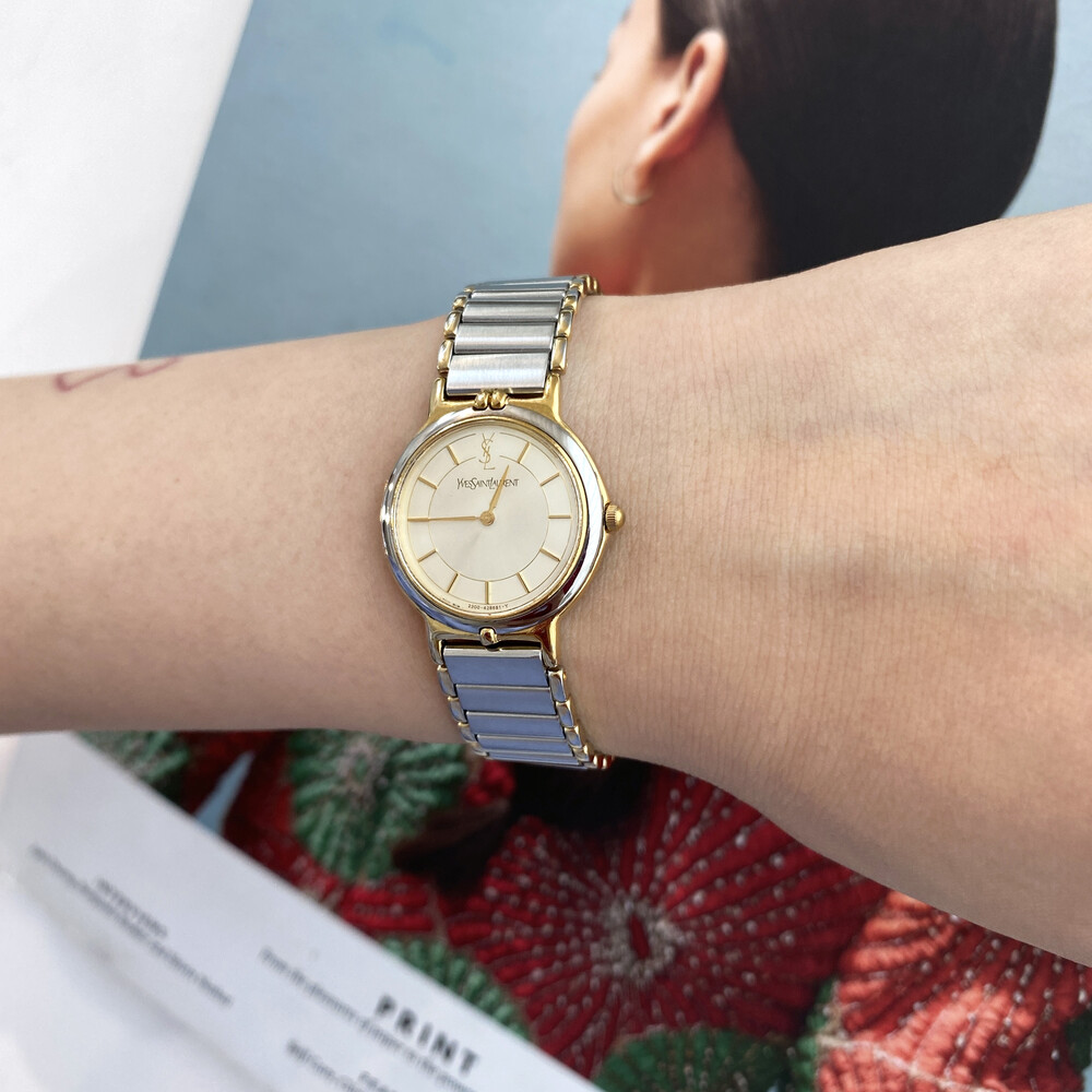 여성용으로 제작된 생로랑 시계이며 쿼츠 무브먼트로 제작되었습니다.