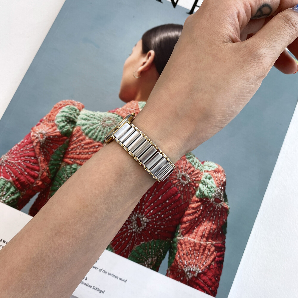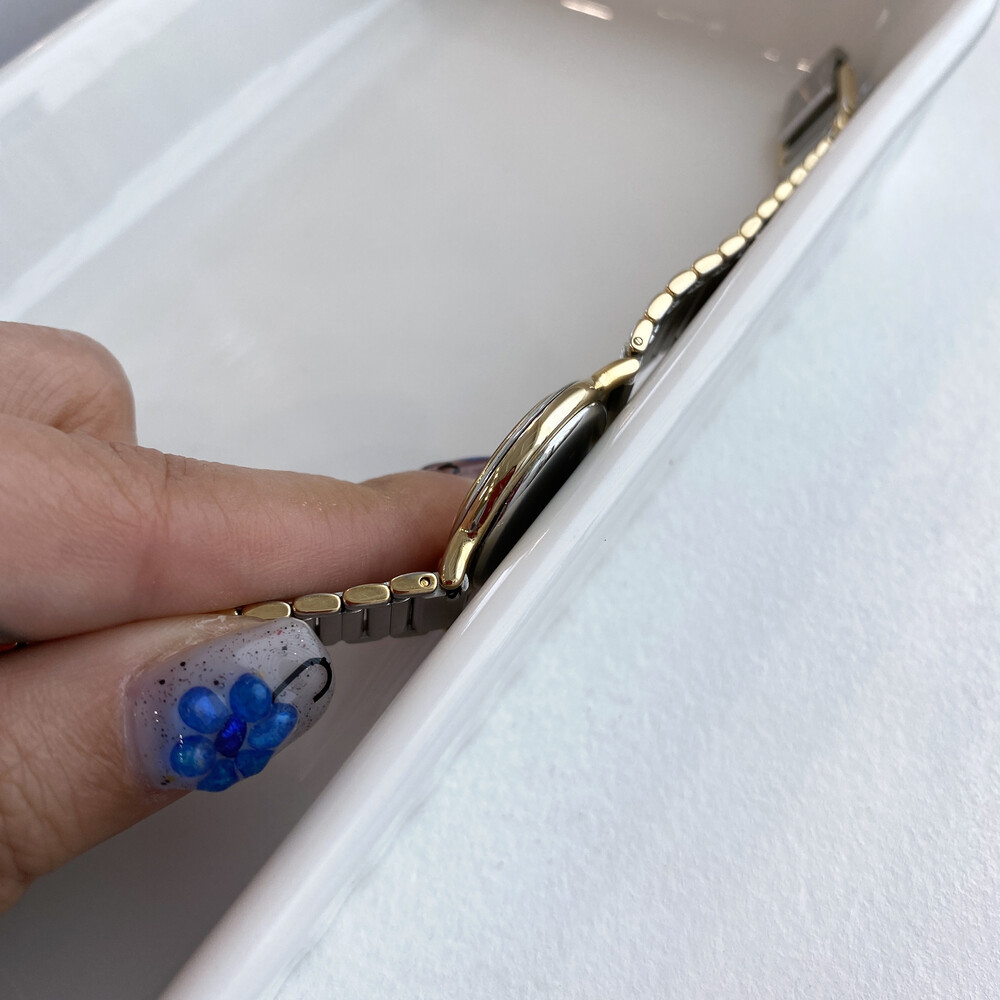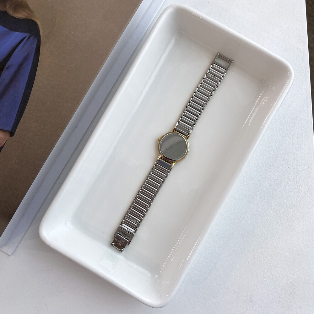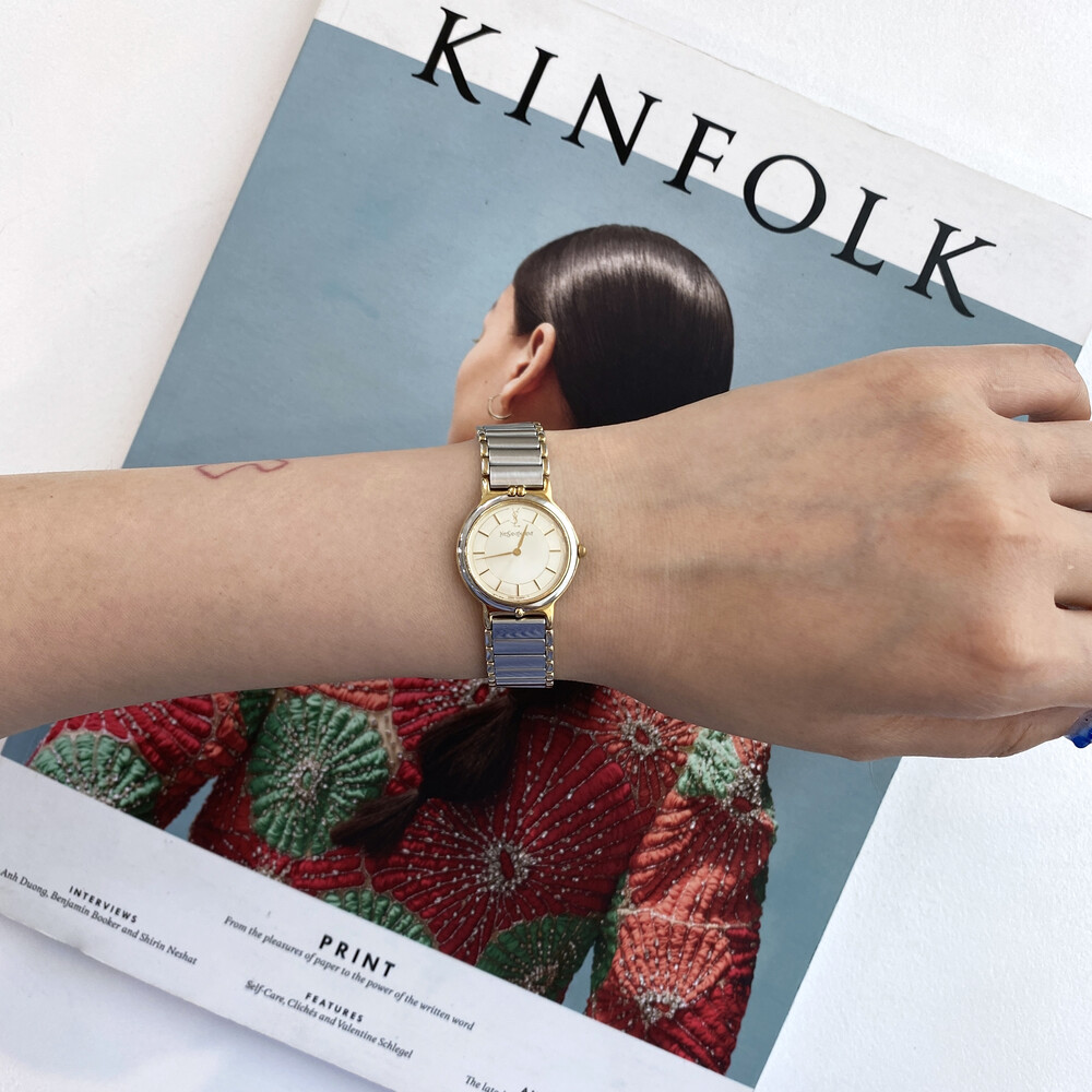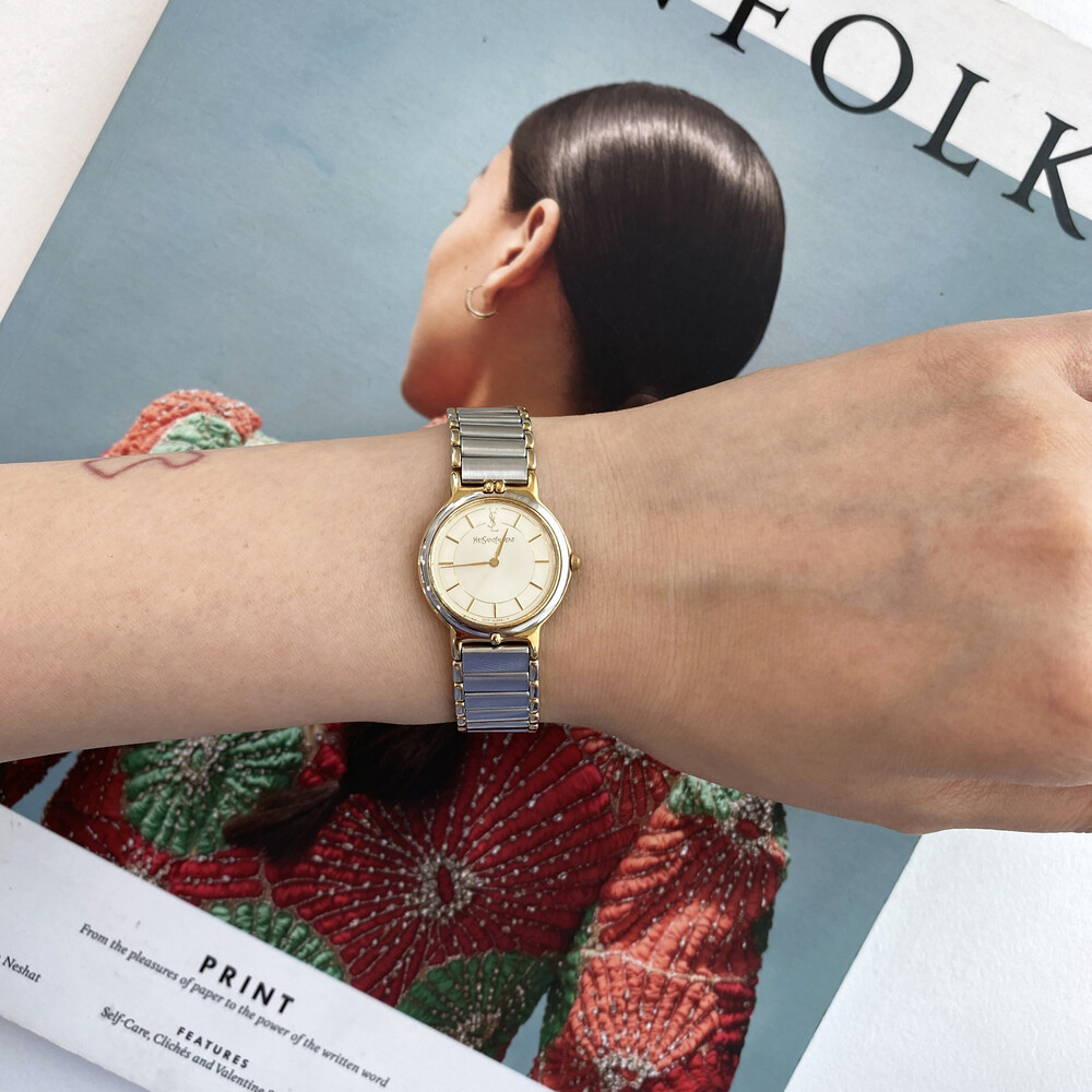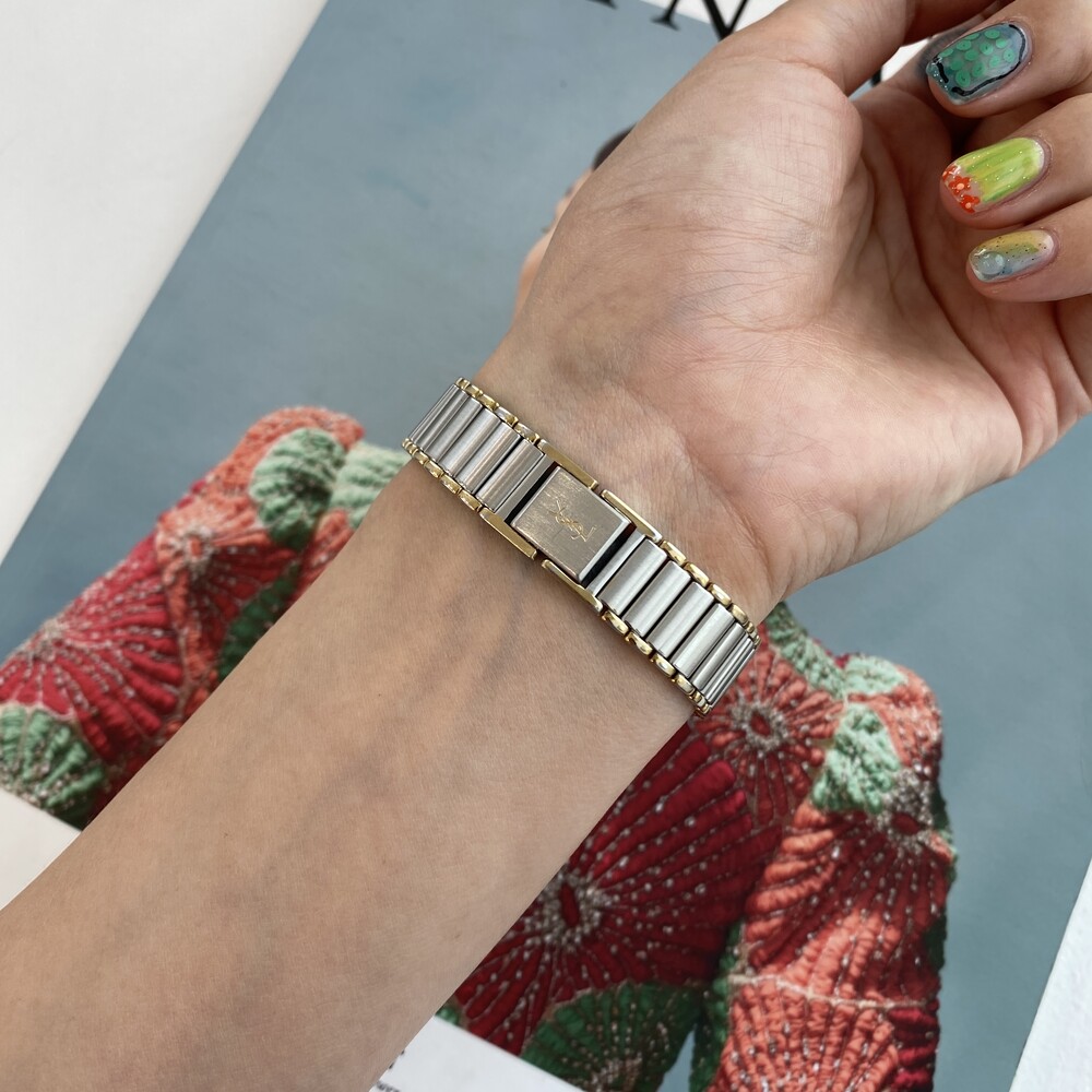 여성용으로 제작된 생로랑 시계이며 쿼츠 무브먼트로 제작되었습니다.