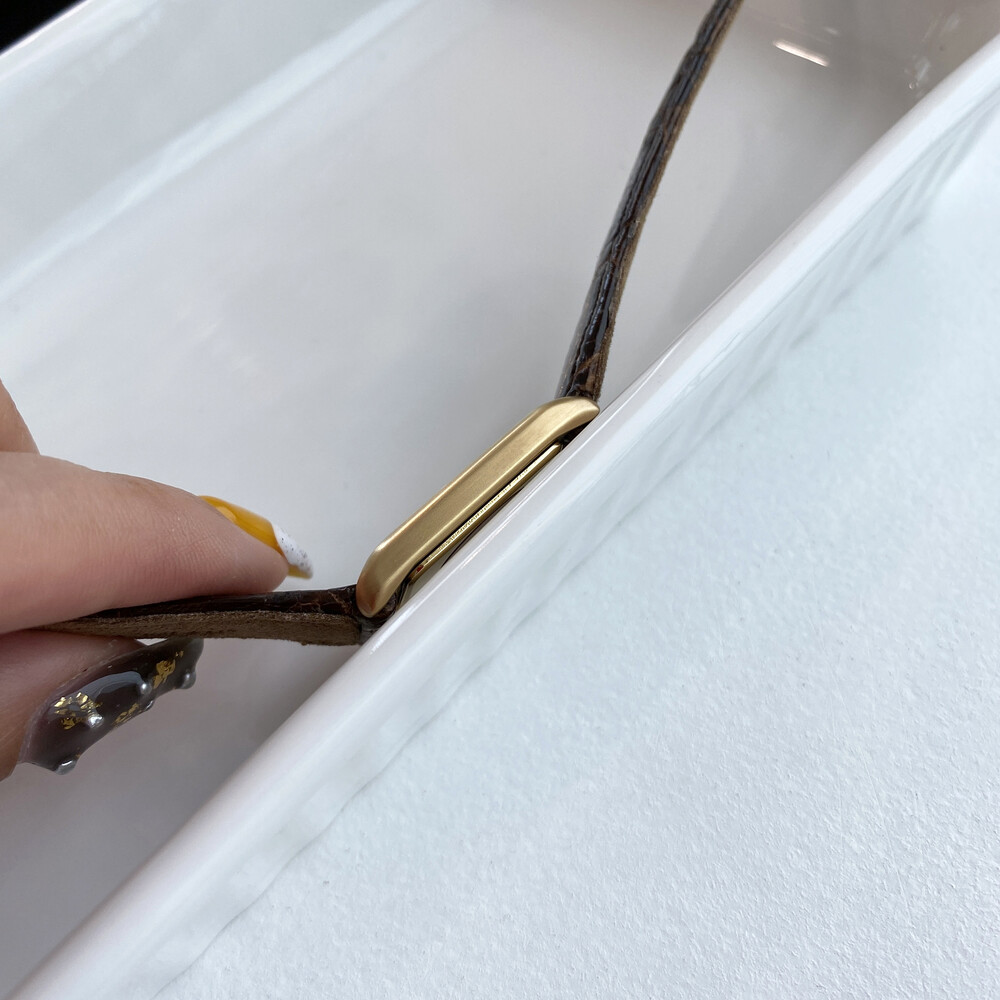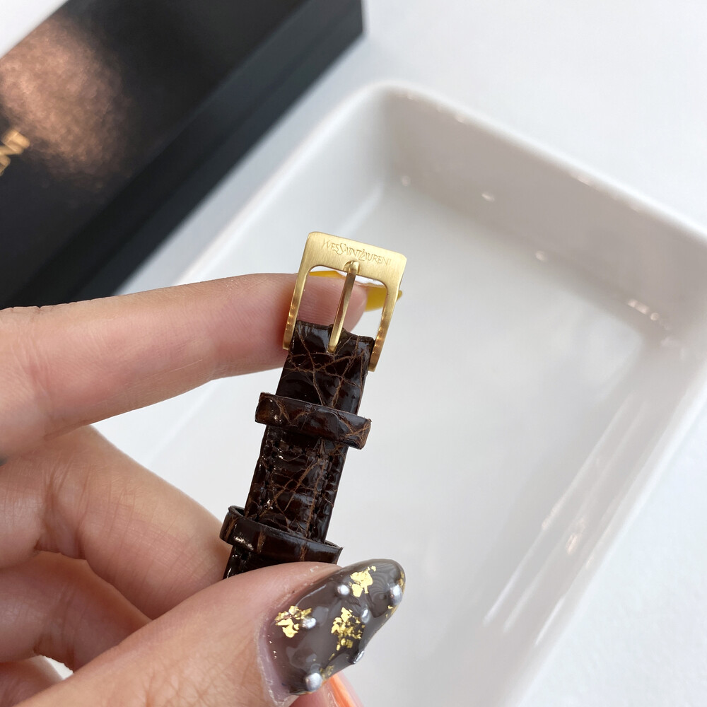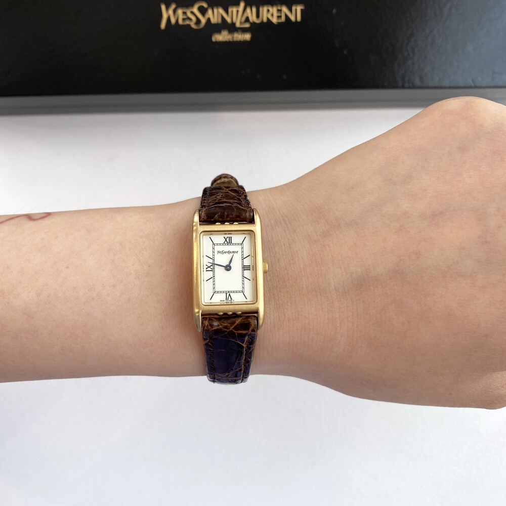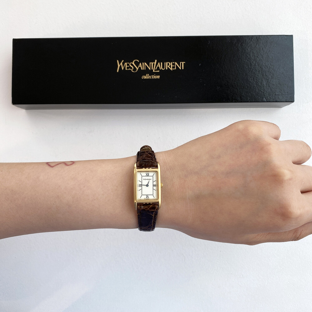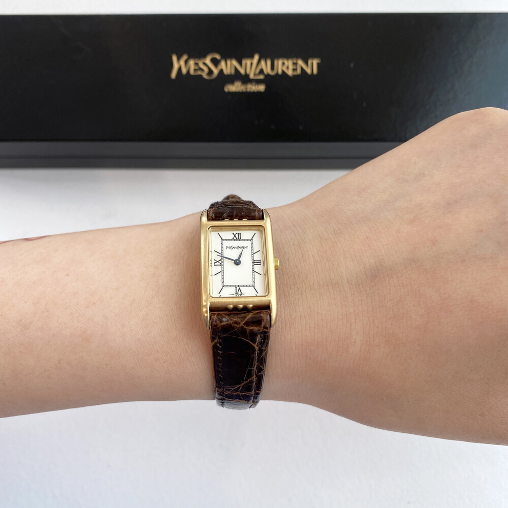 부드러운 골드톤 케이스와 화이트 다이얼 위를 장식하는 생로랑 로고가